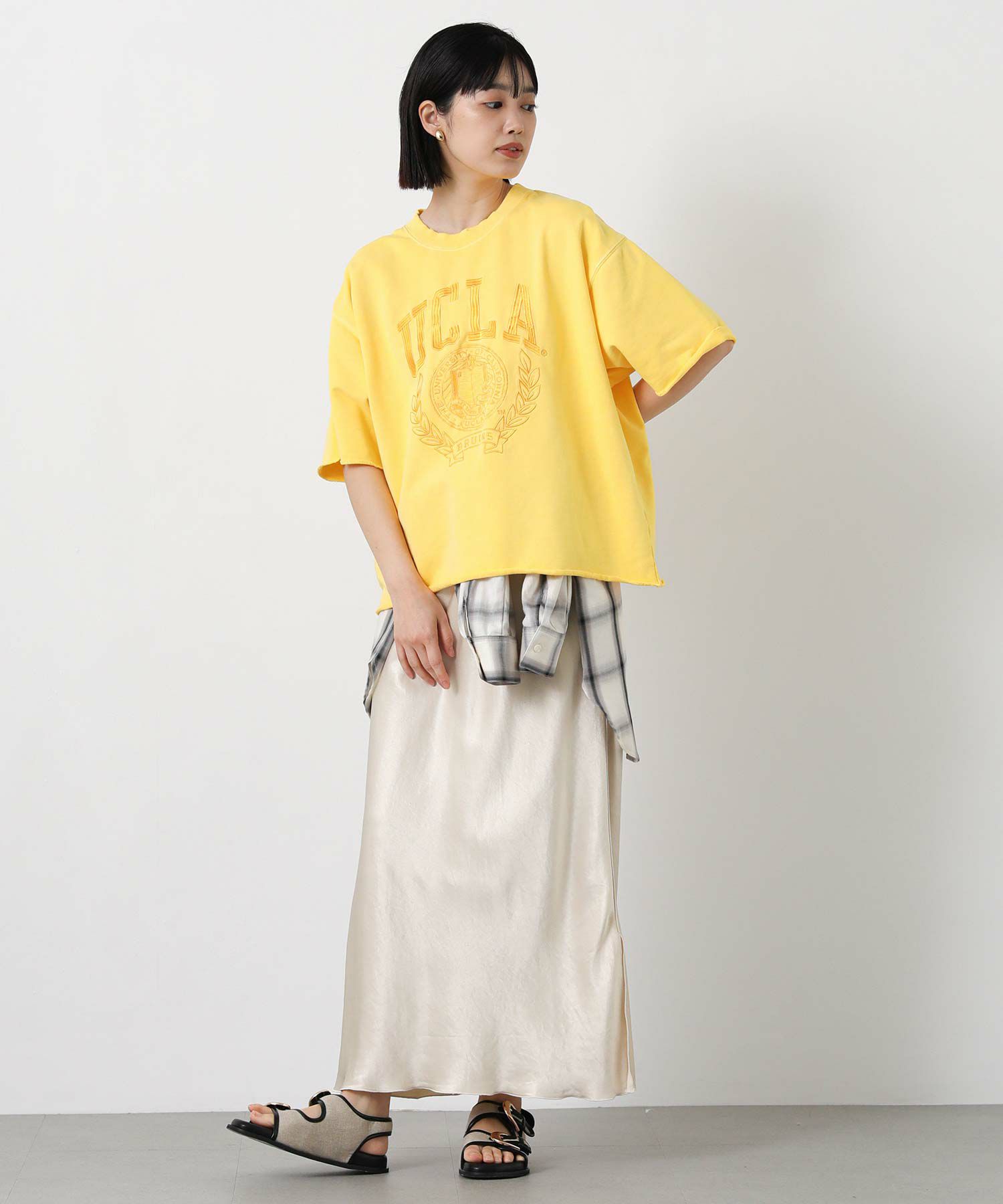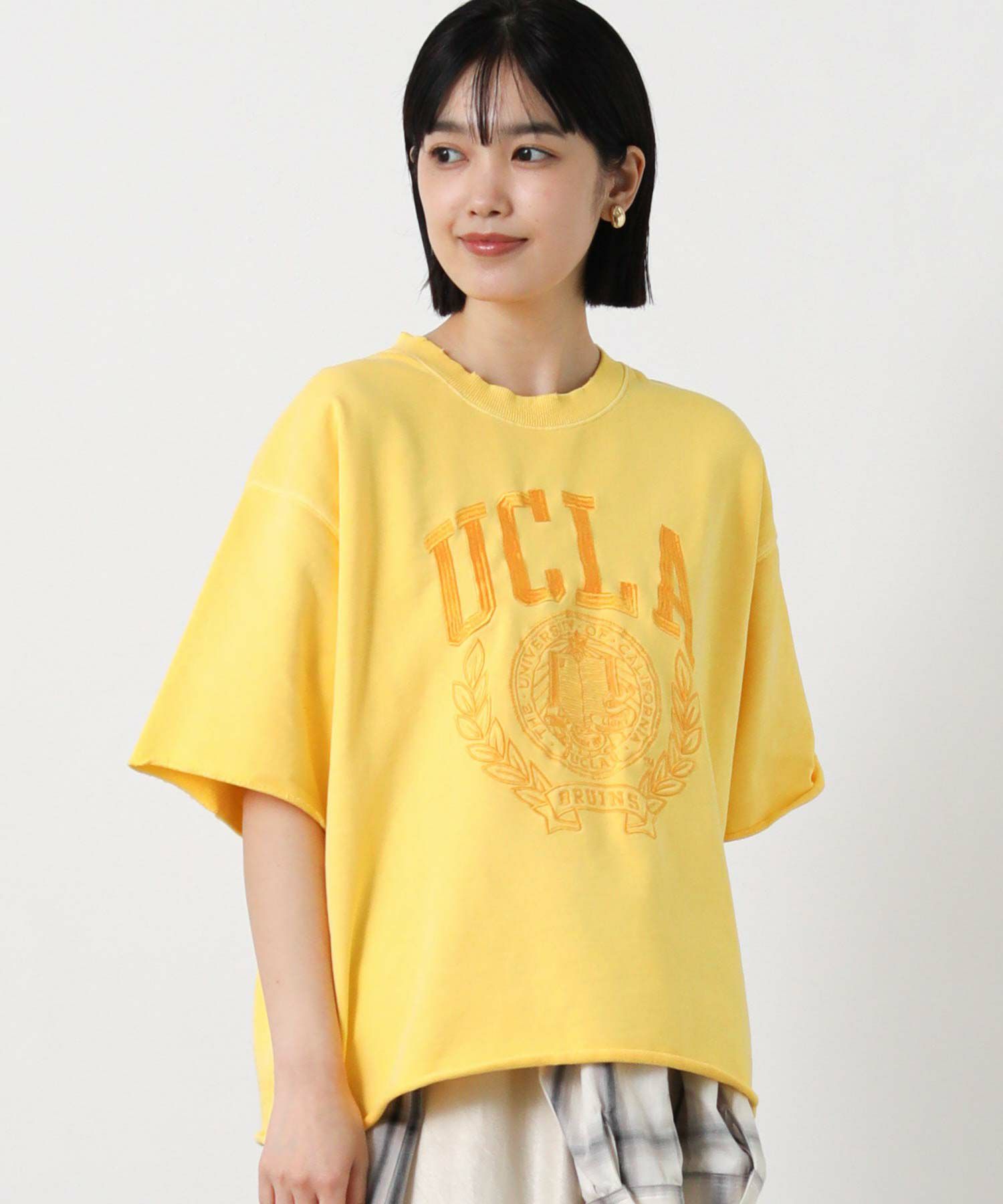 1919年に設立されたUCLA(カリフォルニア州立大学ロサンゼルス校)の定番のカレッジロゴを刺繍し、その後にピグメント染めをして、リメイク古着のように仕上がっています。