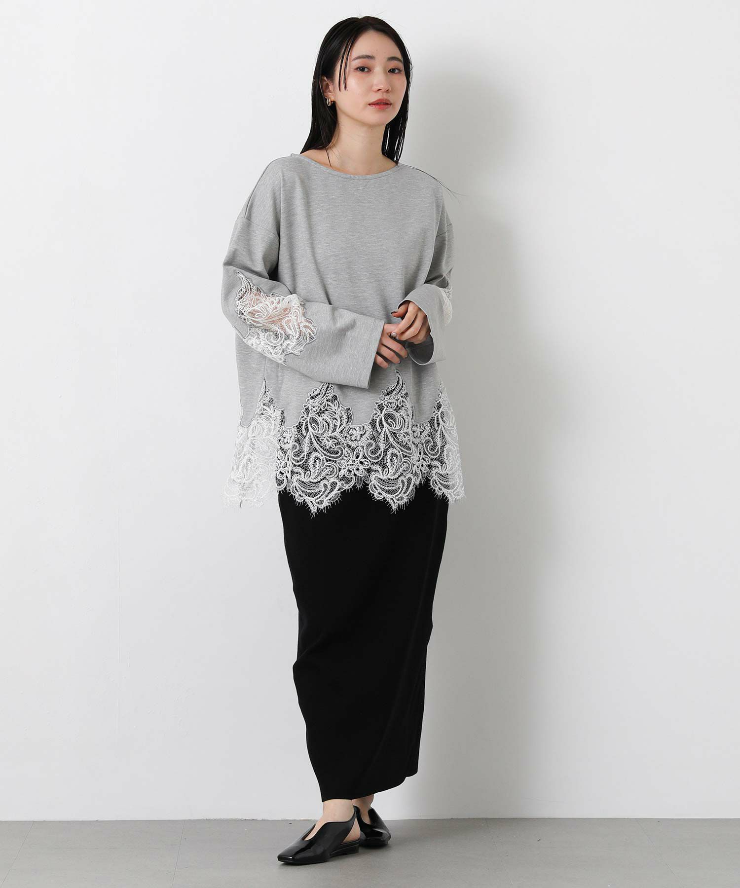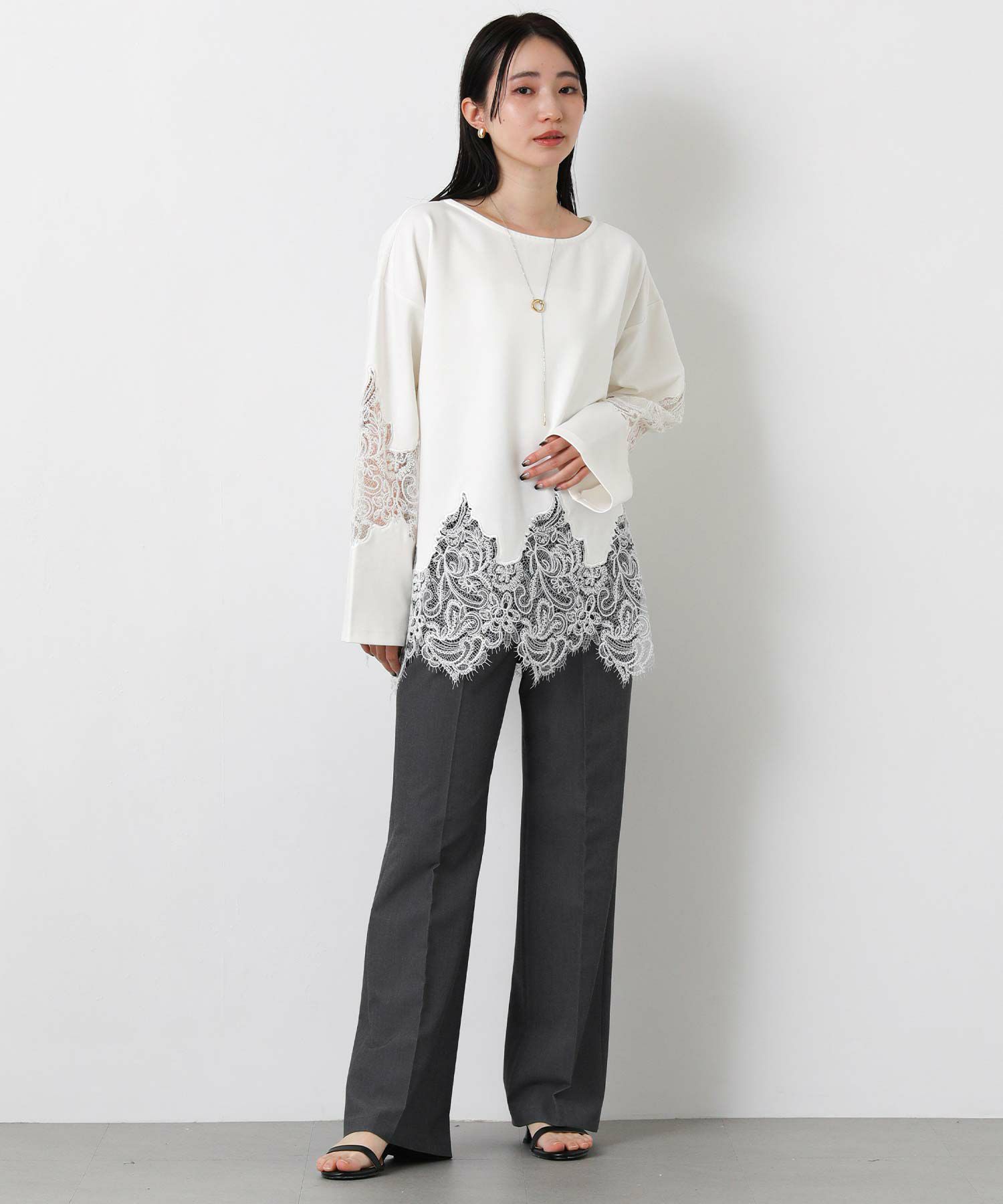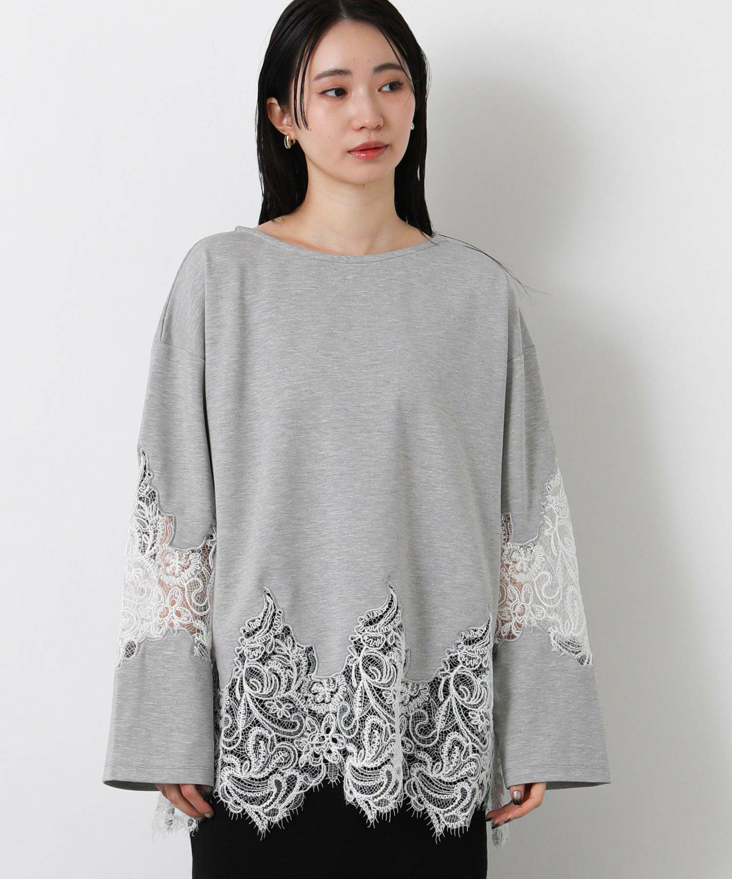 スカラップレースが上品で軽やかな印象に、ボートネックで大人っぽさを演出。