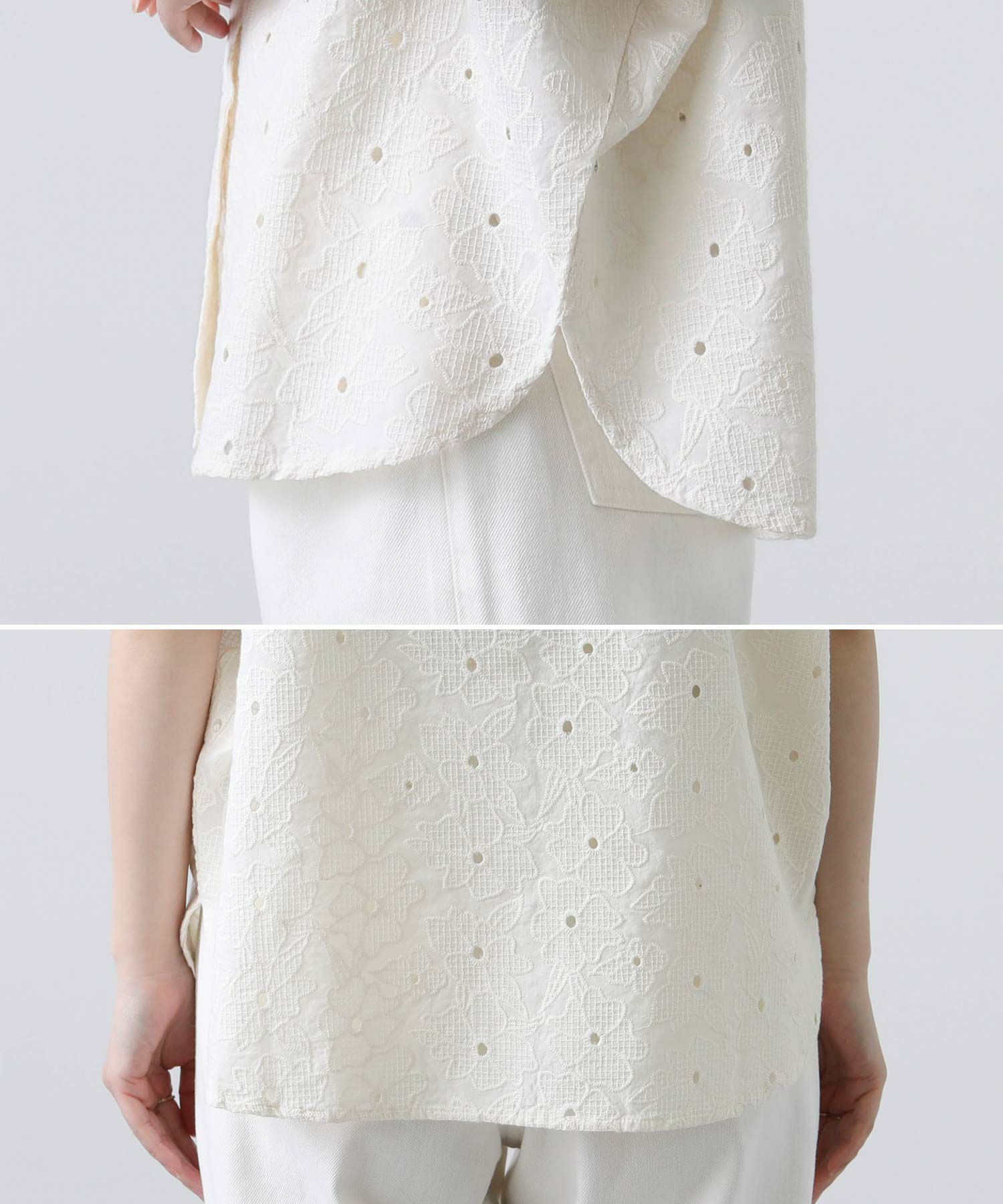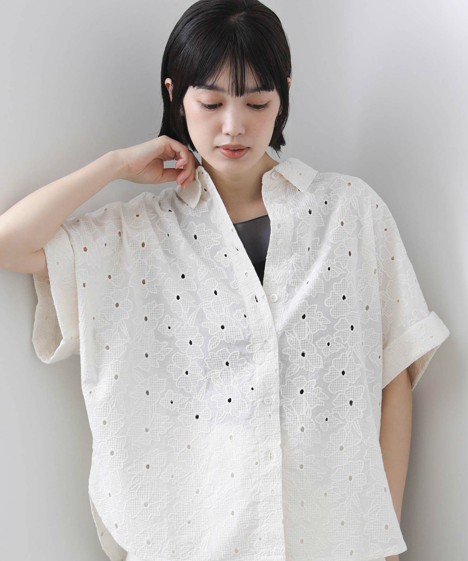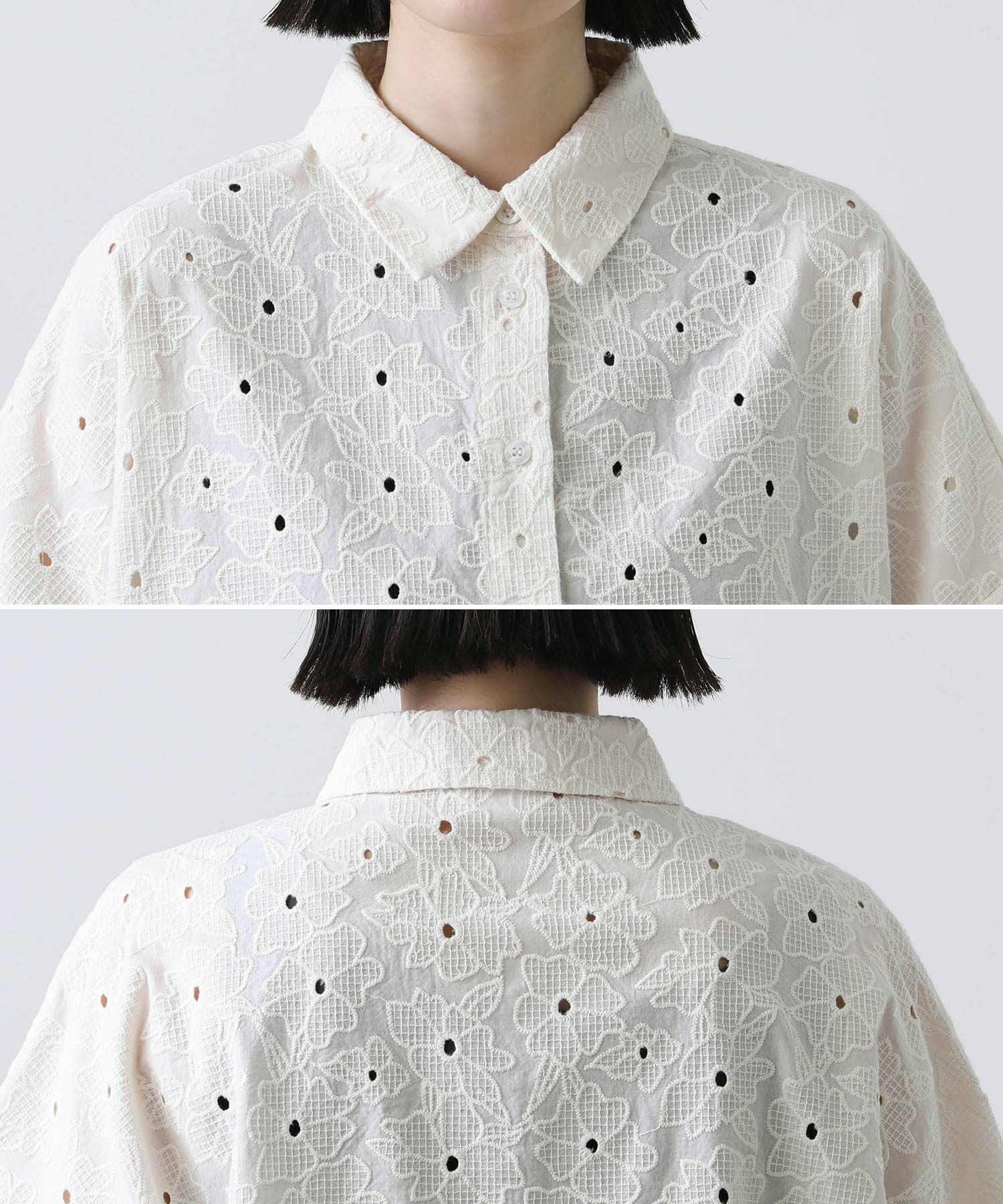 レースの甘さとすっきりとした衿元とのバランス感が絶妙。