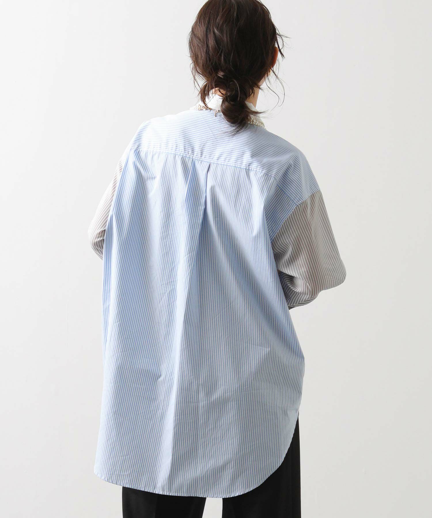 前身頃と衿は色違いのプロード、後身頃とカフスはストライブ、袖はシアーストライプと3種類の素材を使い分けたデザイン。