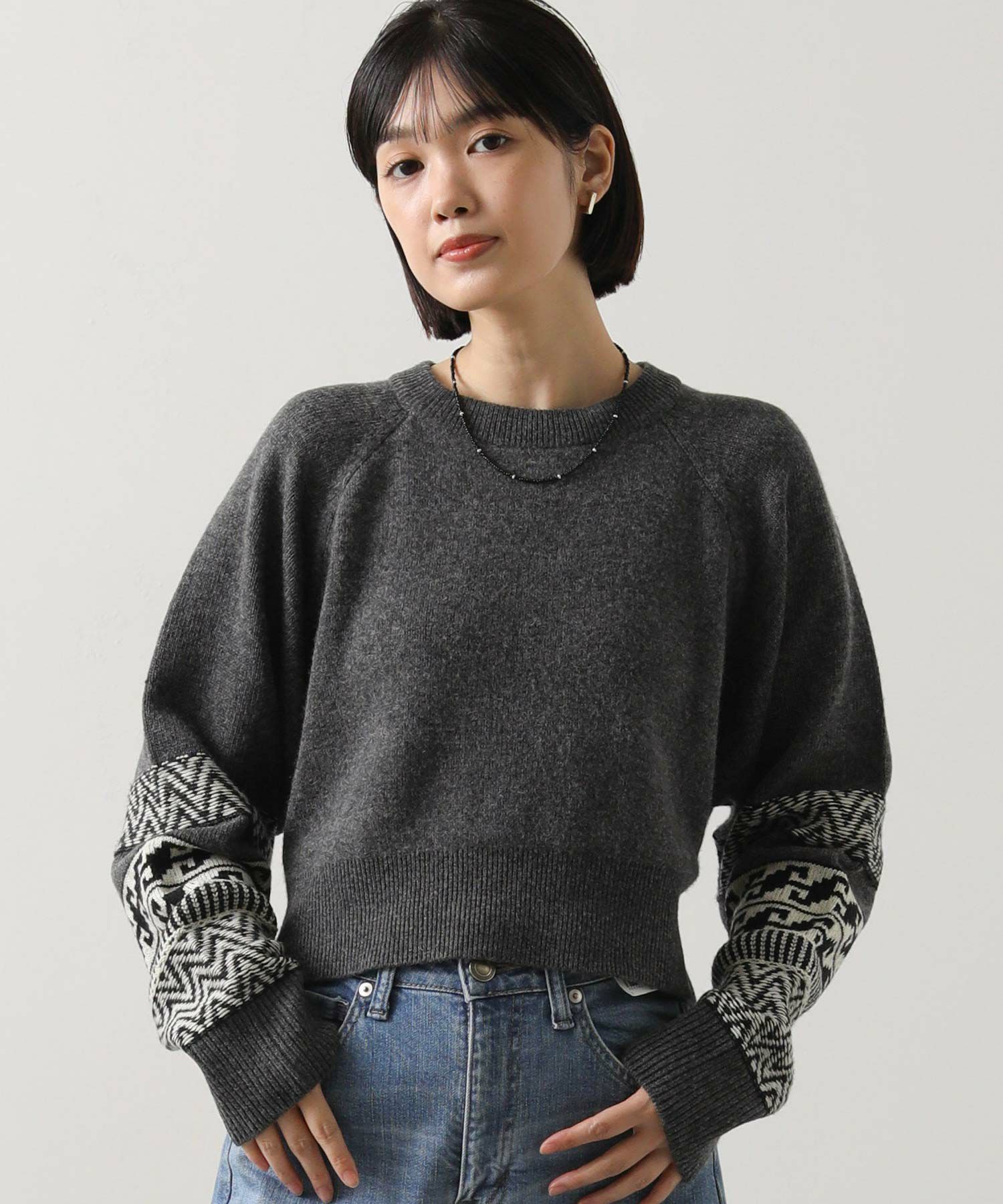 袖口側に配したノルディック柄は、ノスタルジックな印象になり過ぎないバランスとシックな配色でこなしているのがポイント。