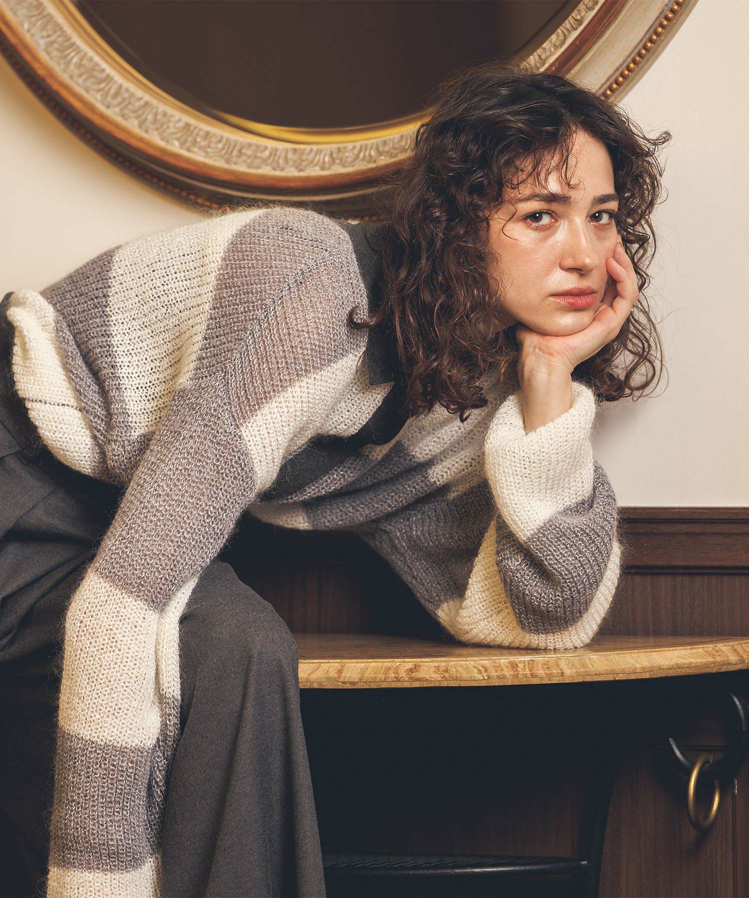 程よく毛足があり柔らかさと温かみのあるモヘアと、ハリ感と軽さのあるテープヤーンを組み合わせて、風合いの良さを最大限に生かしています。