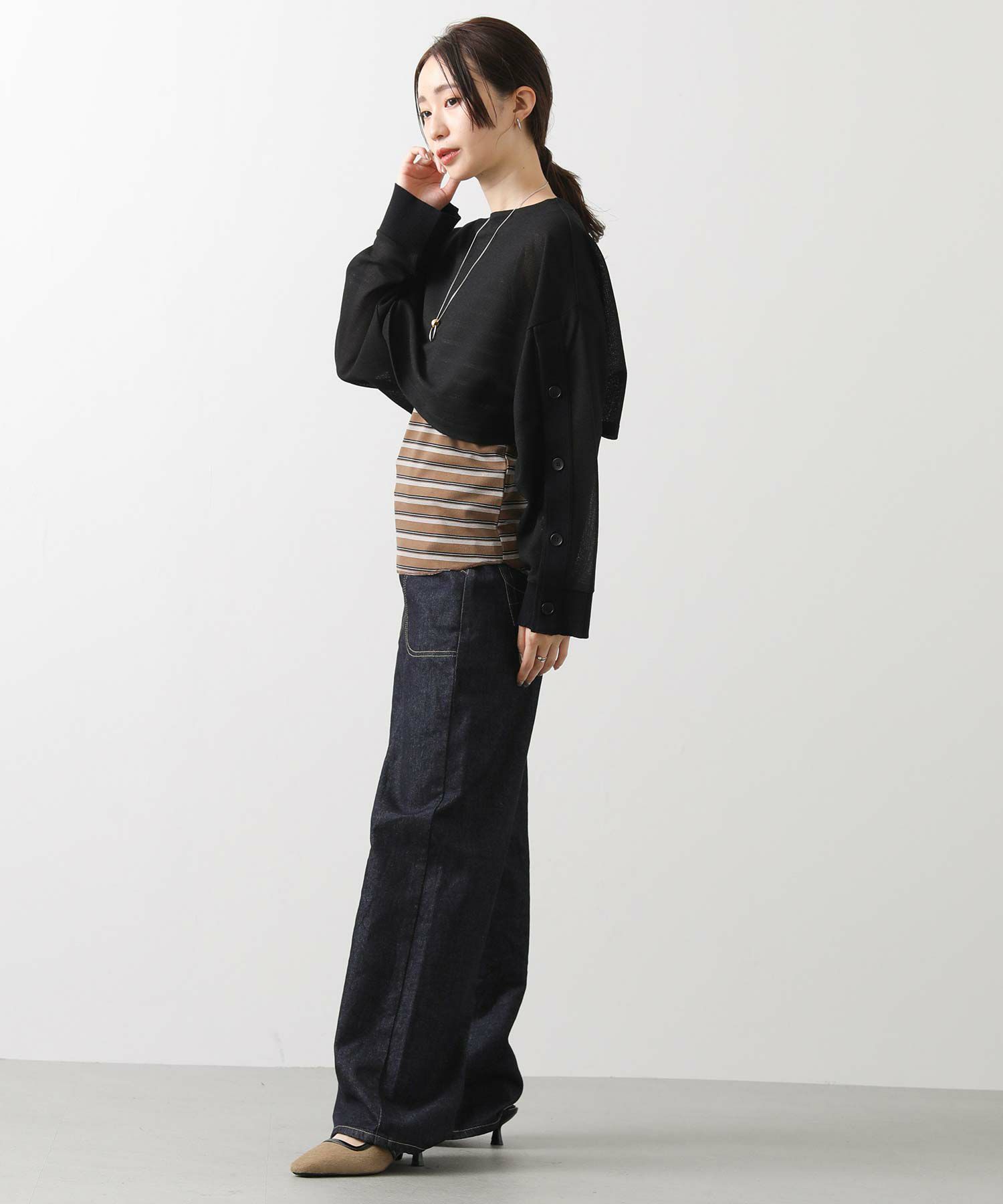 ゆるめのサイズ感ながら、落ち感のある素材なので女性らしいしなやかなシルエットに。