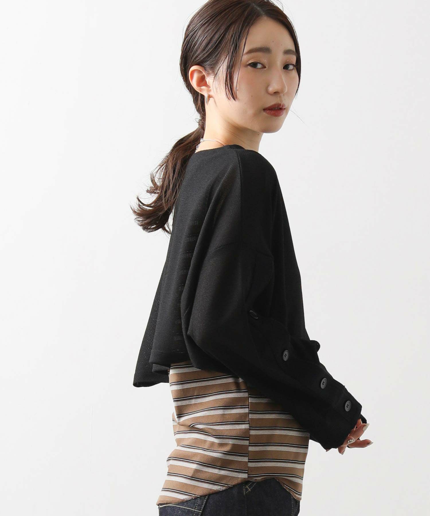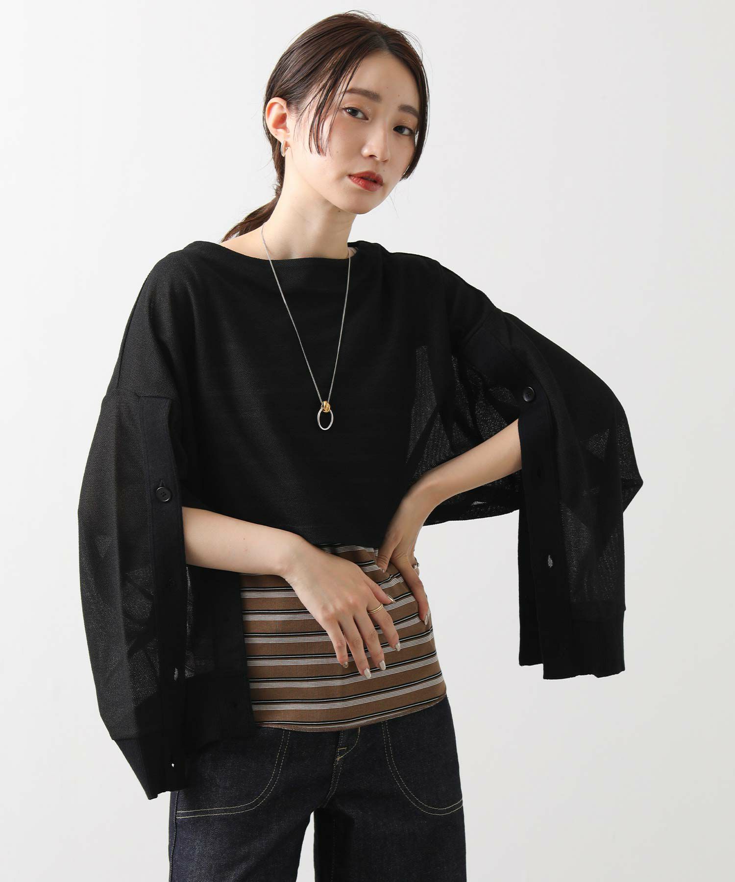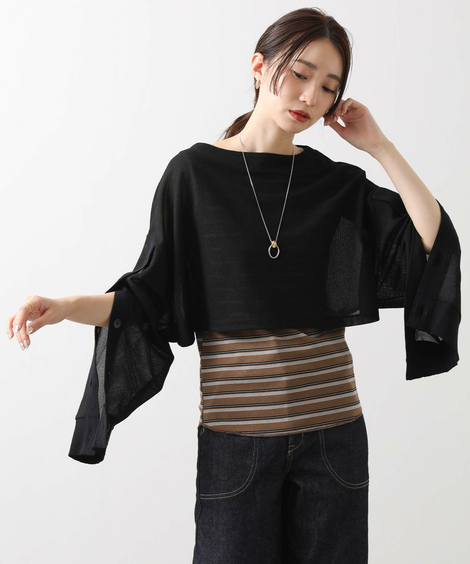 【Munich(ミューニック】から、透け感と清涼感のある素材で作ったレイヤードスタイルが楽しめるショート丈トップスをセレクト。