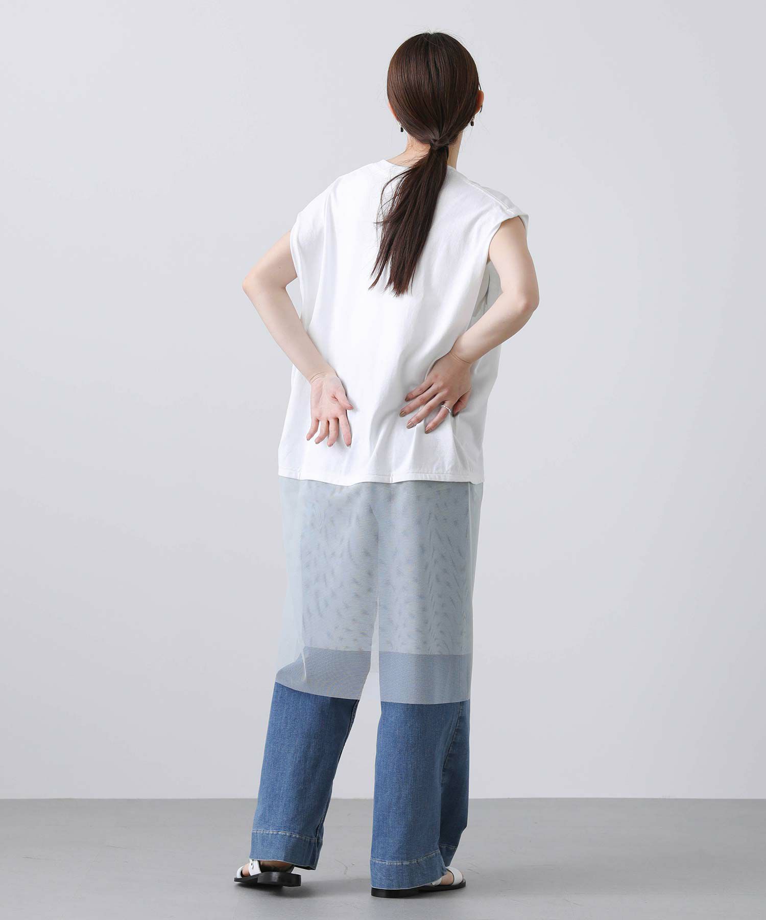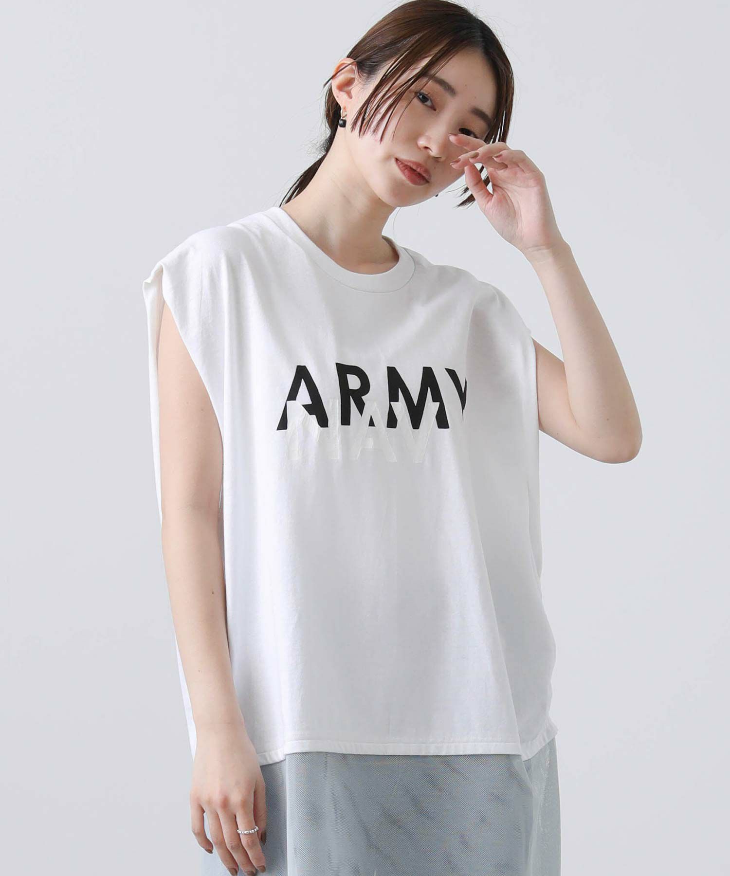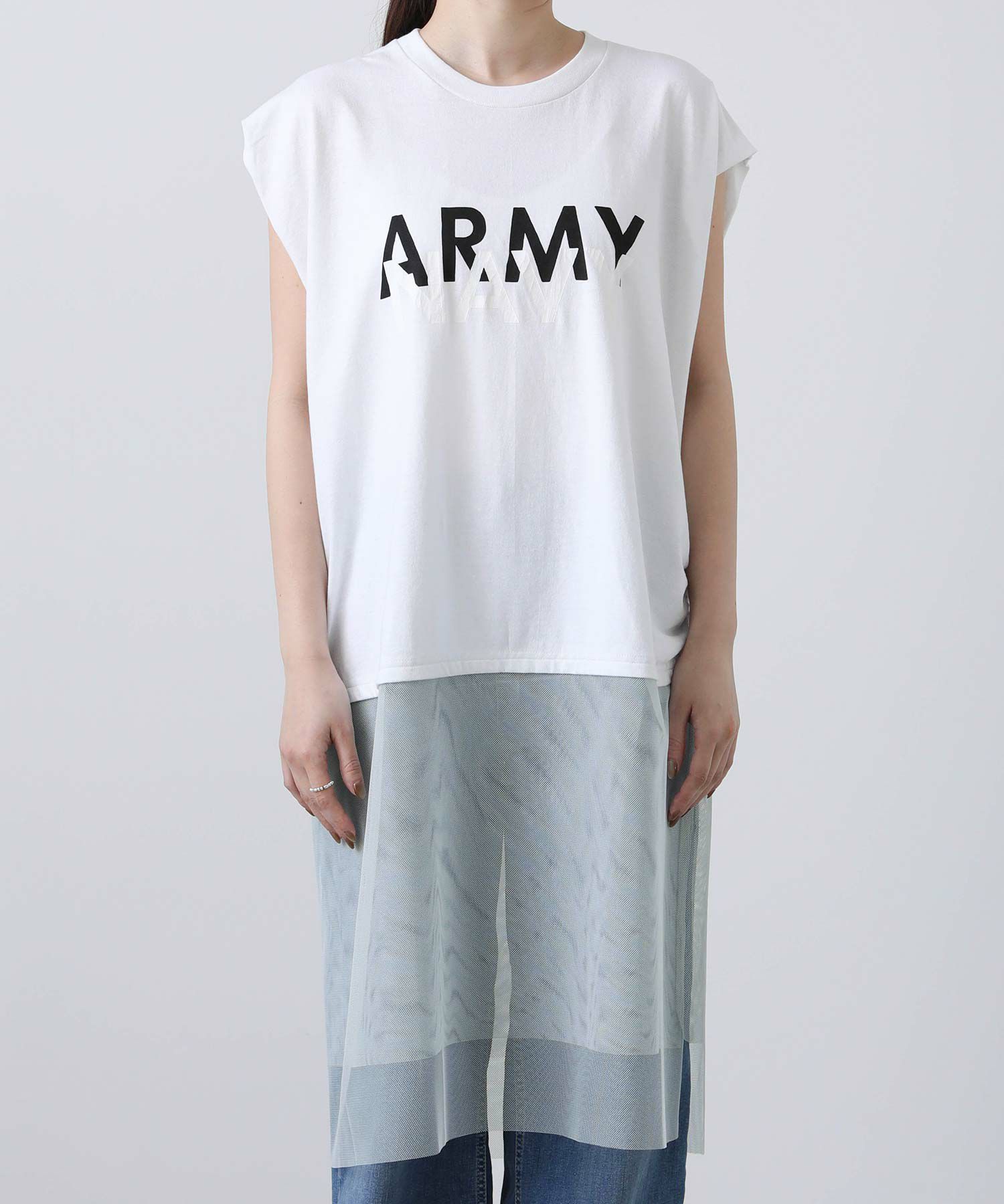 古着のミリタリーTシャツをリメイクするイメージでプリントを施し、袖はカットオフ、裾はチュールをドッキングし脇でギャザーを寄せたデザイン性のあるロゴTシャツ。