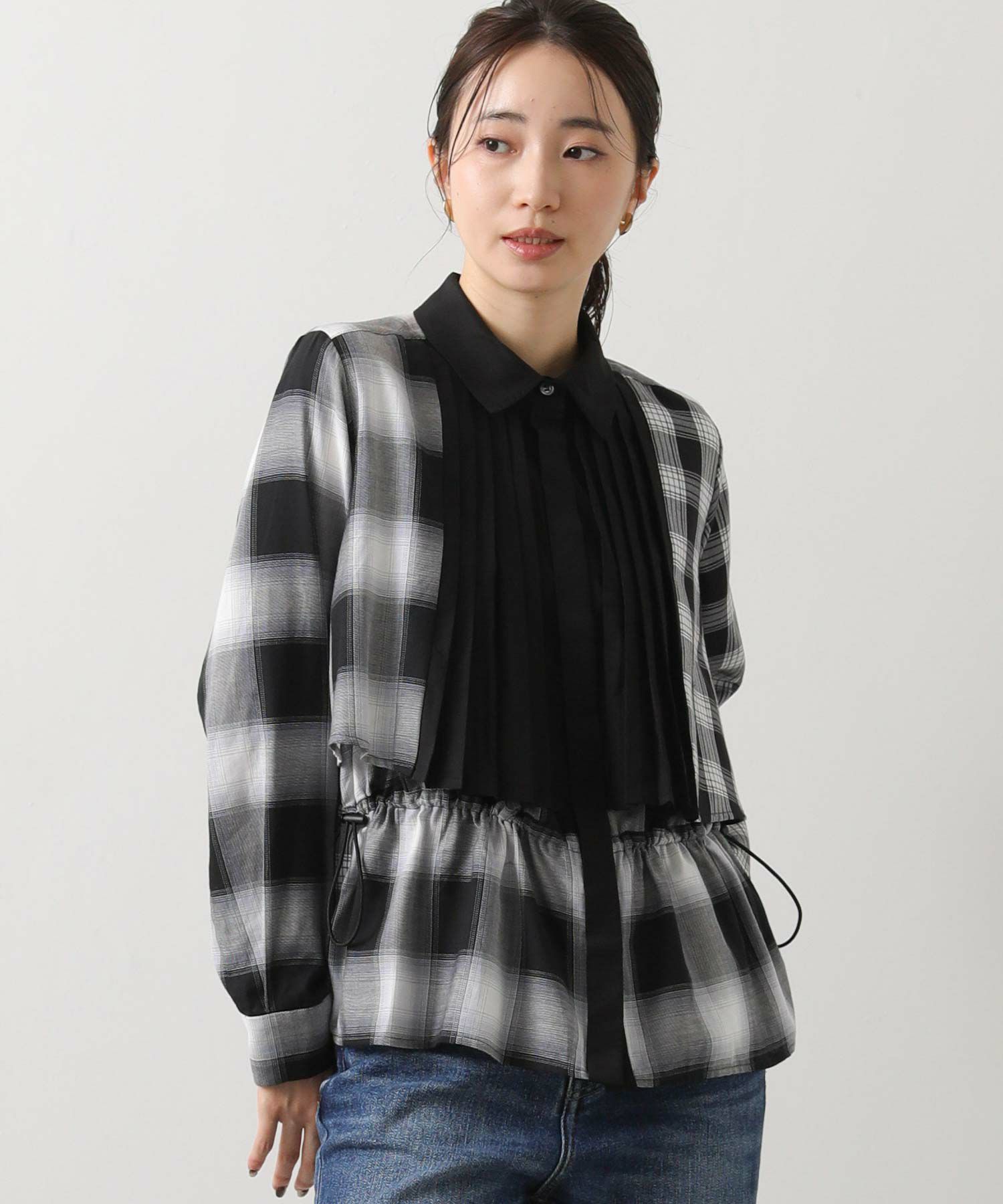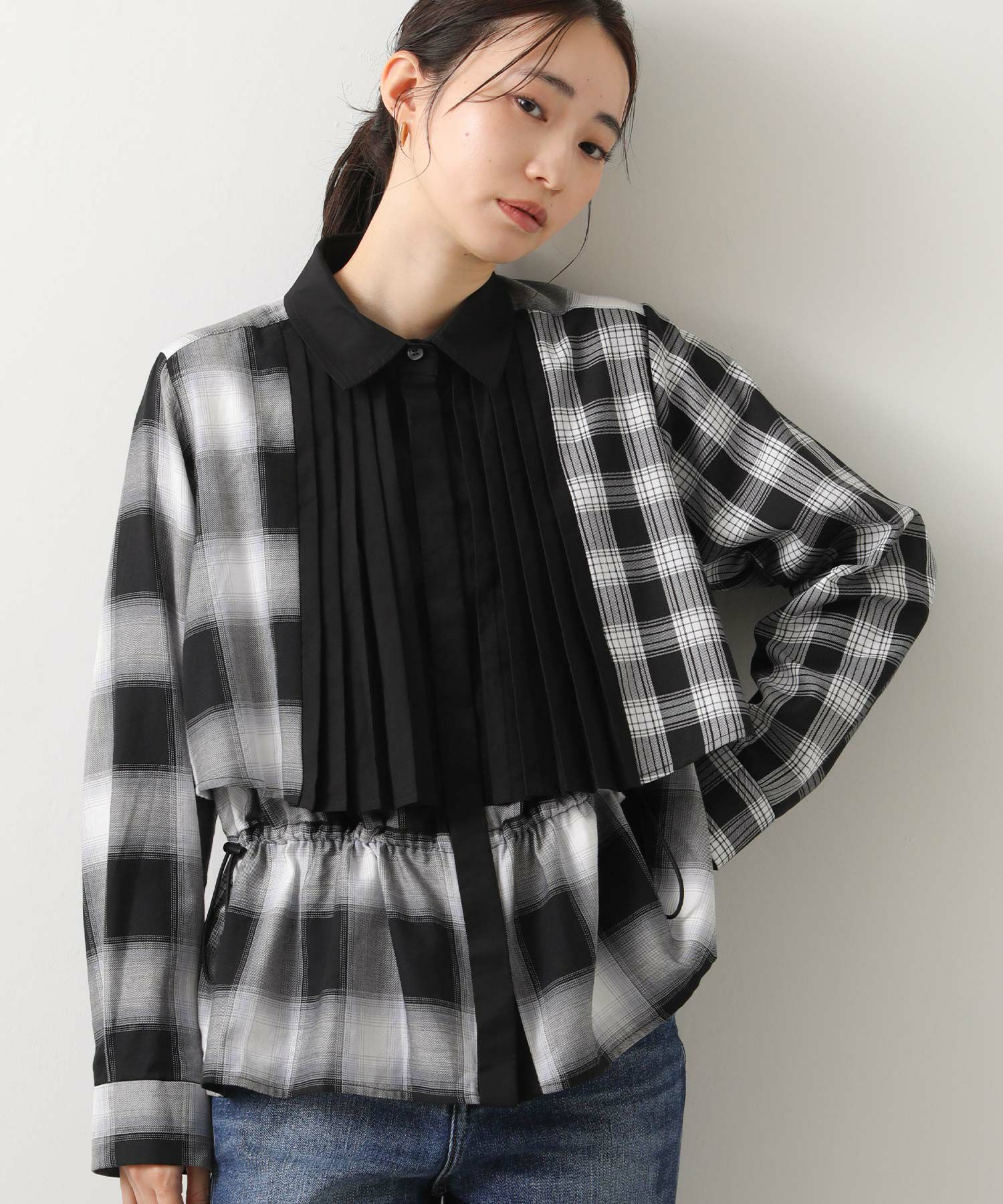 【MARECHALTERRE(マルシャルテル】から、部分的にプリーツを施したチェック×チェックのコンビネーションシャツをセレクト。