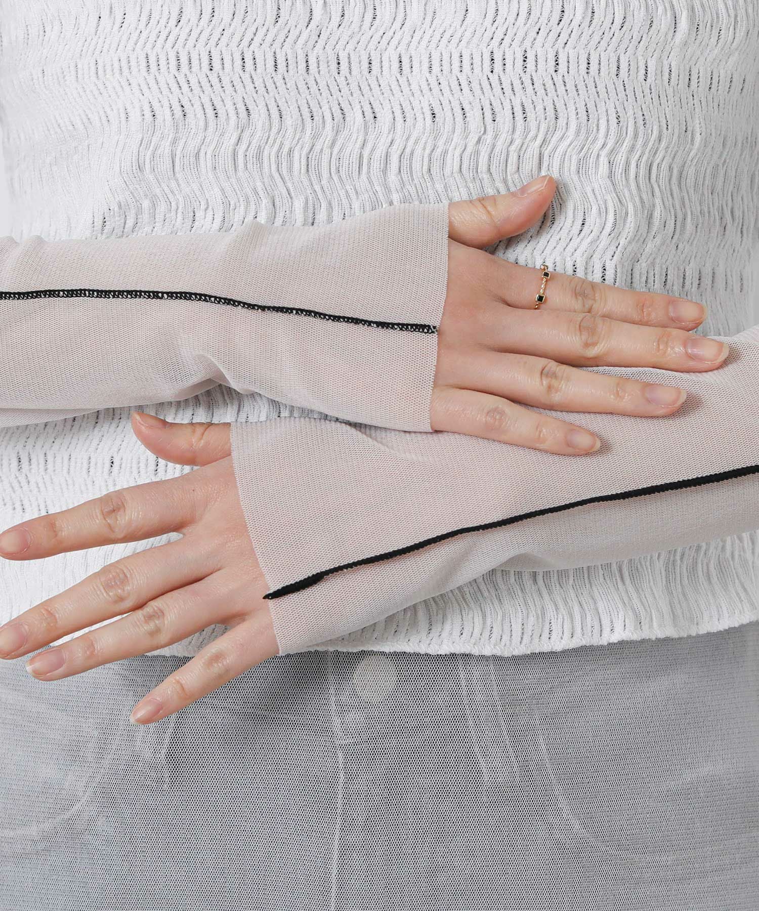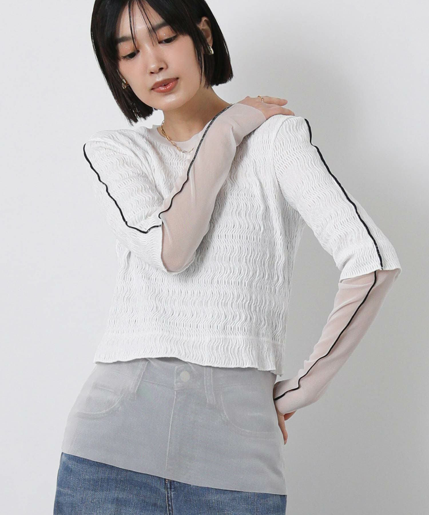 袖とネックライン、裾から覗くチュールが、軽やかで上品な印象に。