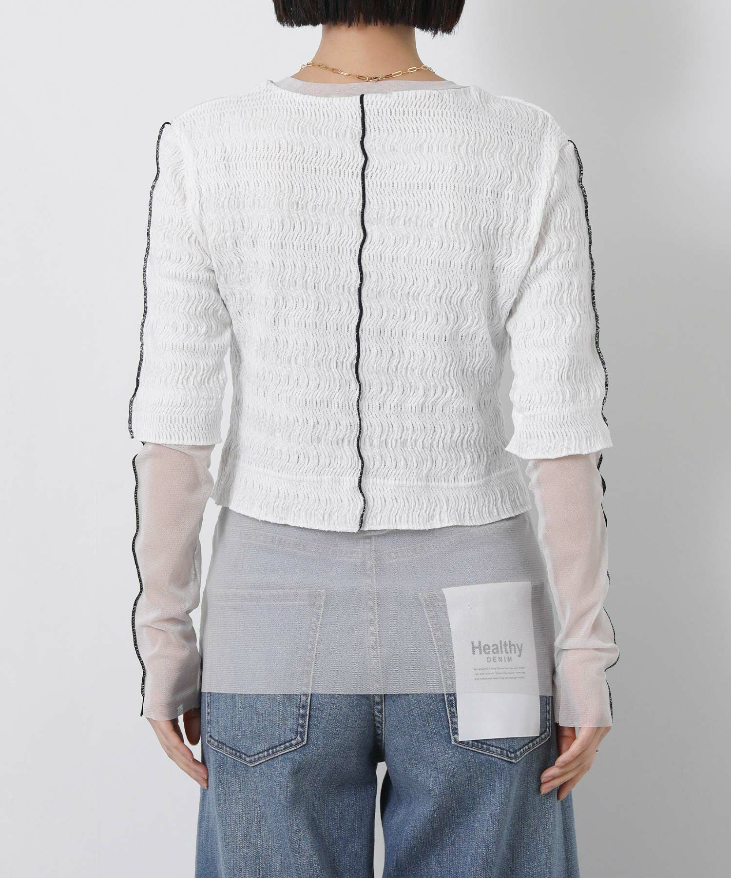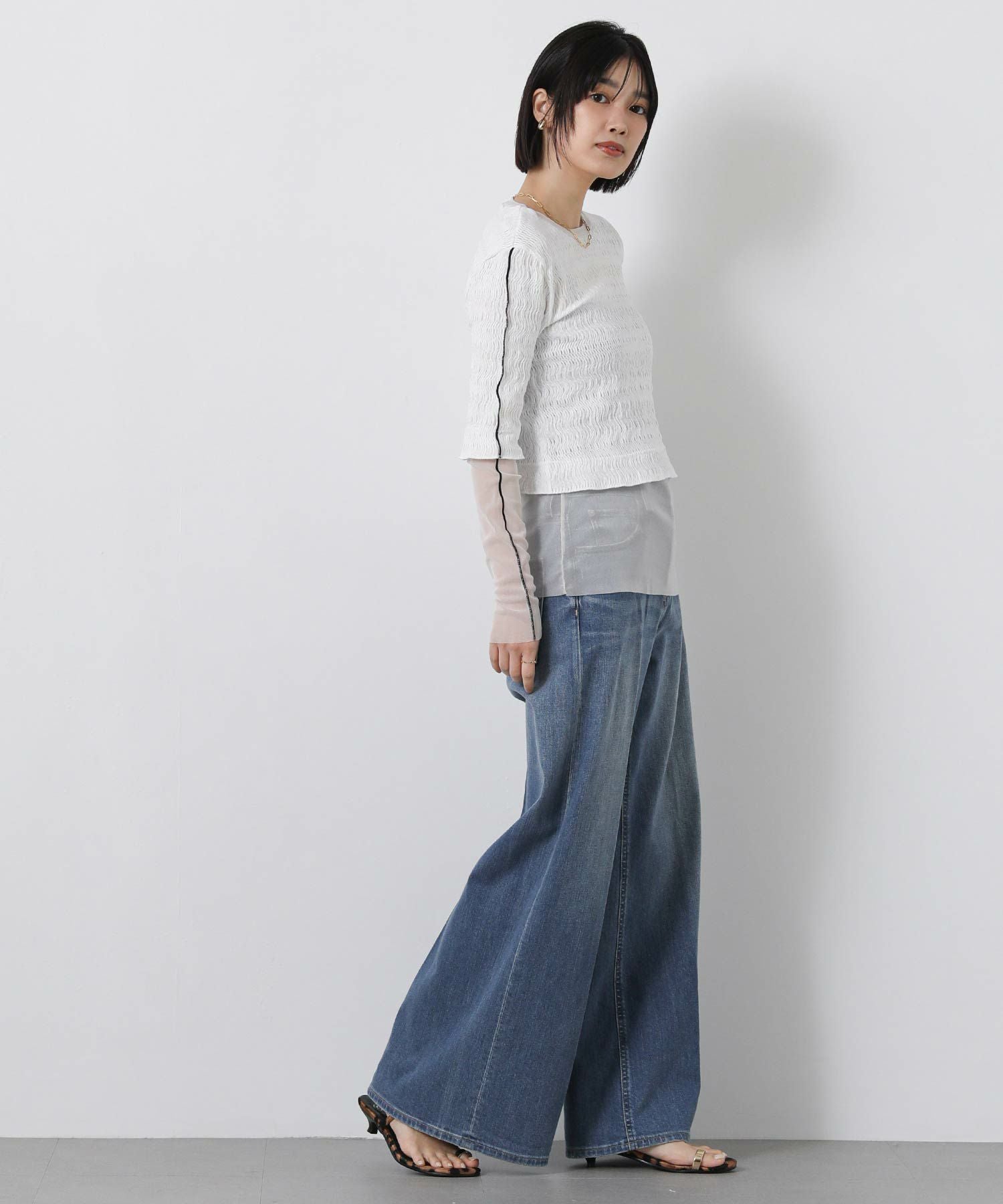 ラッセルレース裾はふらしているため、ボトムインすると短丈のスタイリングも楽しめます。