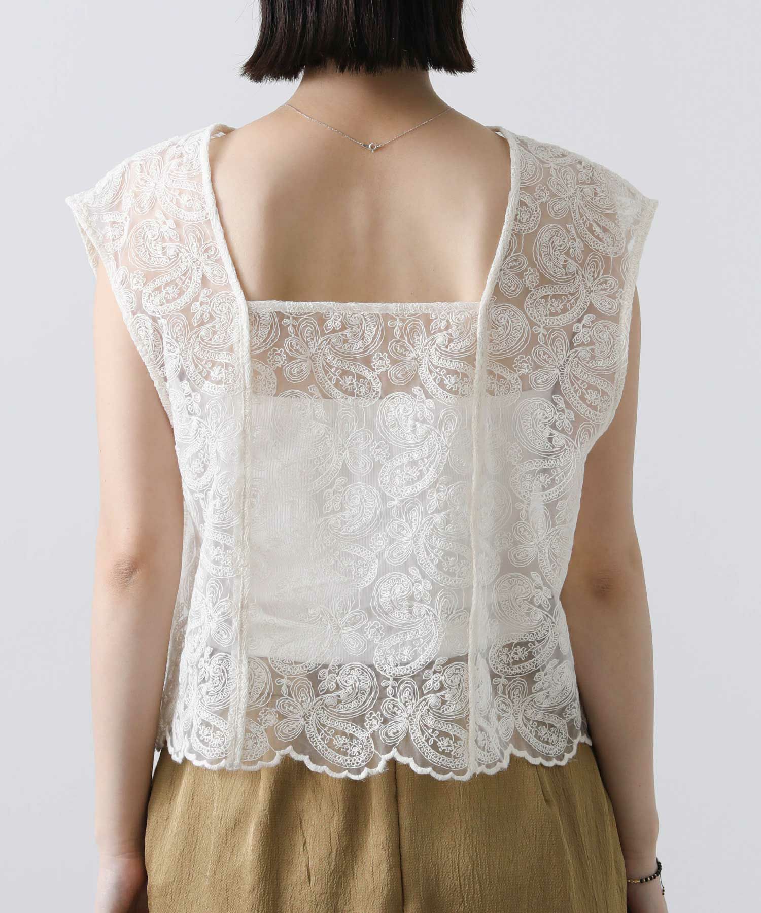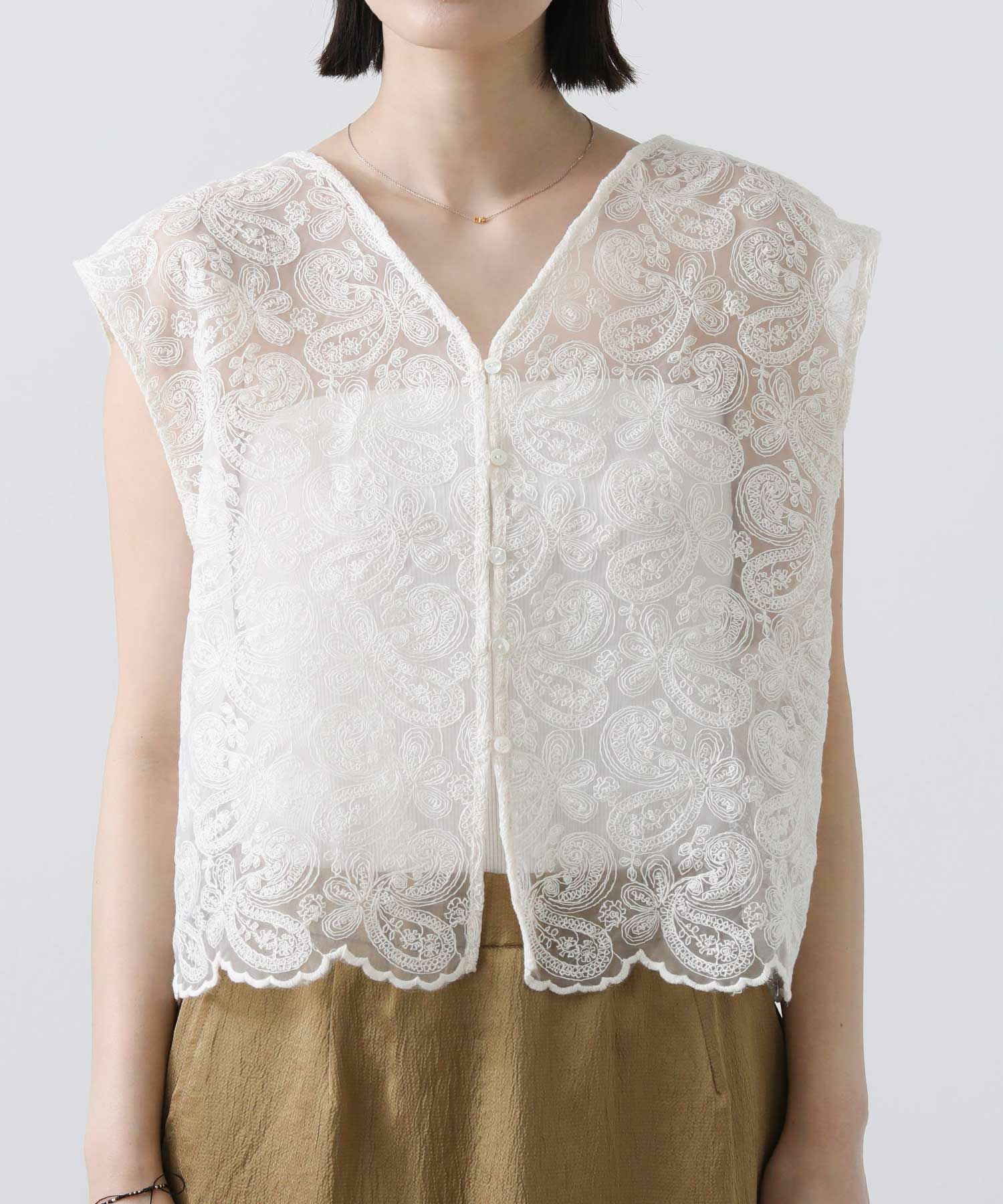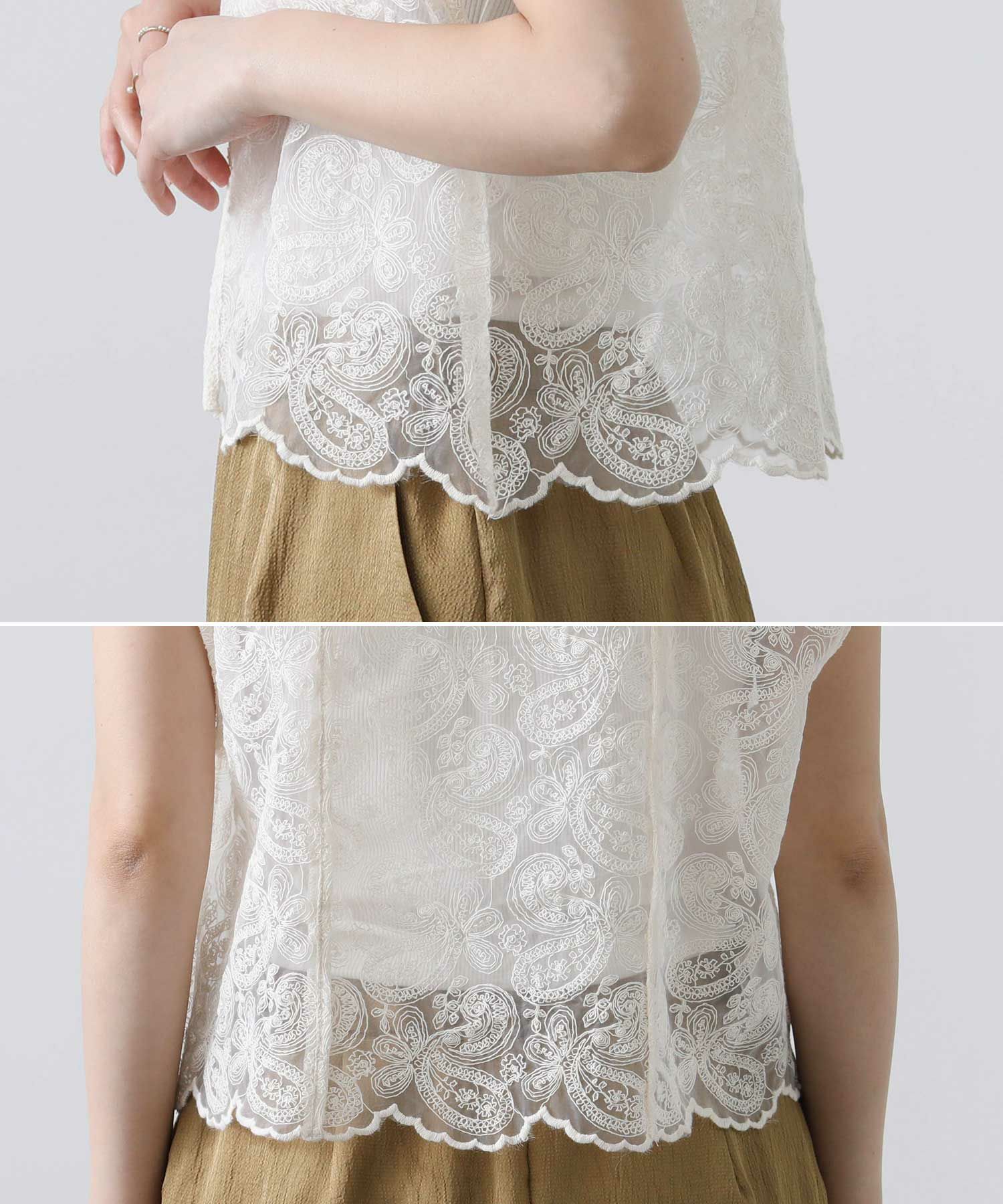 オーガンジーに繊細な総刺繍が施され、クラフト感のあるレース素材を使用。