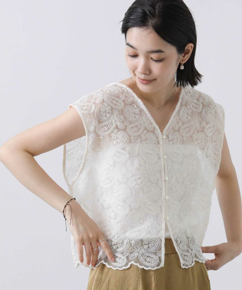 オーガンジーに繊細な総刺繍が施され、クラフト感のあるレース素材を使用。
