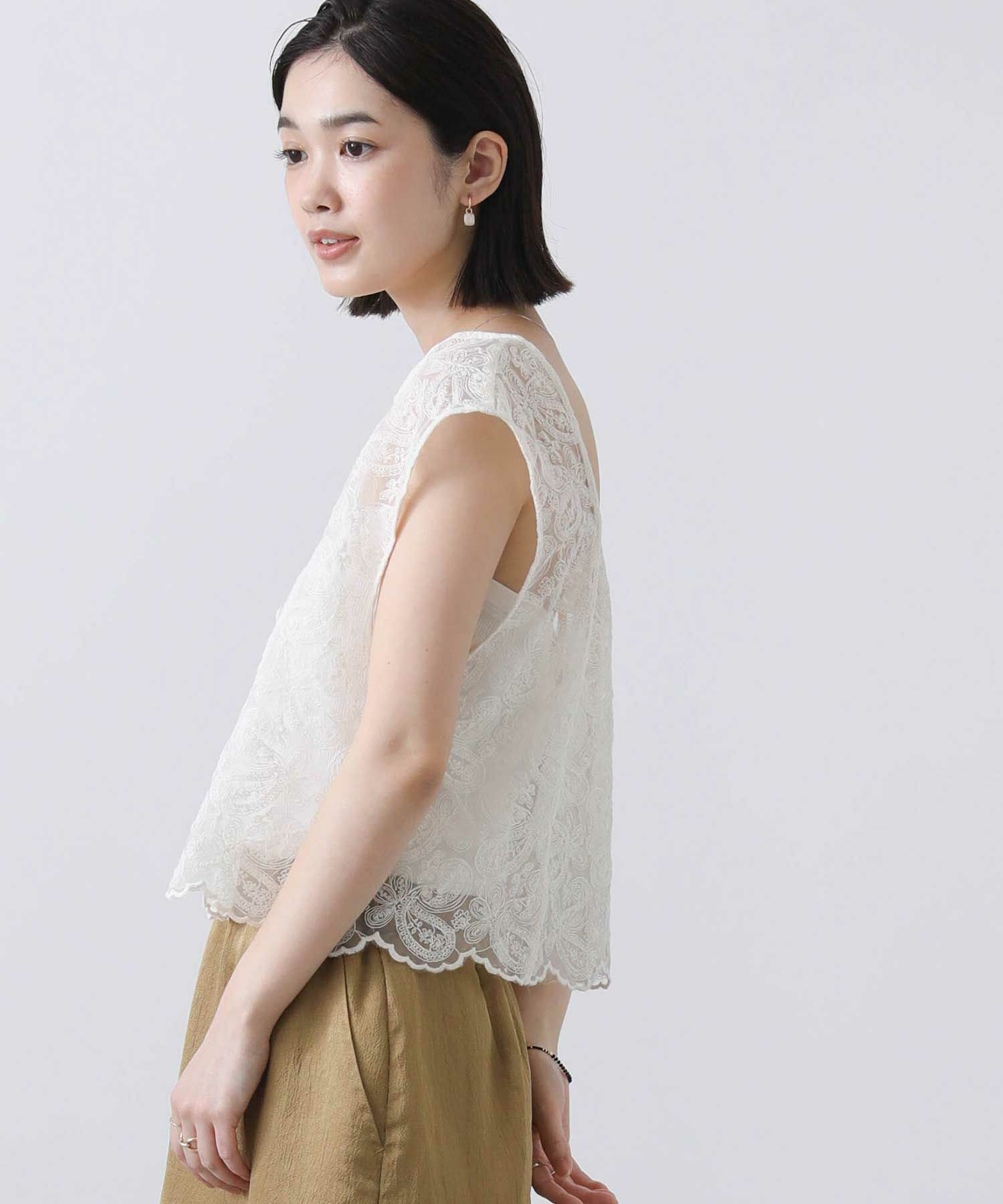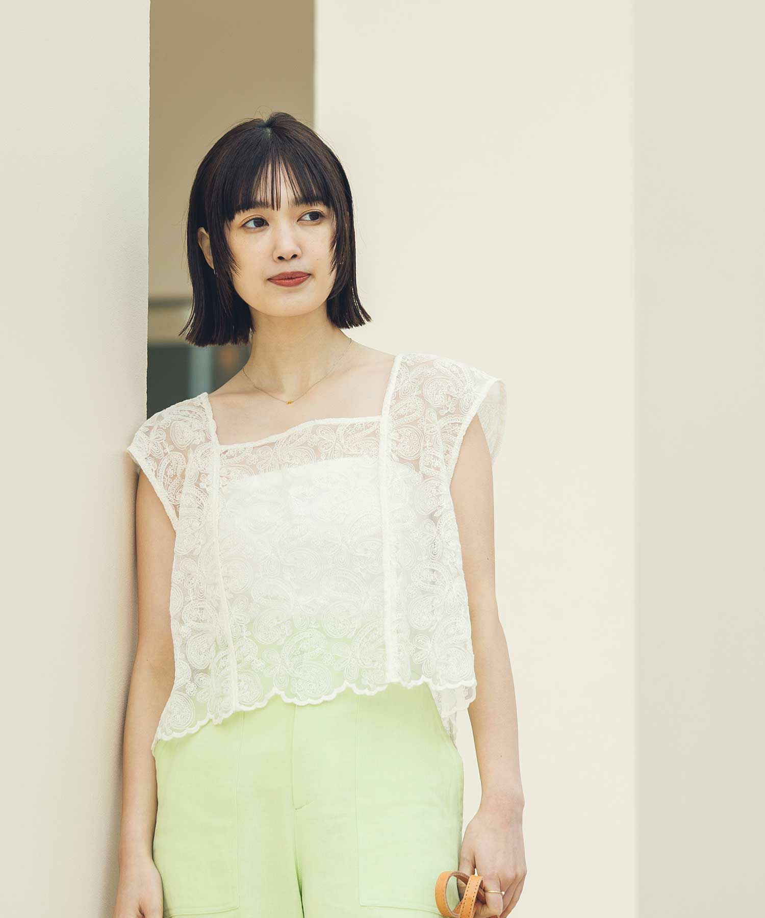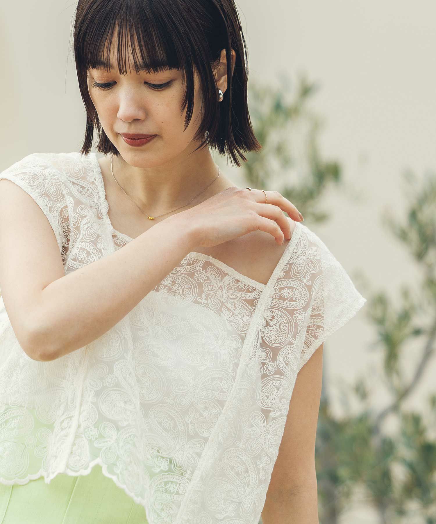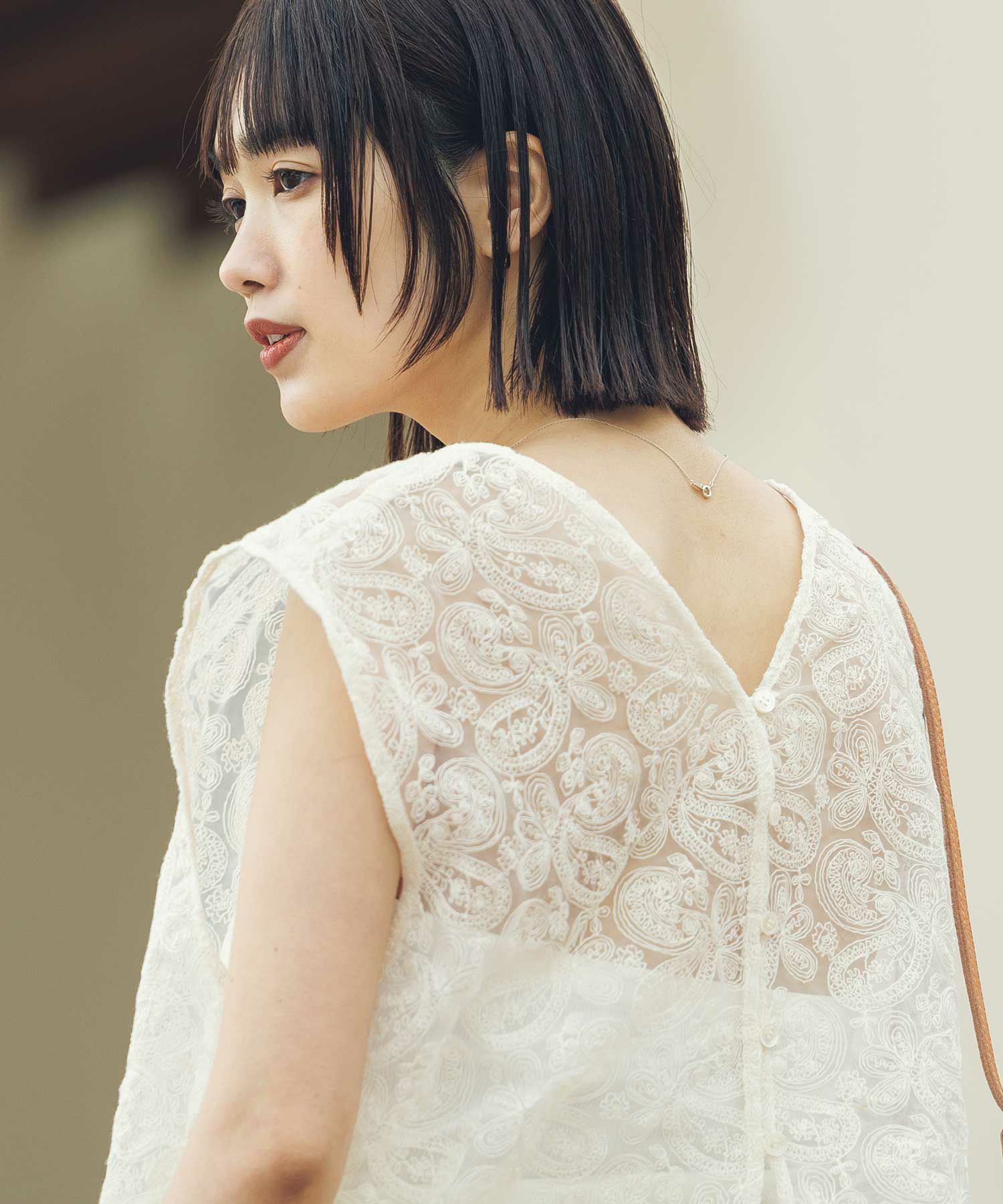 オーガンジーに繊細な総刺繍が施され、クラフト感のあるレース素材を使用。