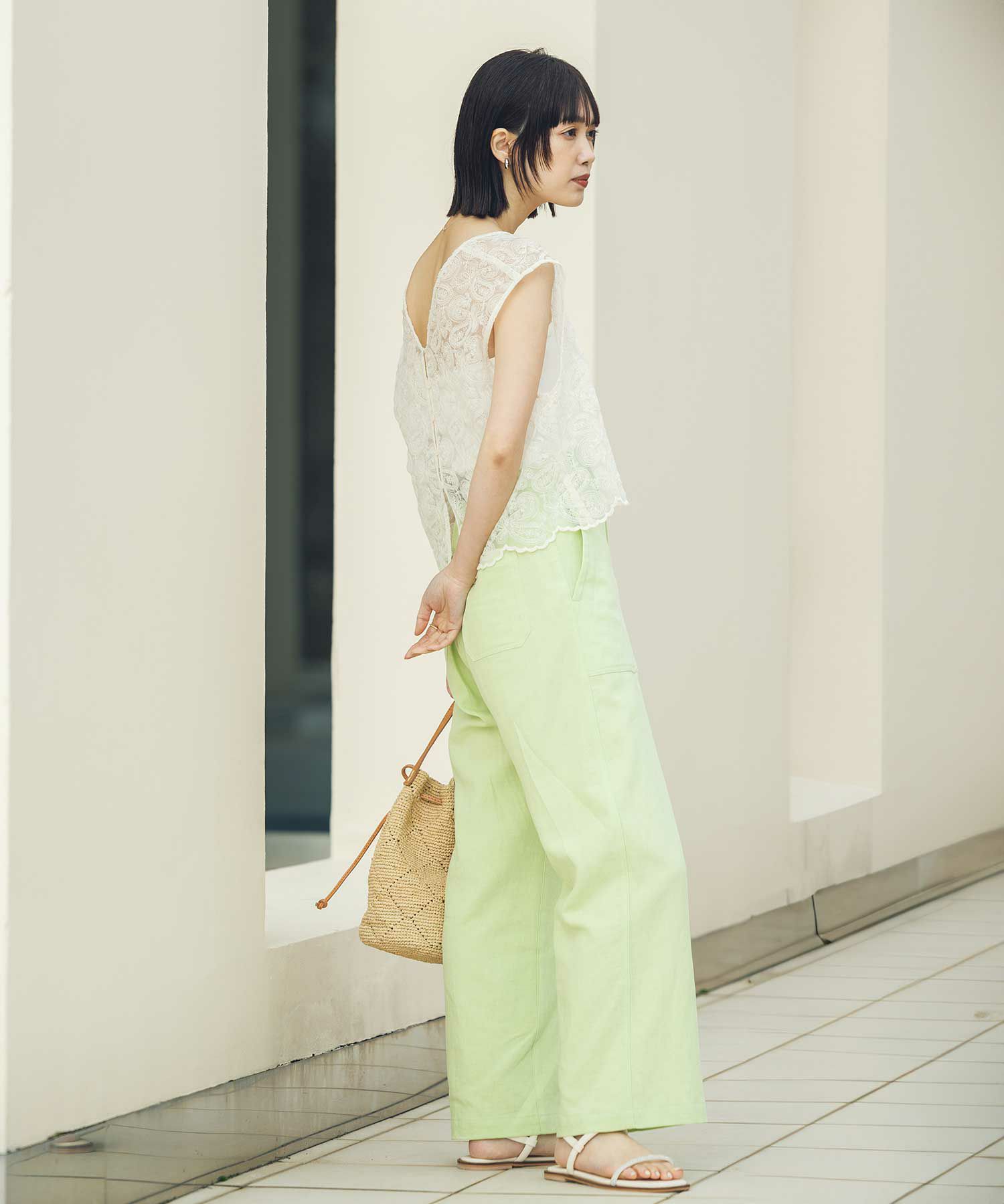 クロップド丈でコンパクトなサイズ感なので、デニムはもちろん、トレンドの太めパンツとも好相性。