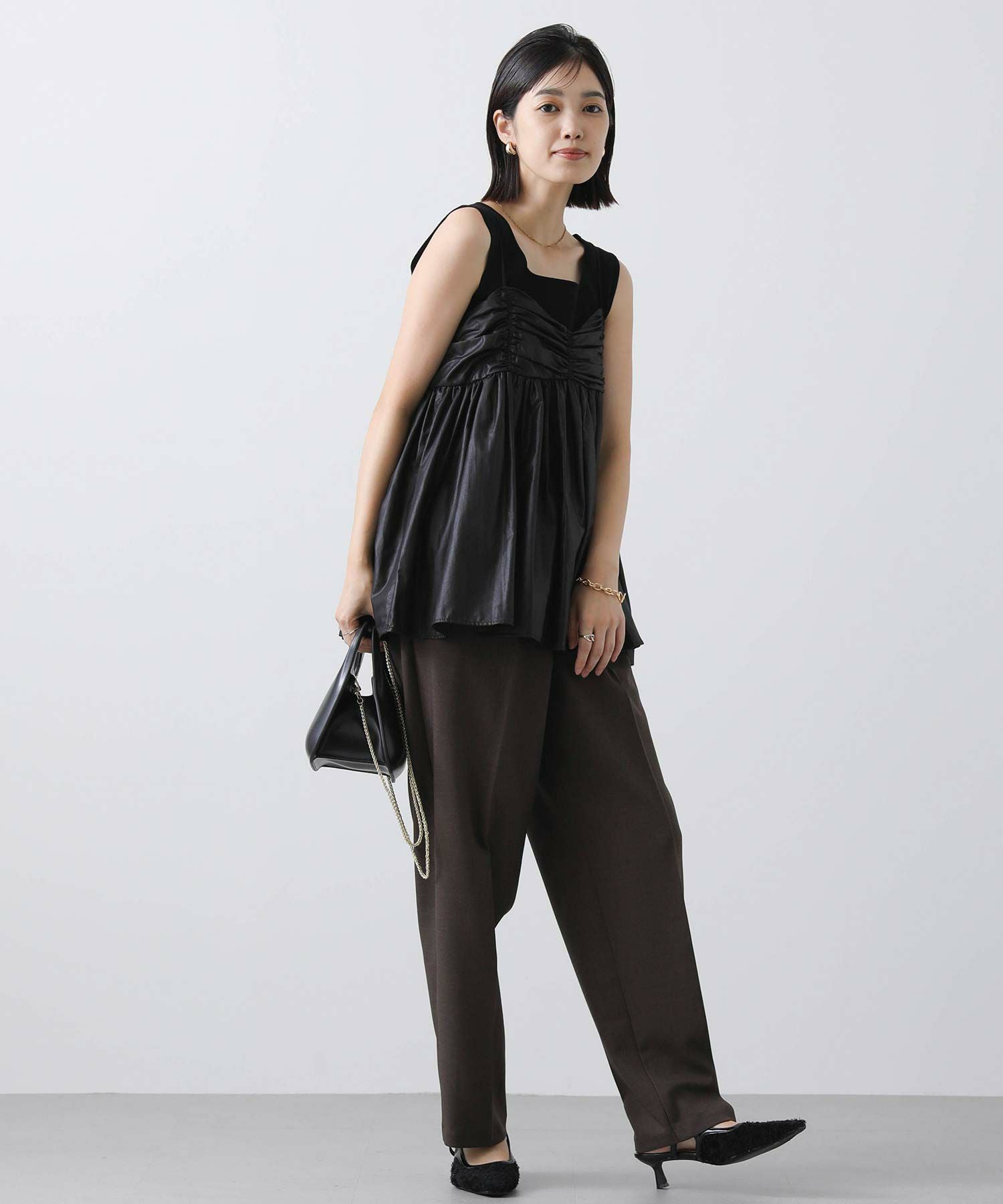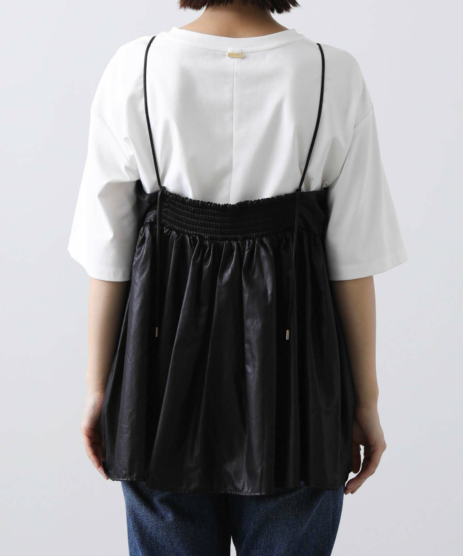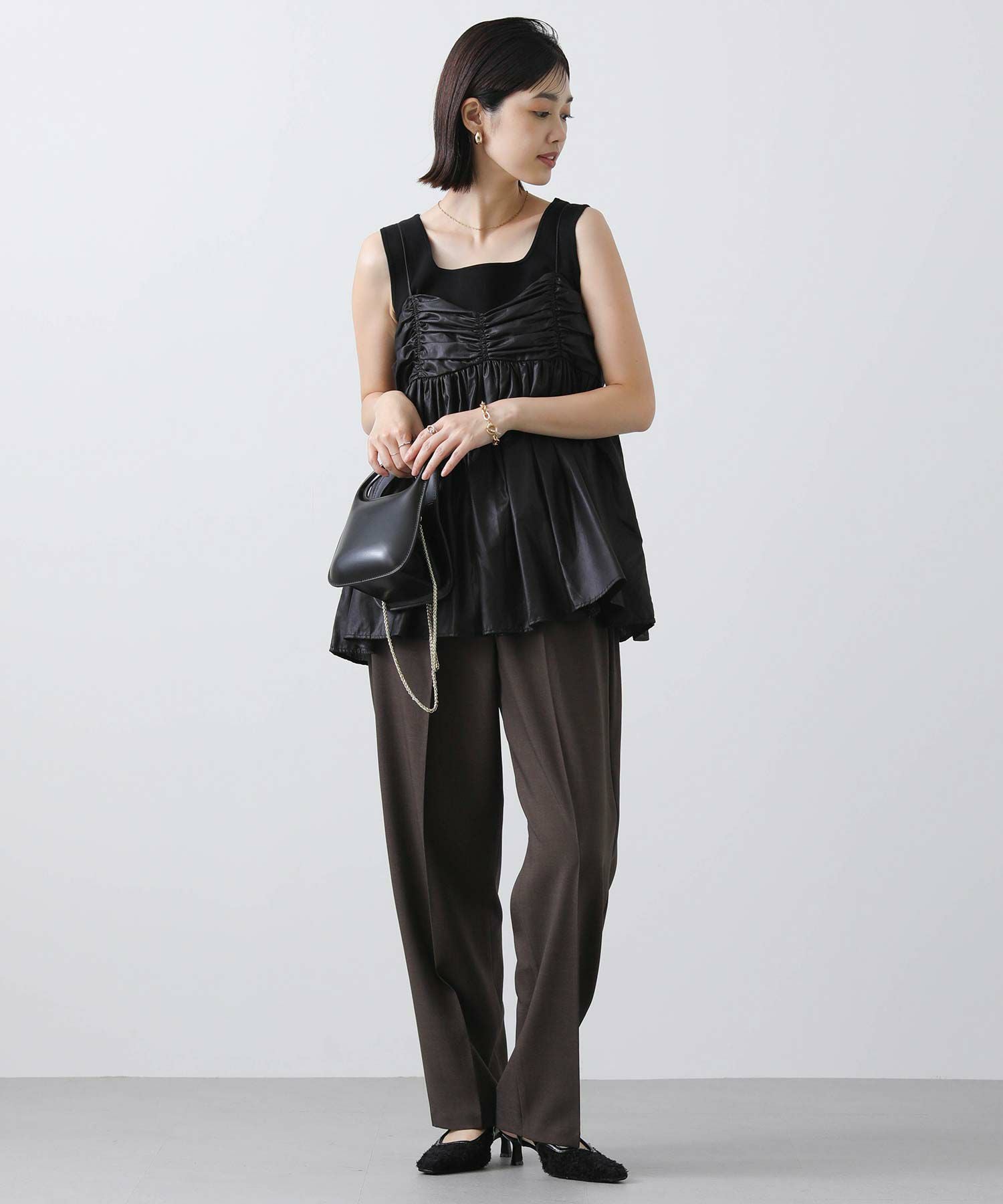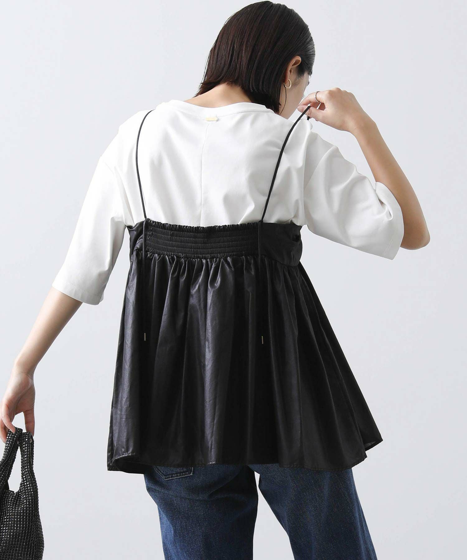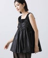 トレンドのビスチェをレザーライクな表面加工を施した素材でギャザーたっぷりに仕上げた一着。