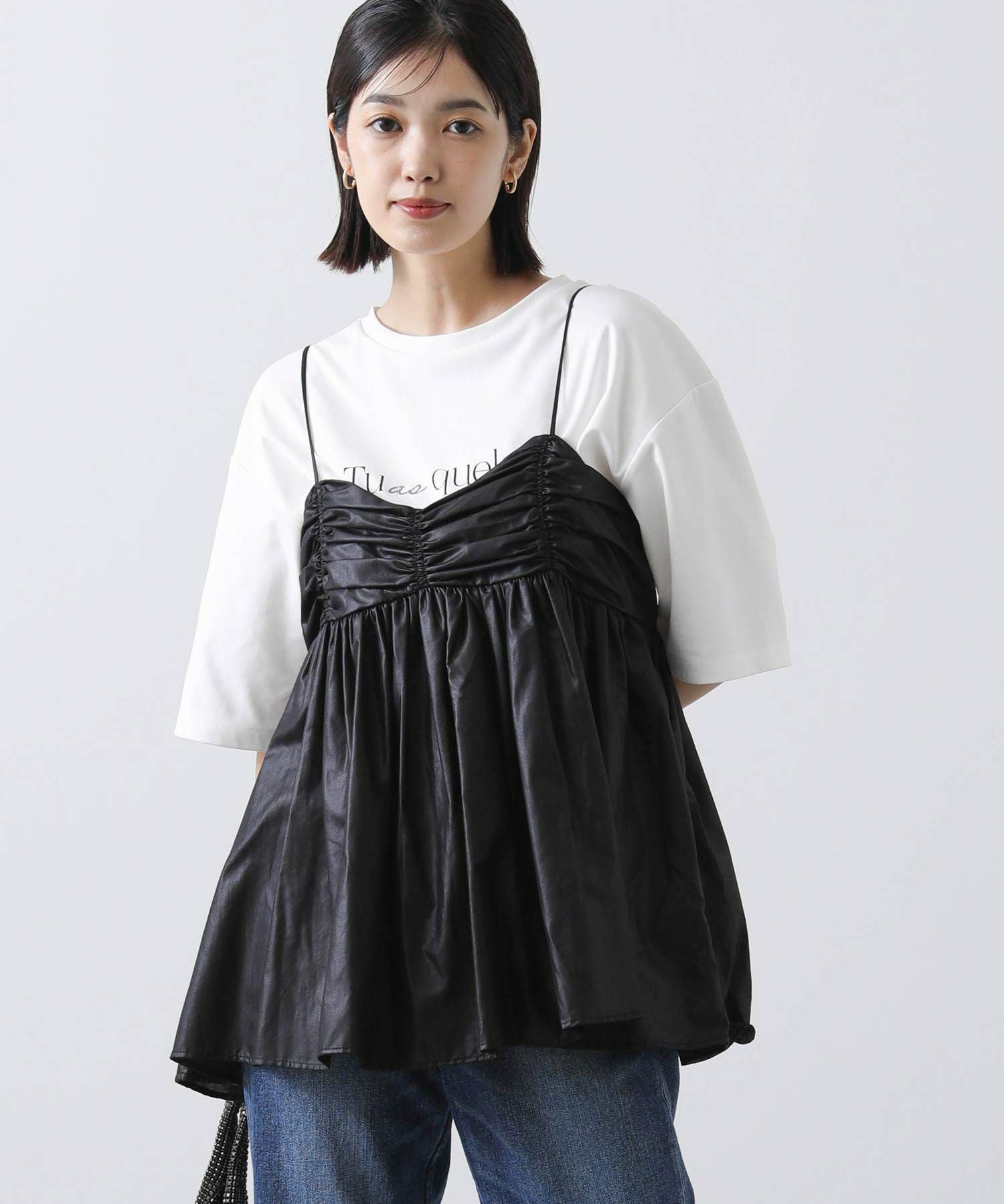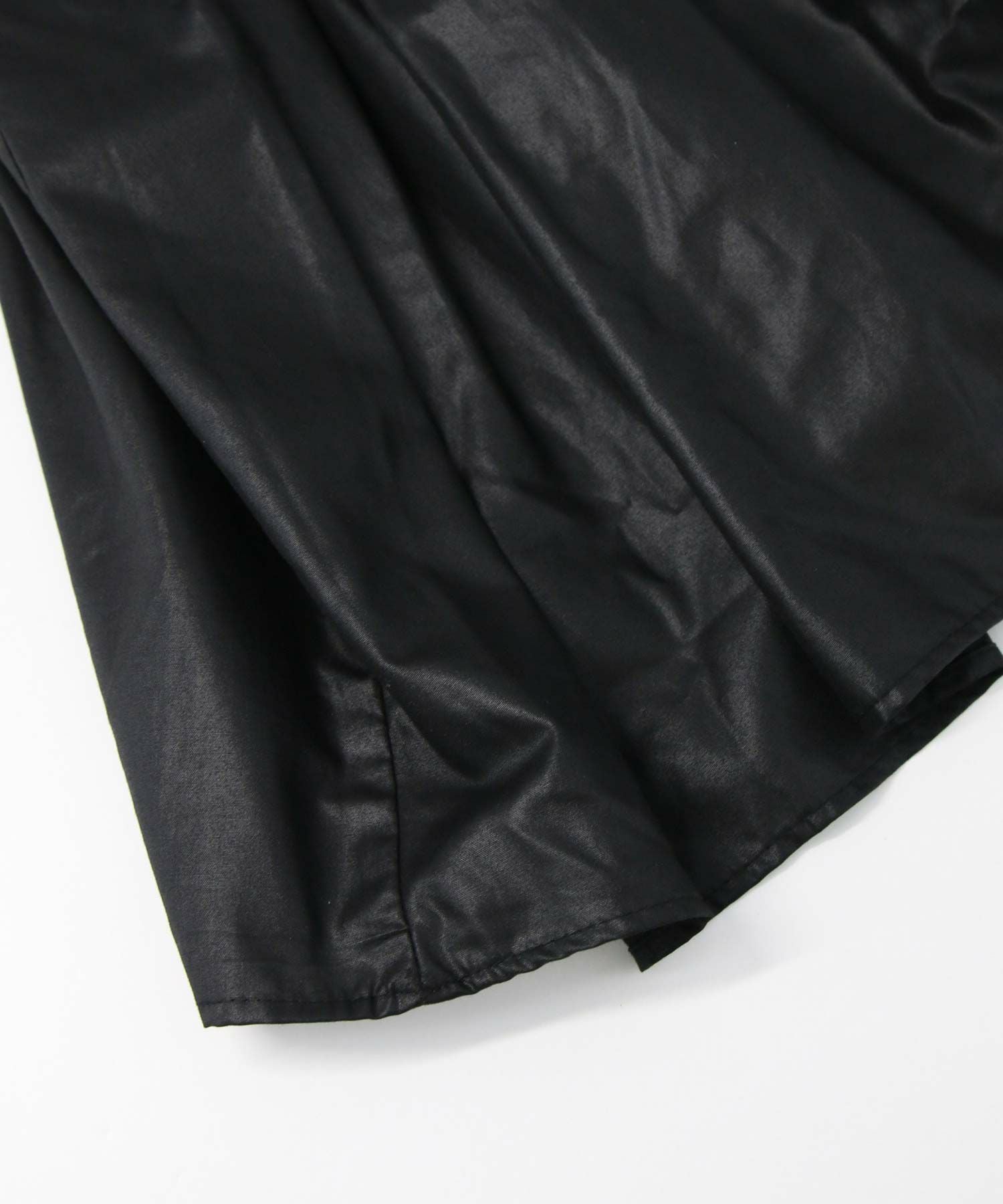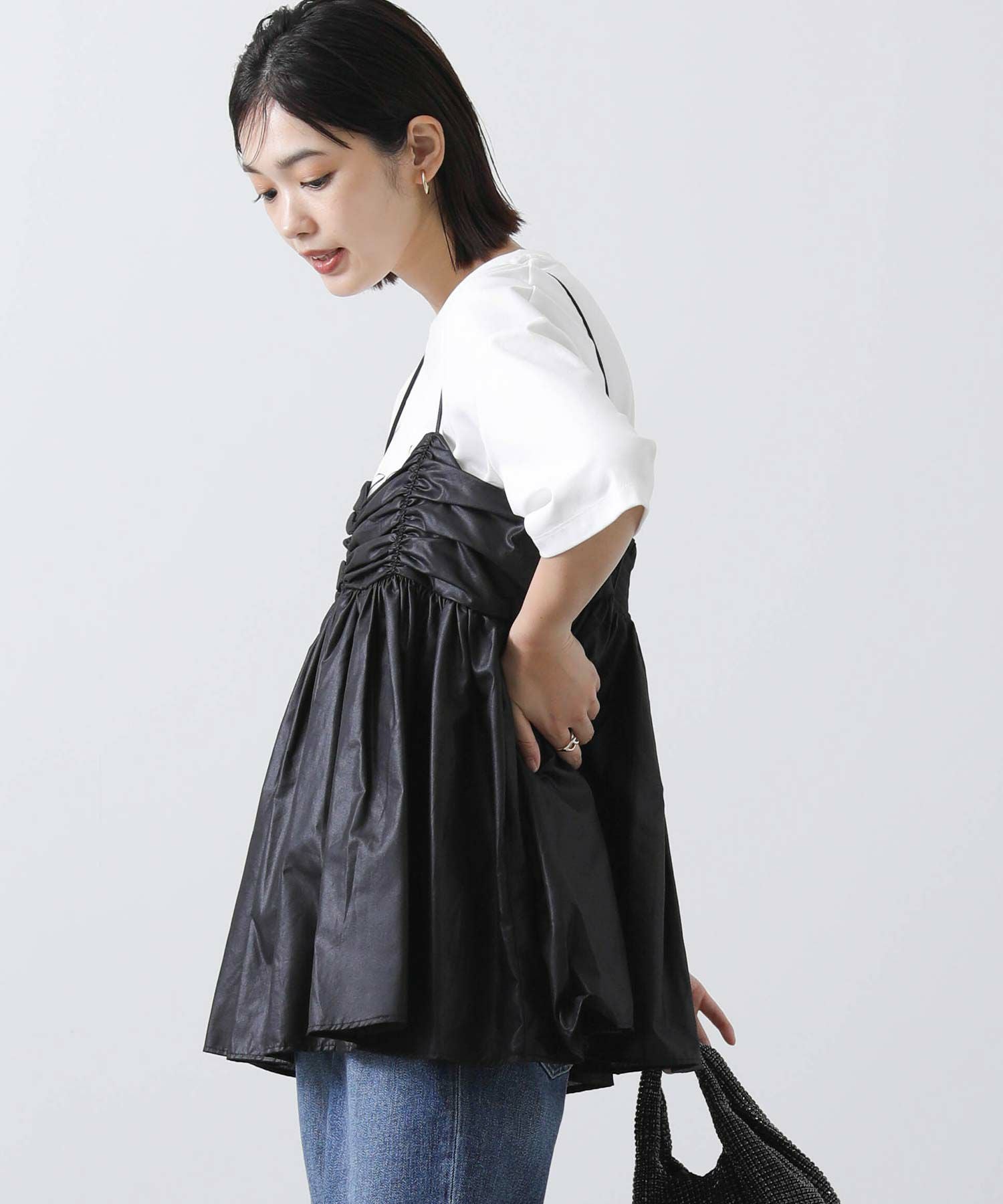 トレンドのビスチェをレザーライクな表面加工を施した素材でギャザーたっぷりに仕上げた一着。