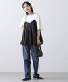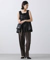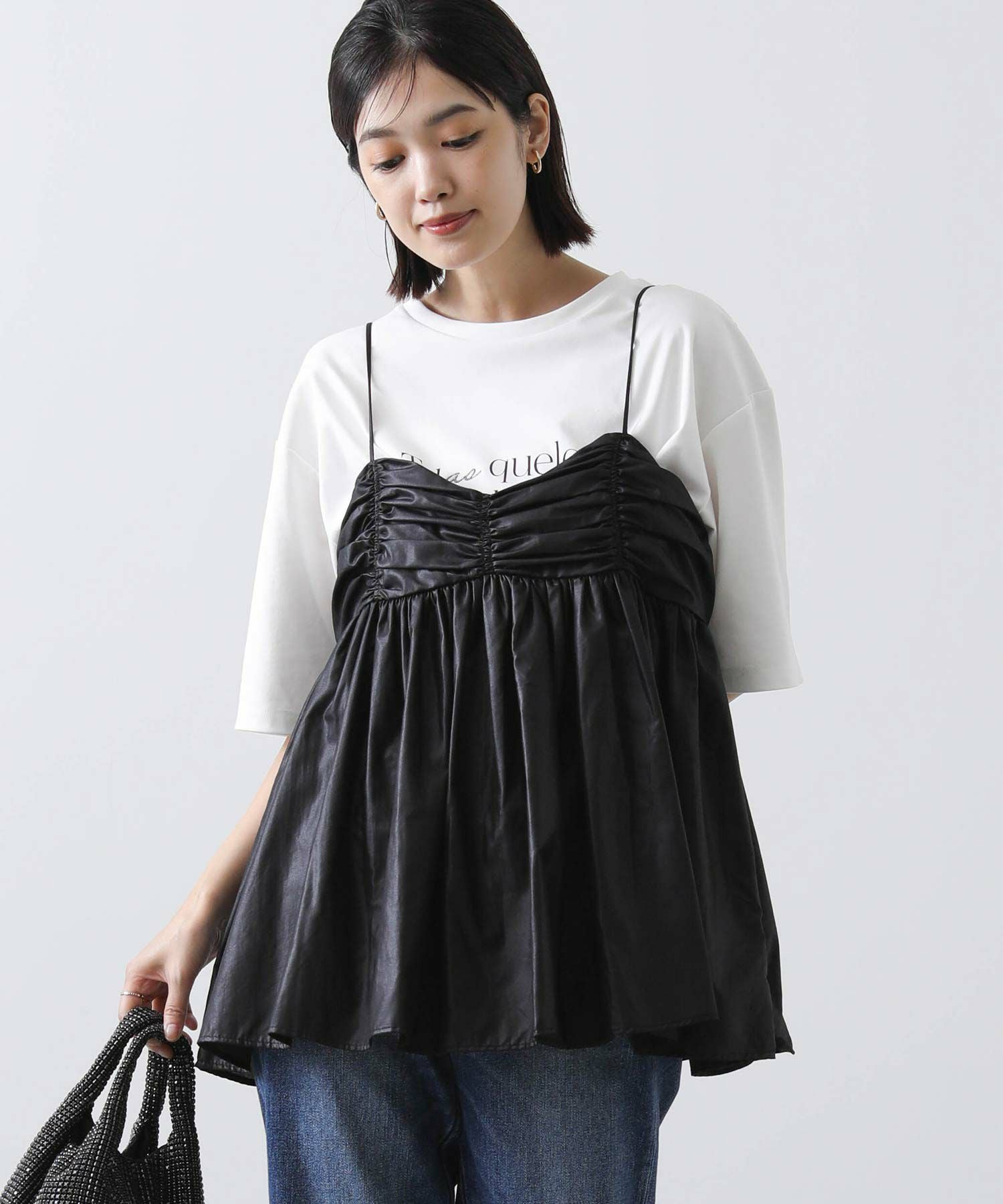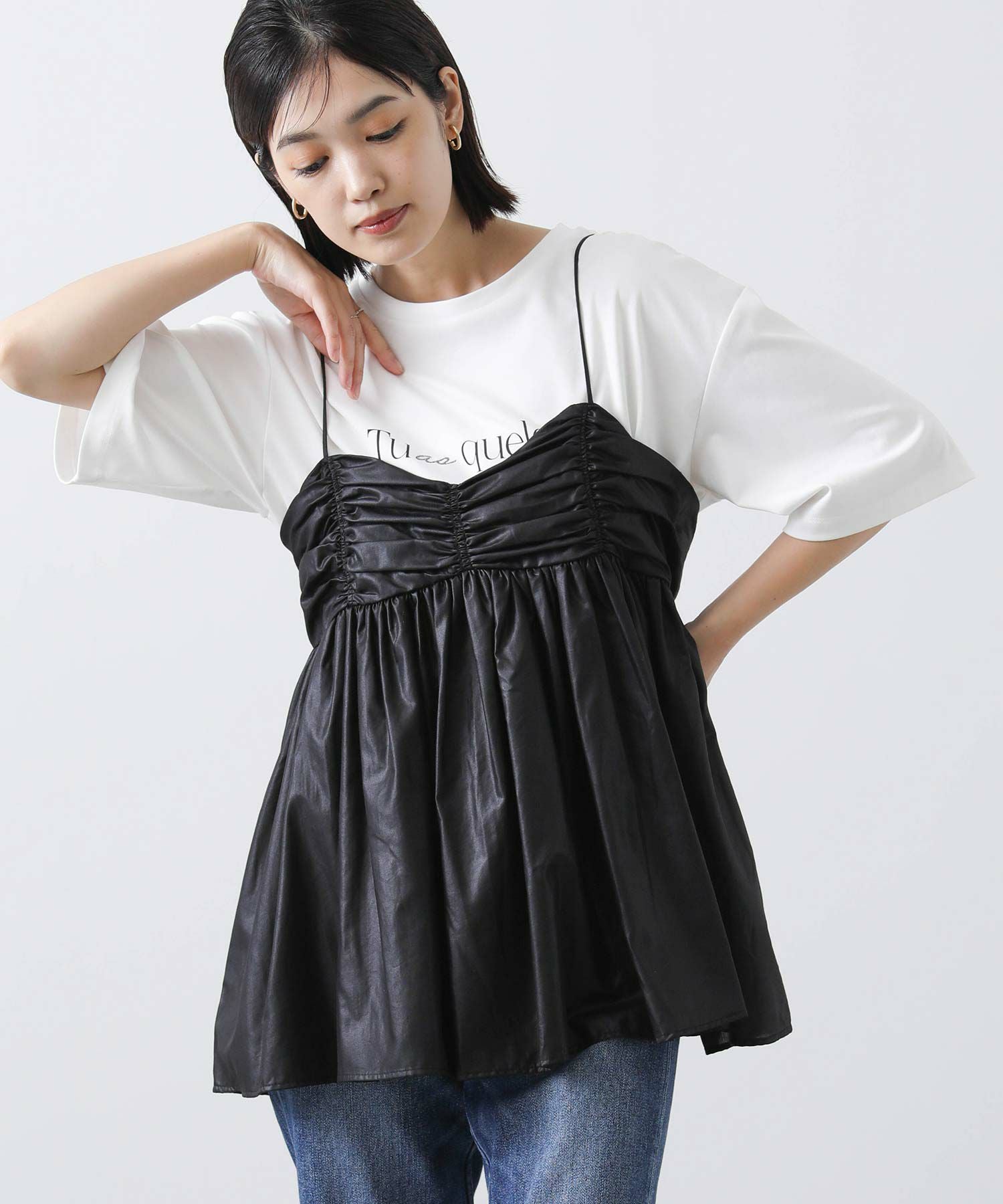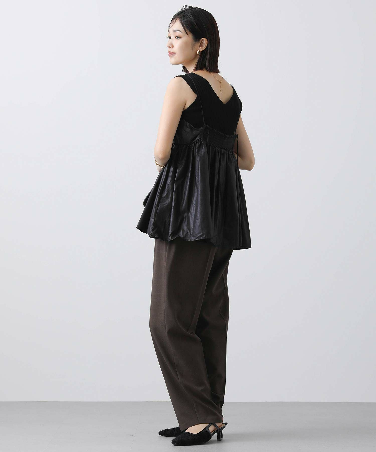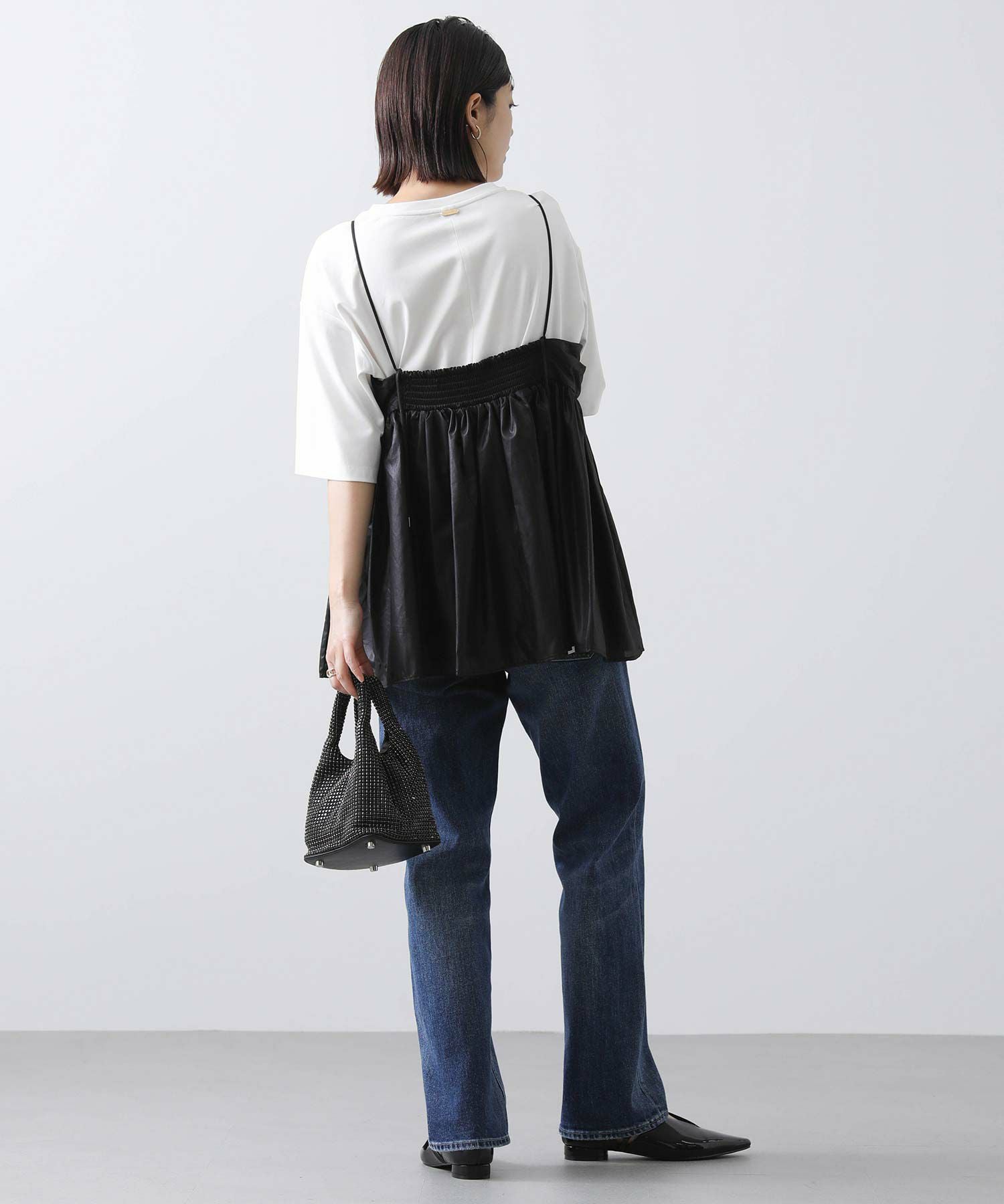 トレンドのビスチェをレザーライクな表面加工を施した素材でギャザーたっぷりに仕上げた一着。
