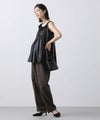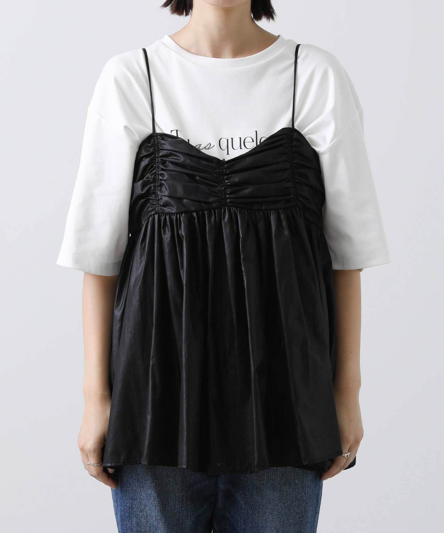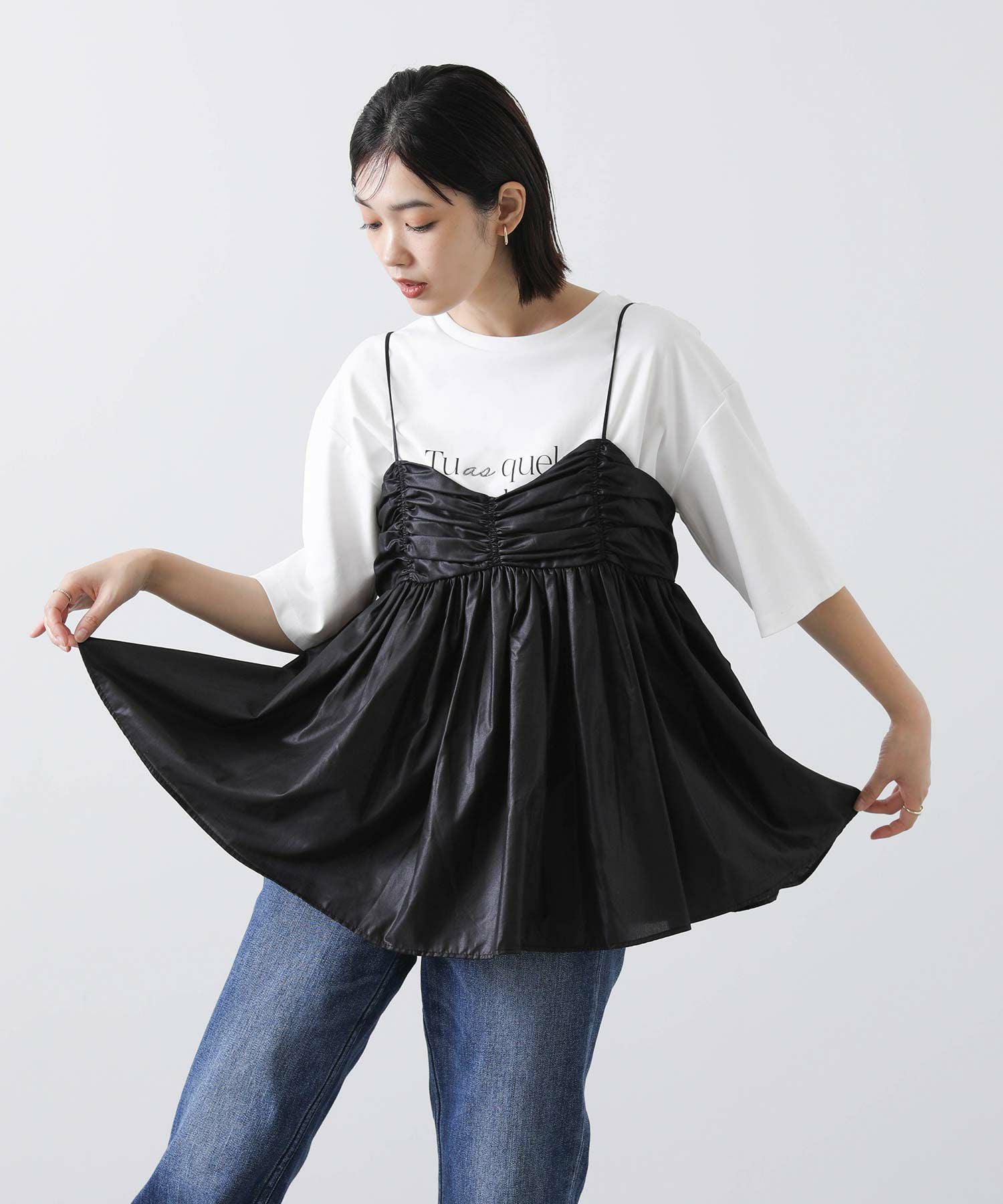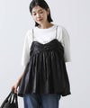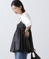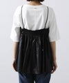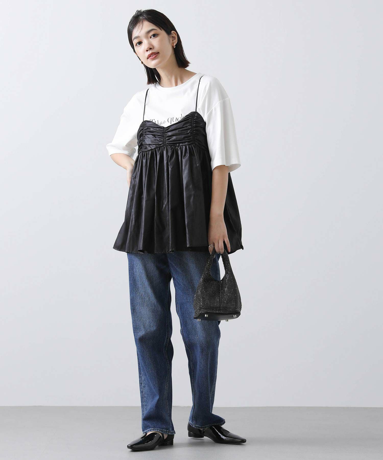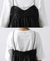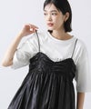胸元のたっぷりのギャザーと胸下からフレアに広がるシルエット、華奢な肩紐が抜け感をプラス。