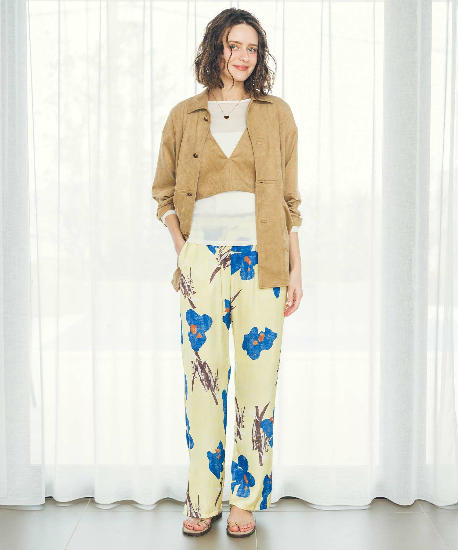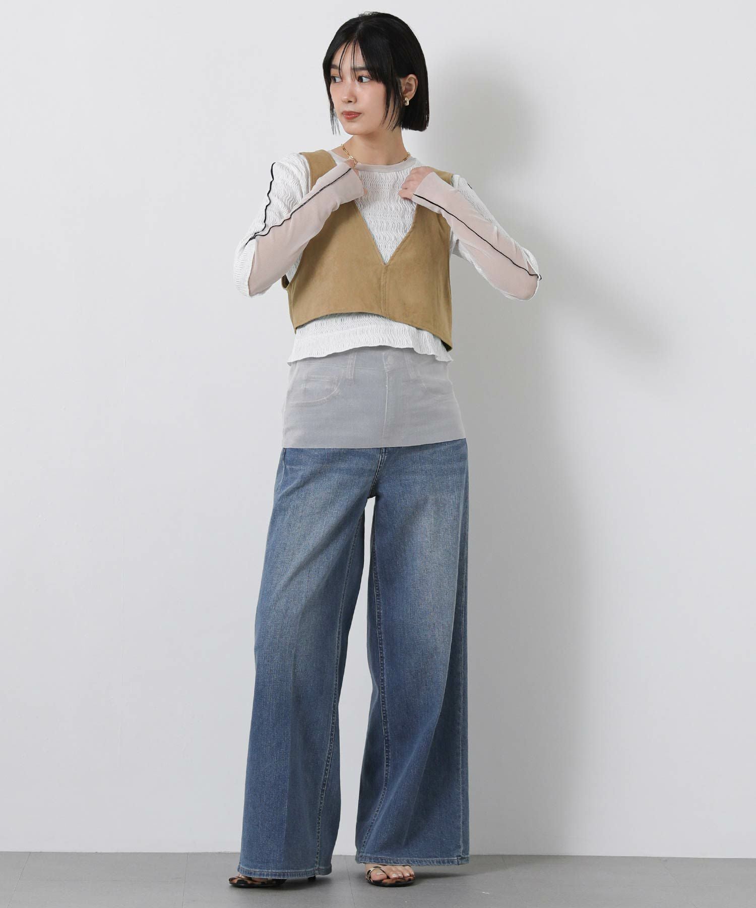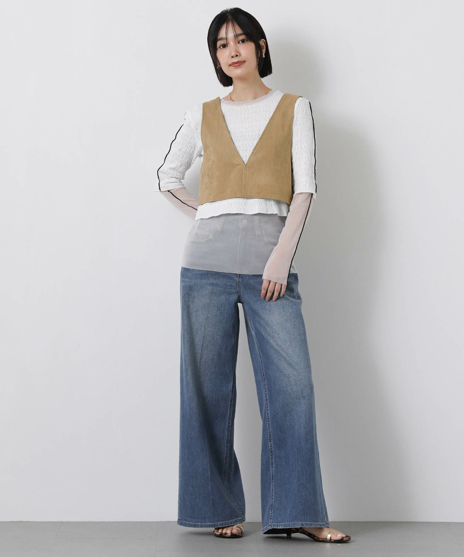 ハイウエストボトムと合わせれば視線を上にあげ、脚長効果もあります。