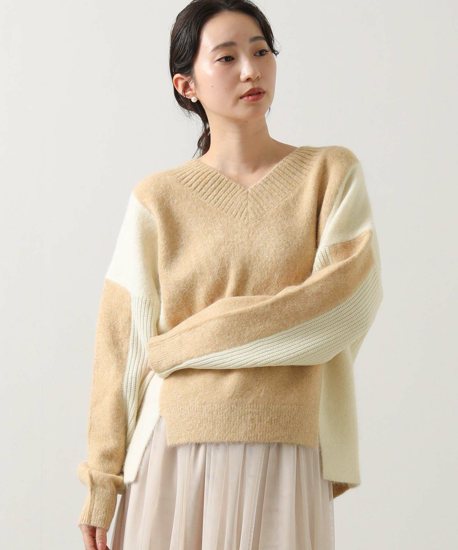 ドラマチックな表情を見せる、アルパカシャギーのカラーブロッキングニット。