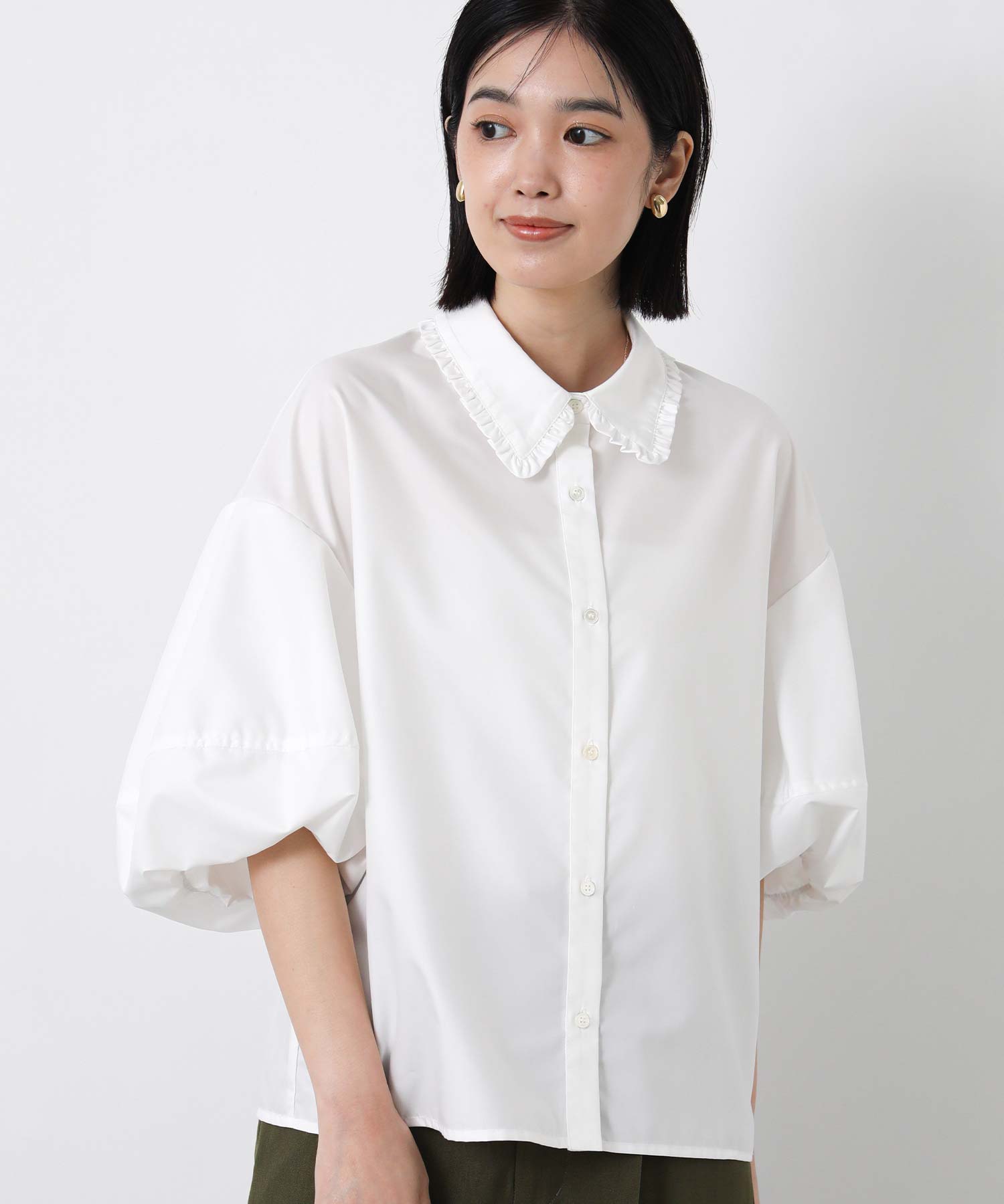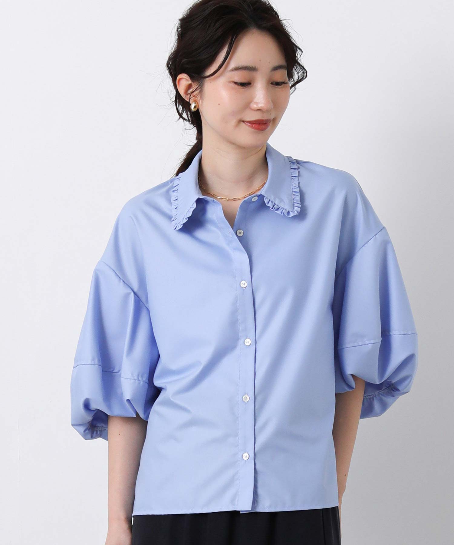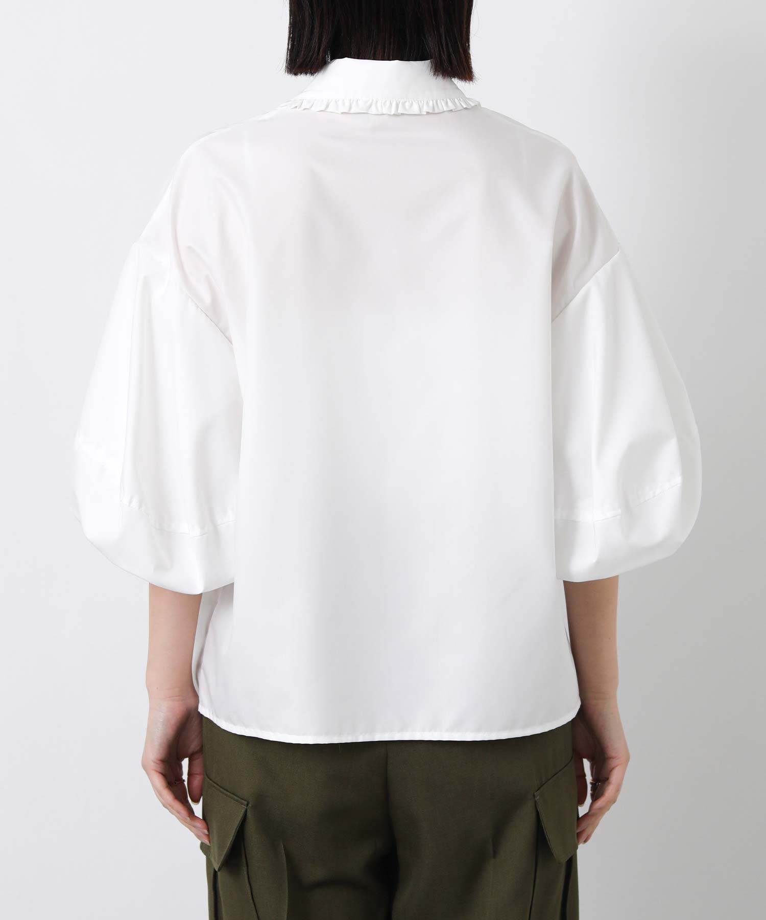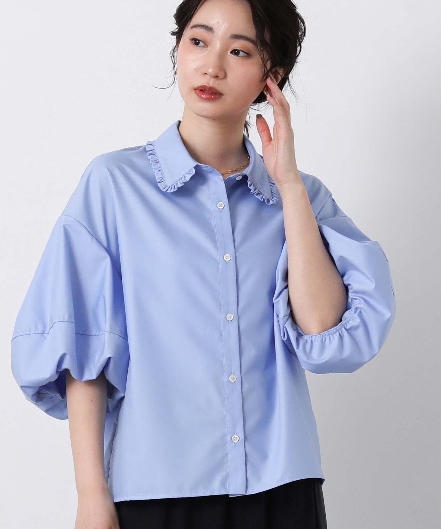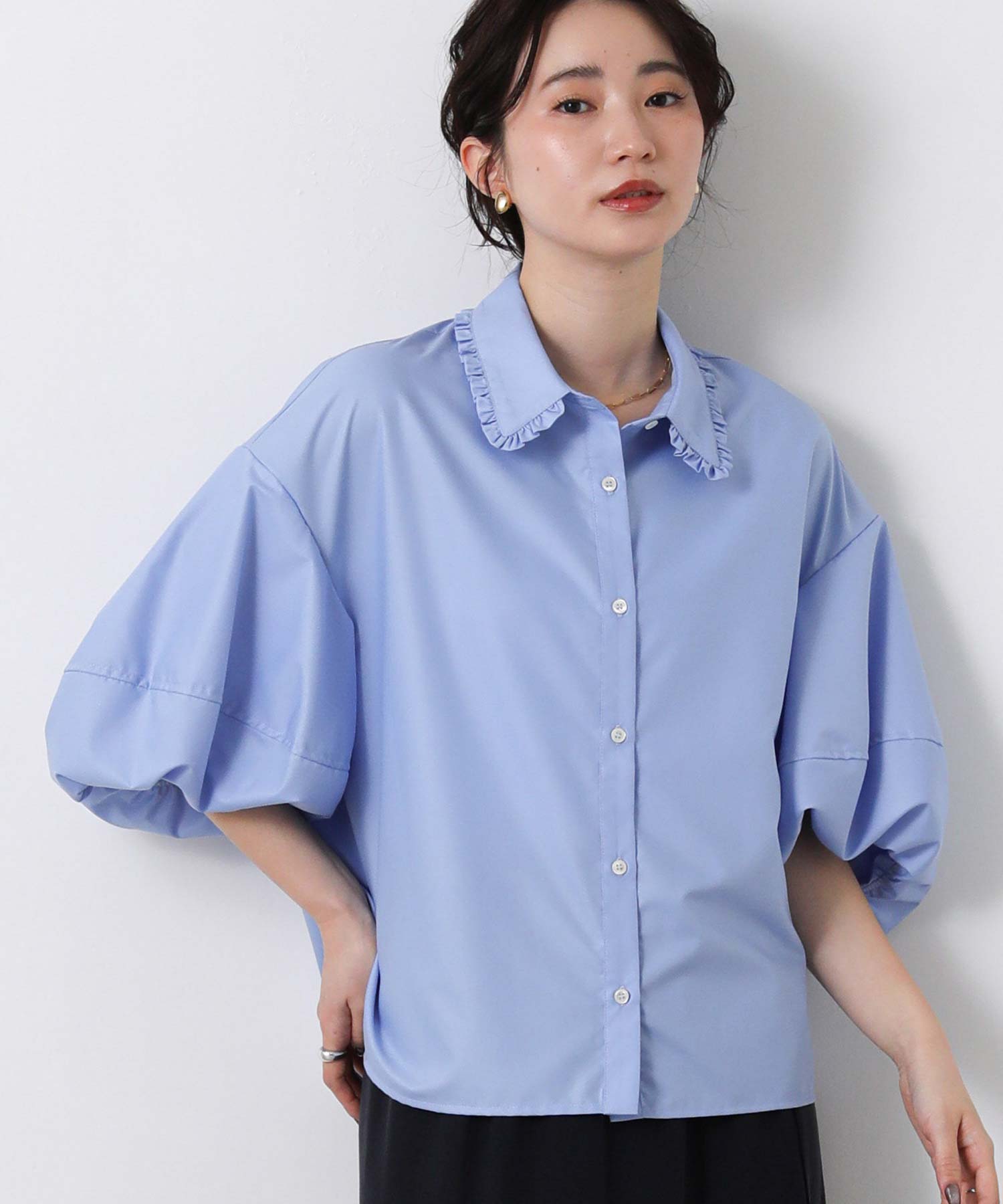 ふんわりとした袖のボリュームに、襟元のさりげないフリルが華やかさをプラス。