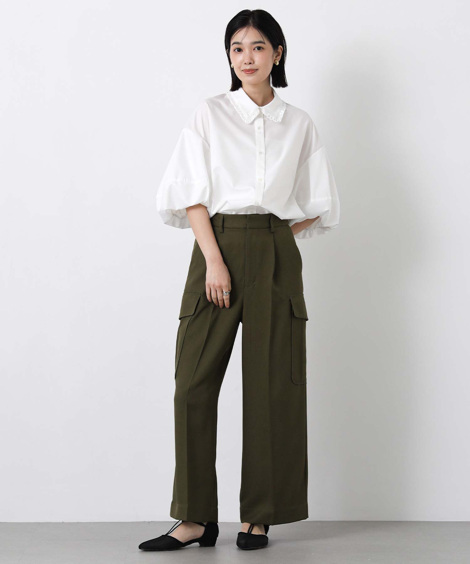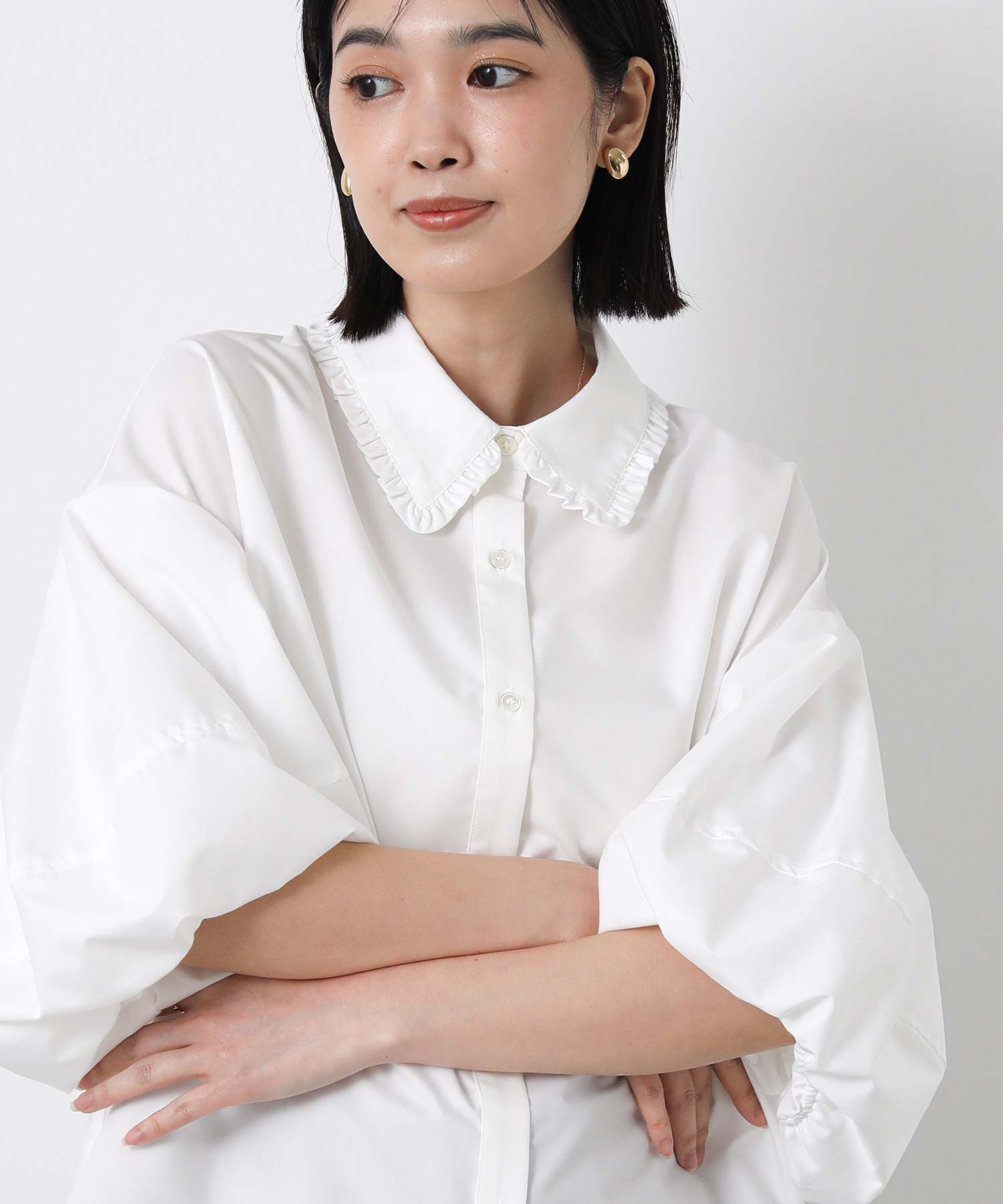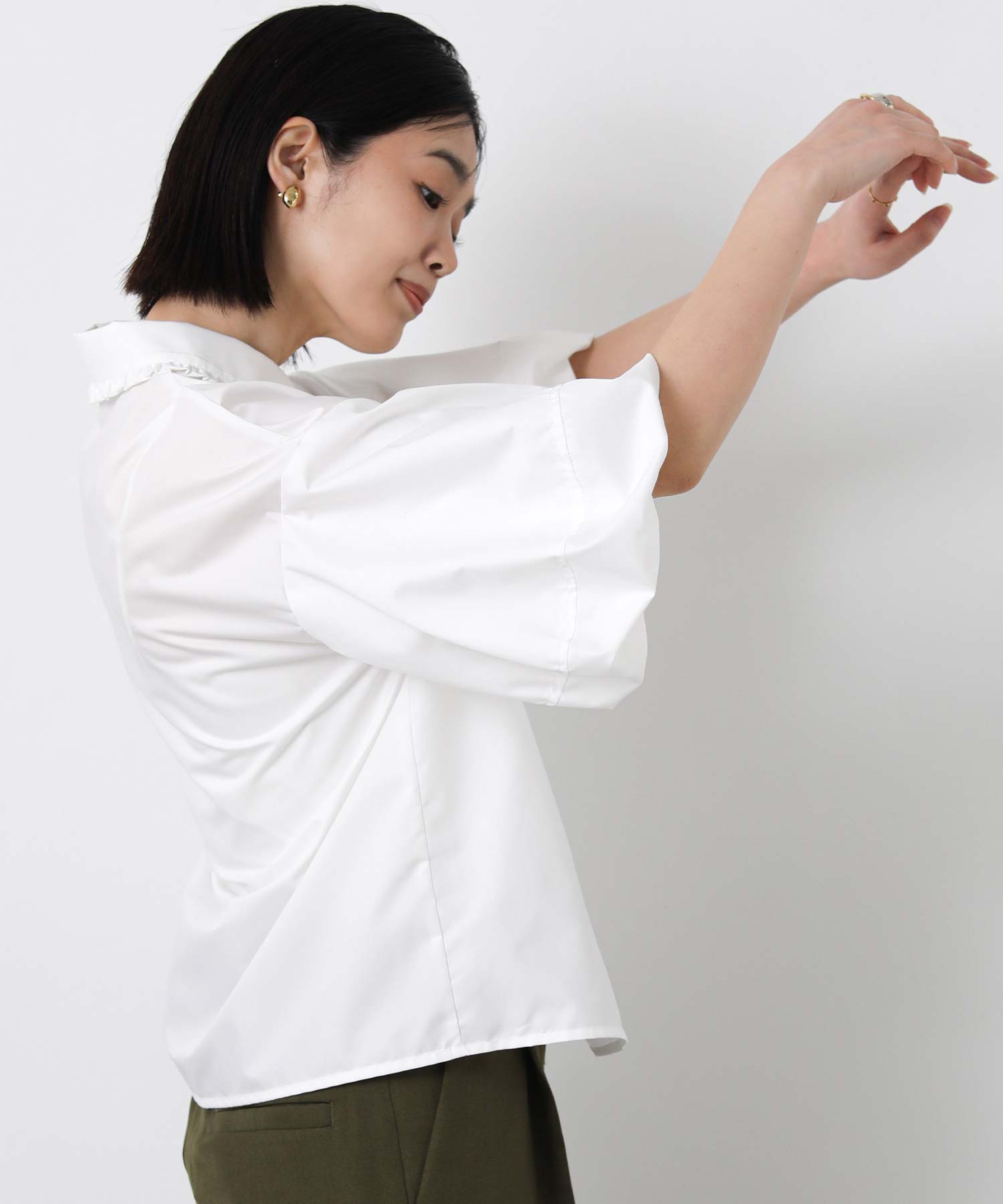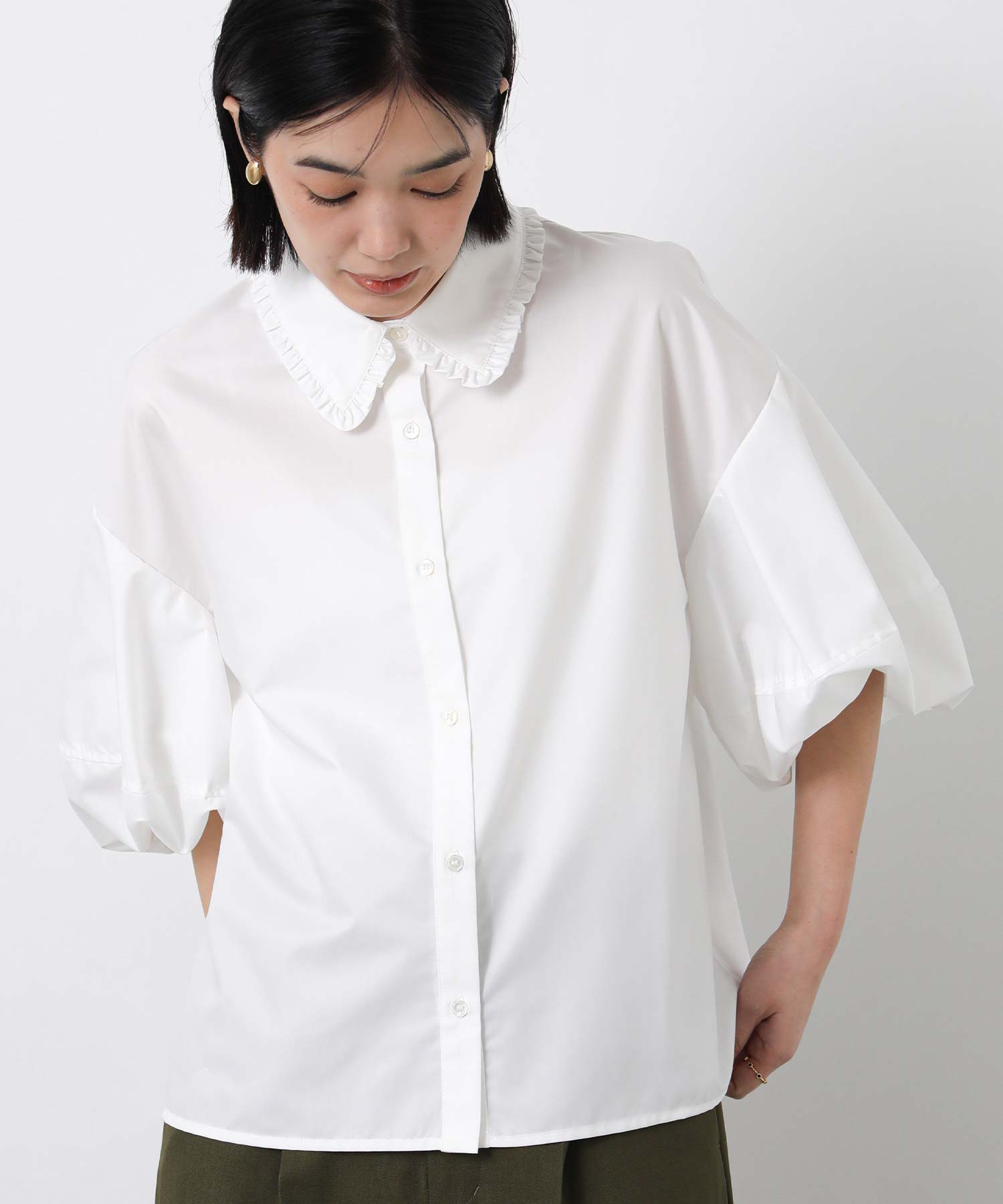 ふんわりとした袖のボリュームに、襟元のさりげないフリルが華やかさをプラス。