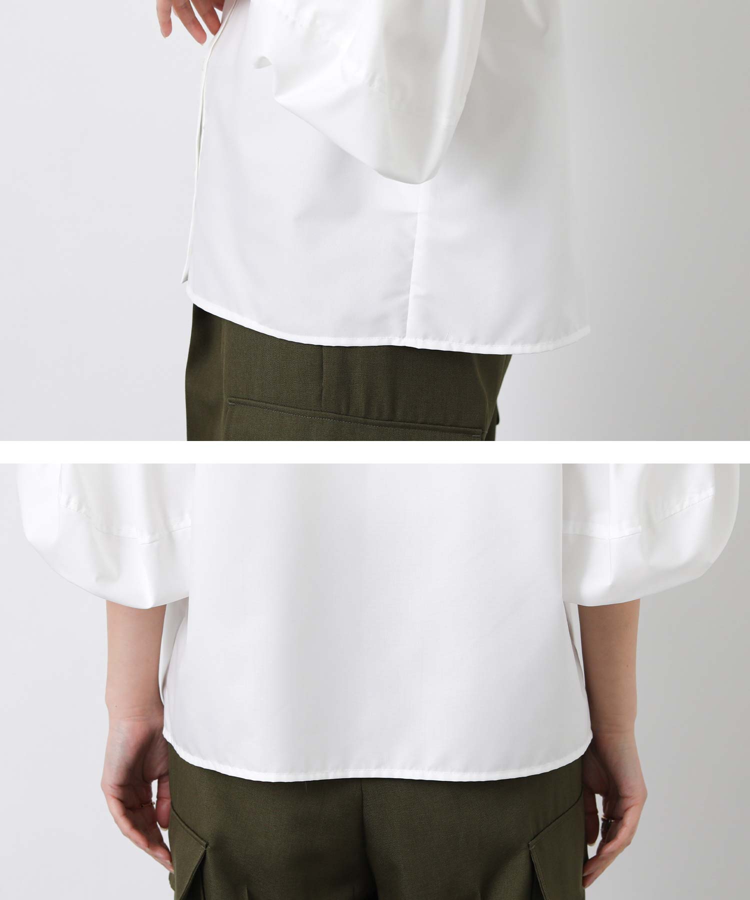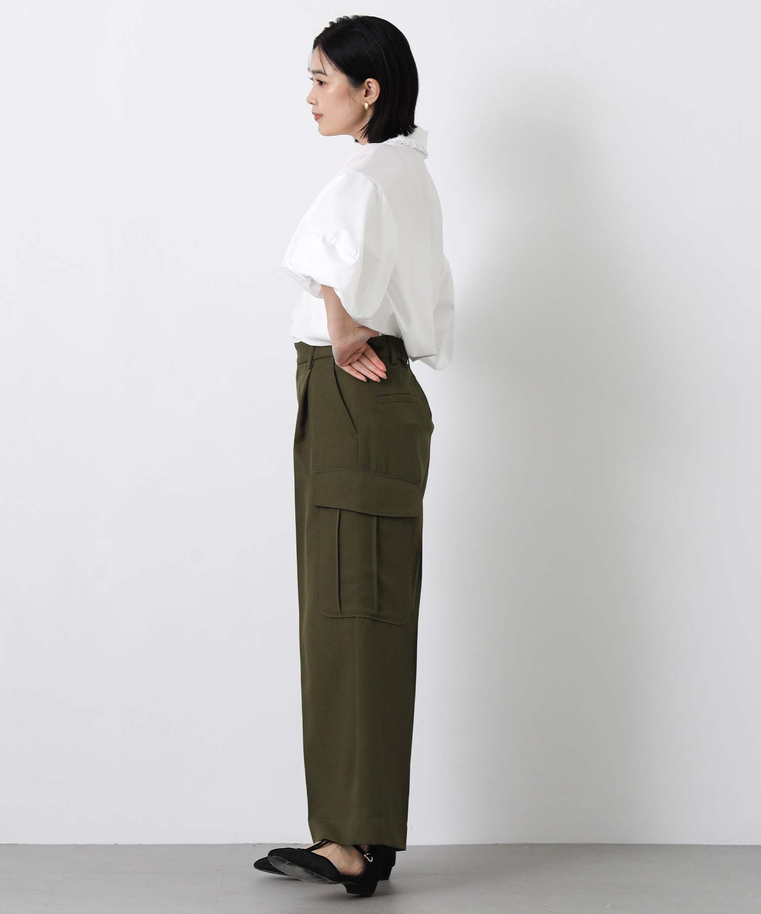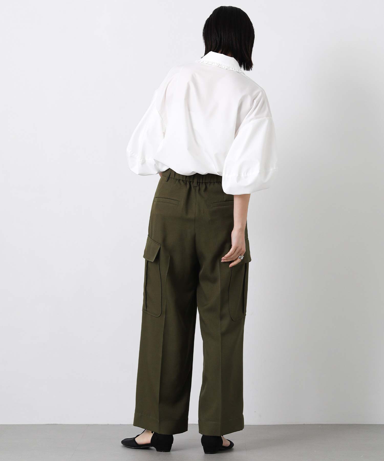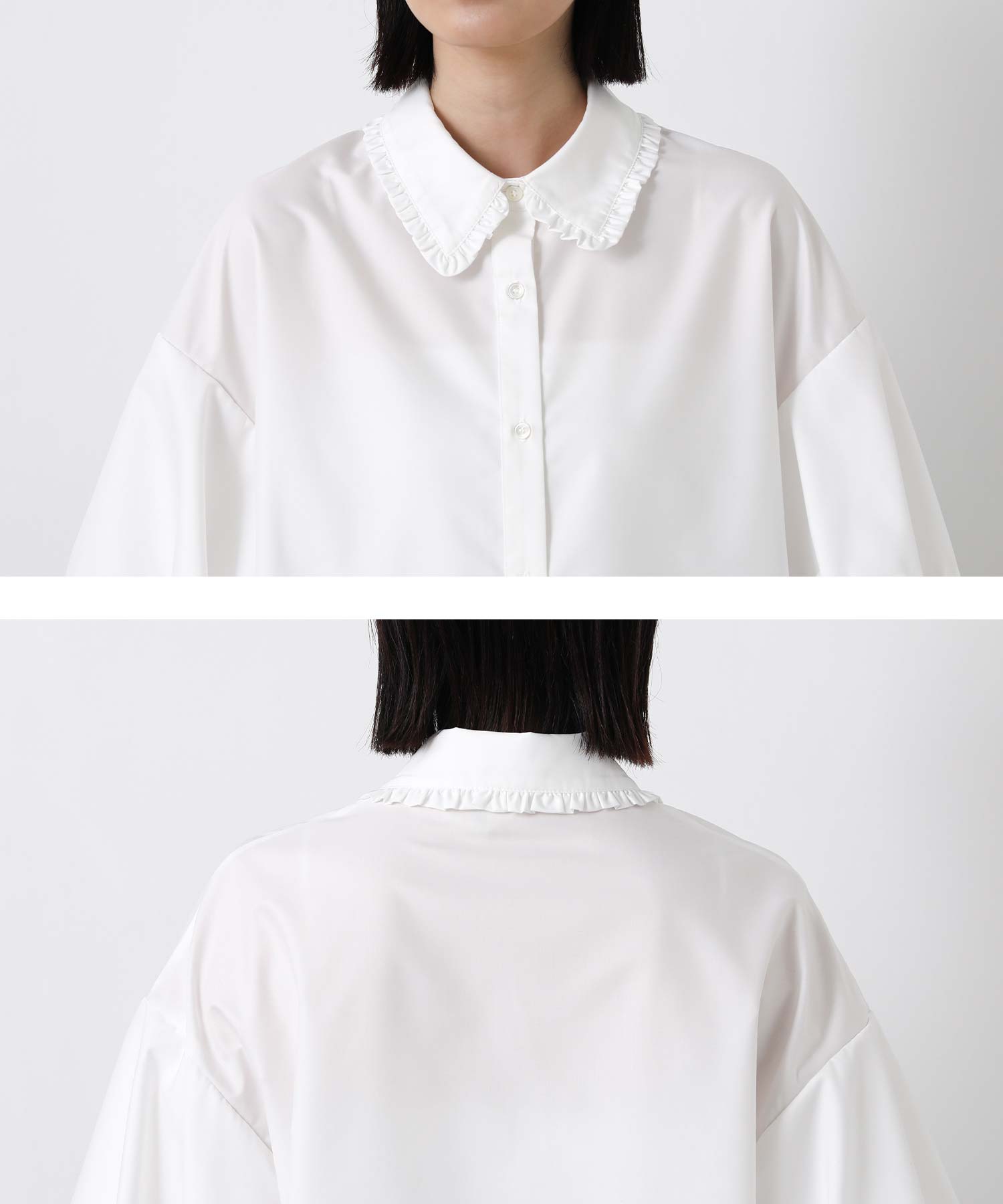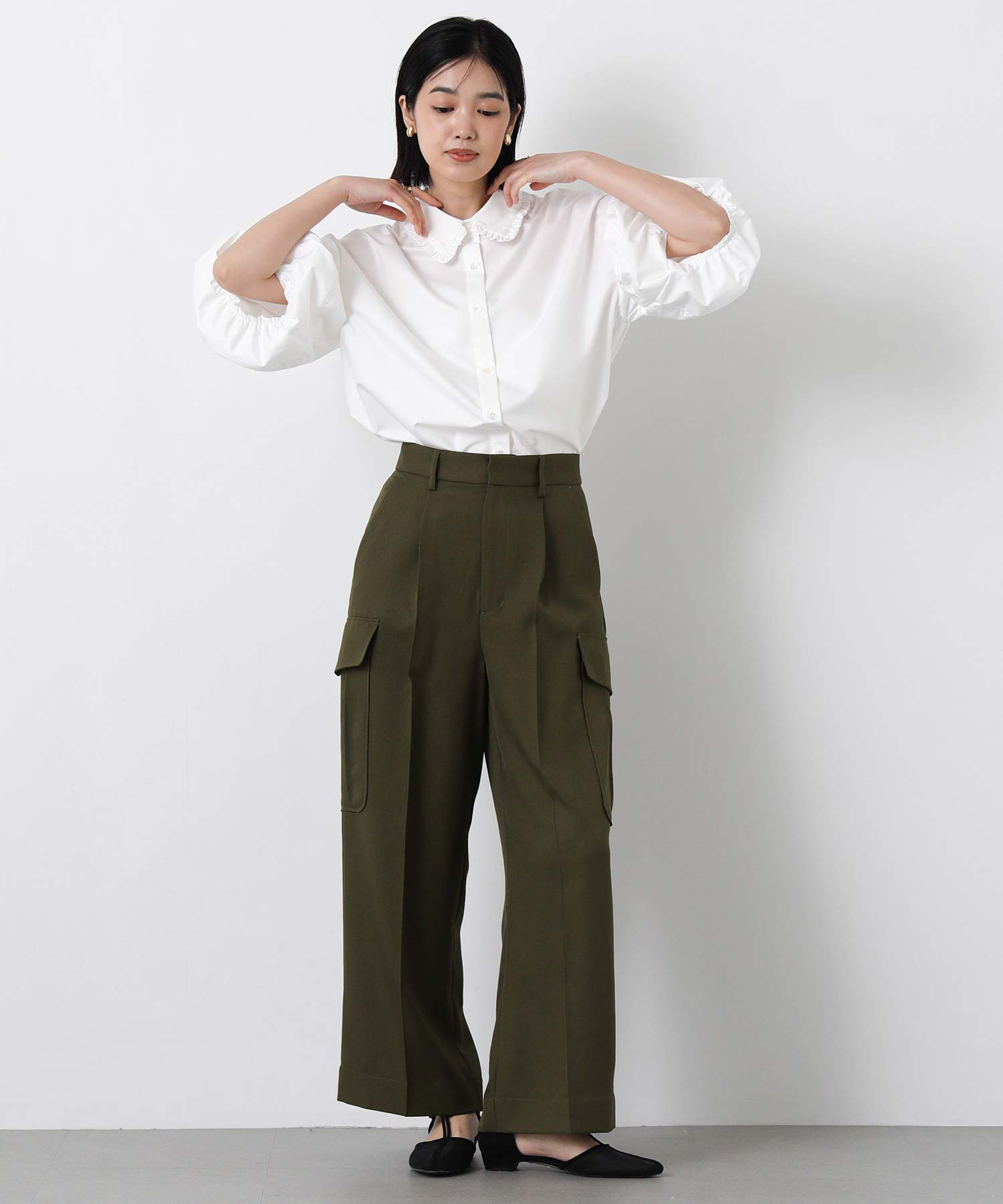 ふんわりとした袖のボリュームに、襟元のさりげないフリルが華やかさをプラス。