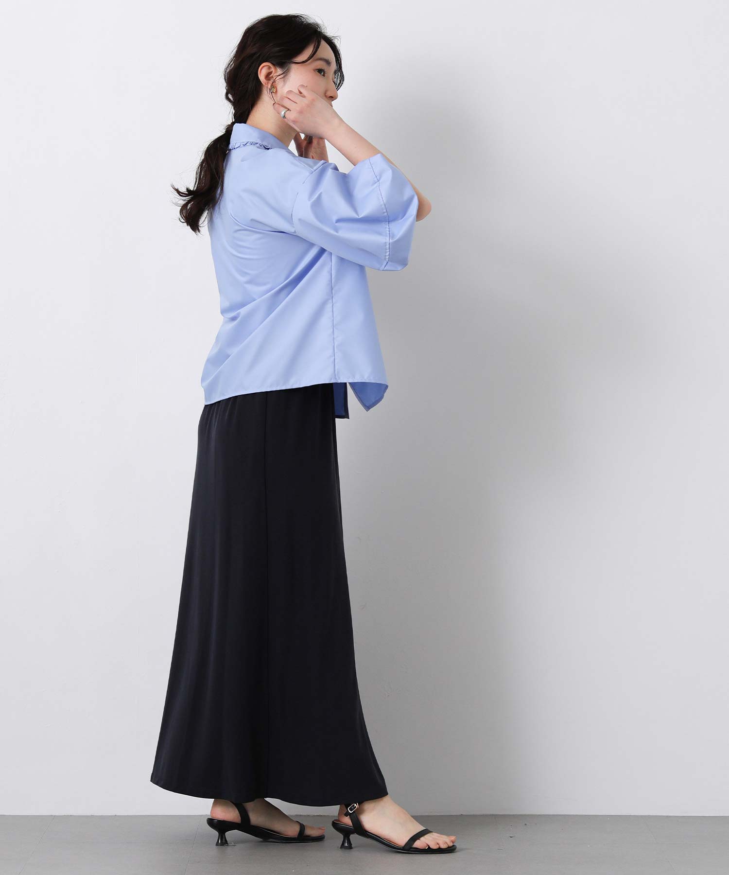 長めの袖丈と柔らかなシルエットが、上品で女性らしい雰囲気を演出します。