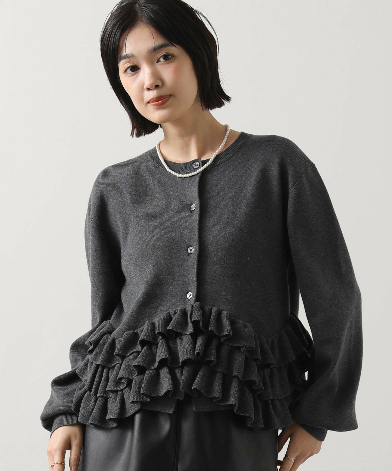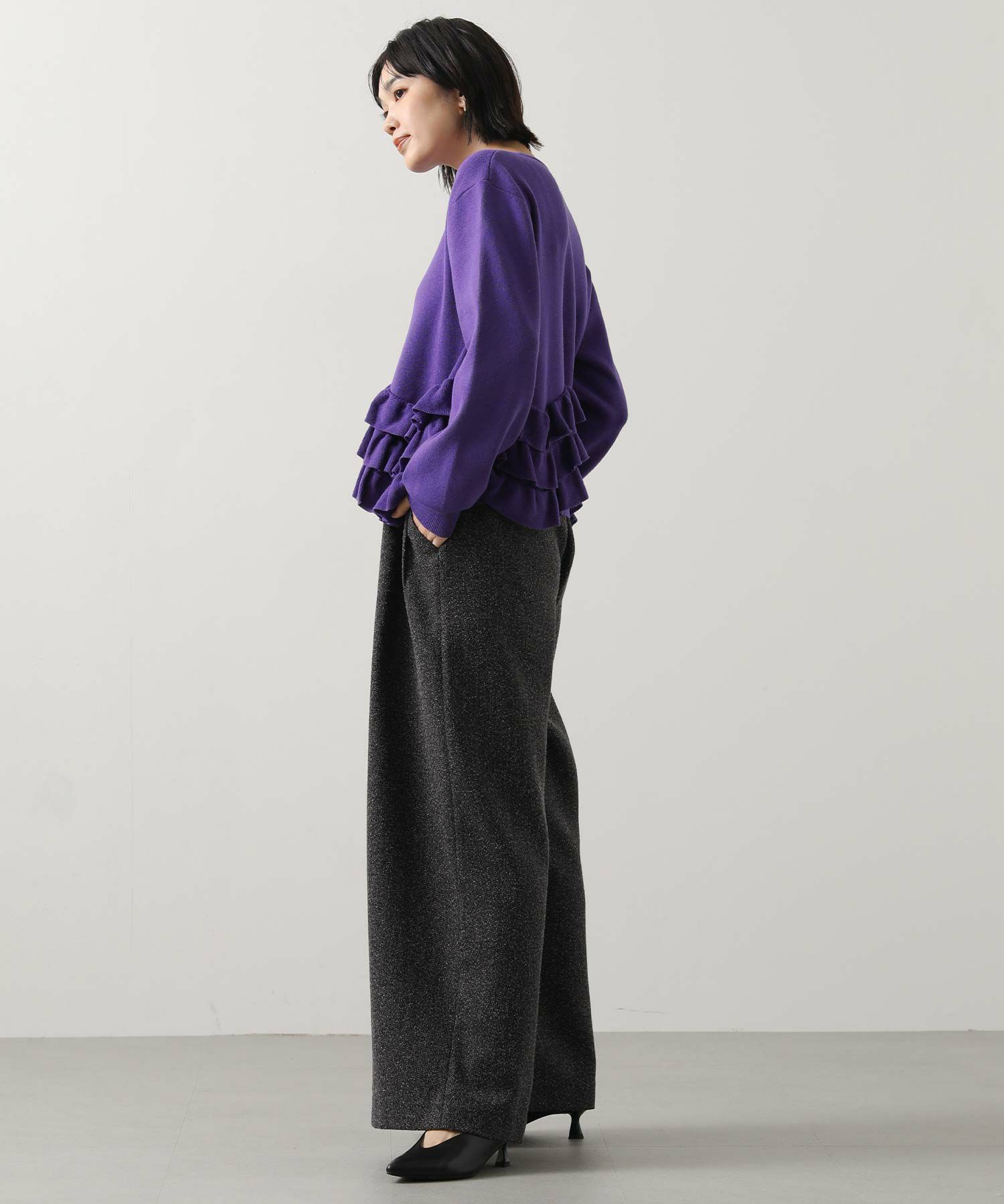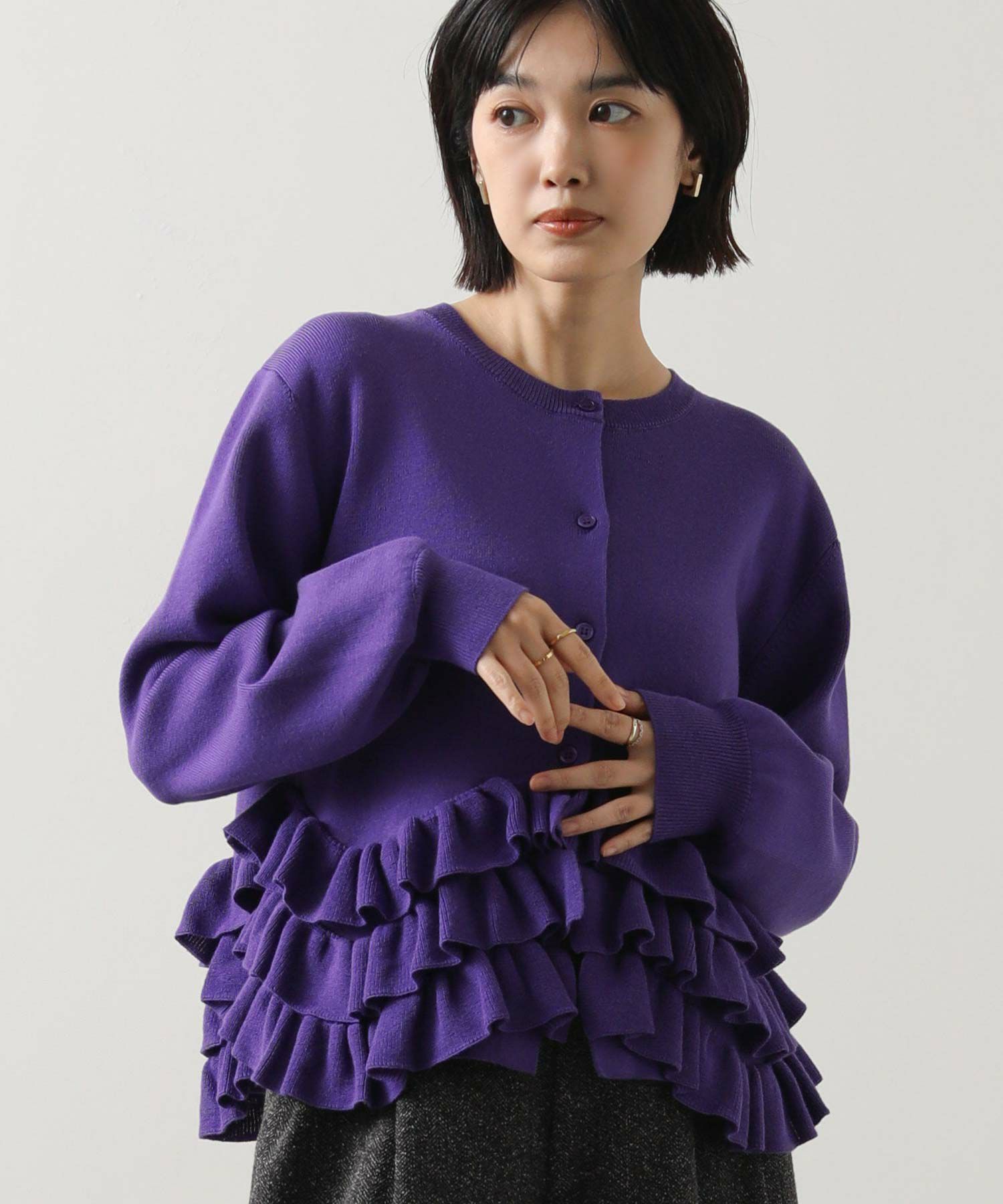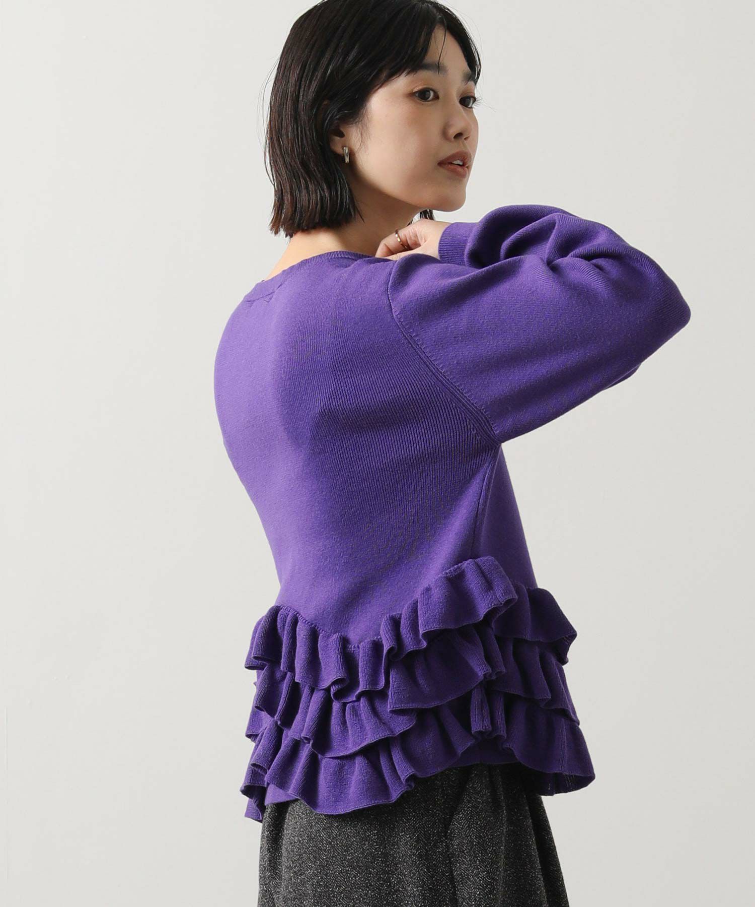 ニットの編みで作るフリルをティアードにして付けることによって、新しいフリルの見え方を表現。