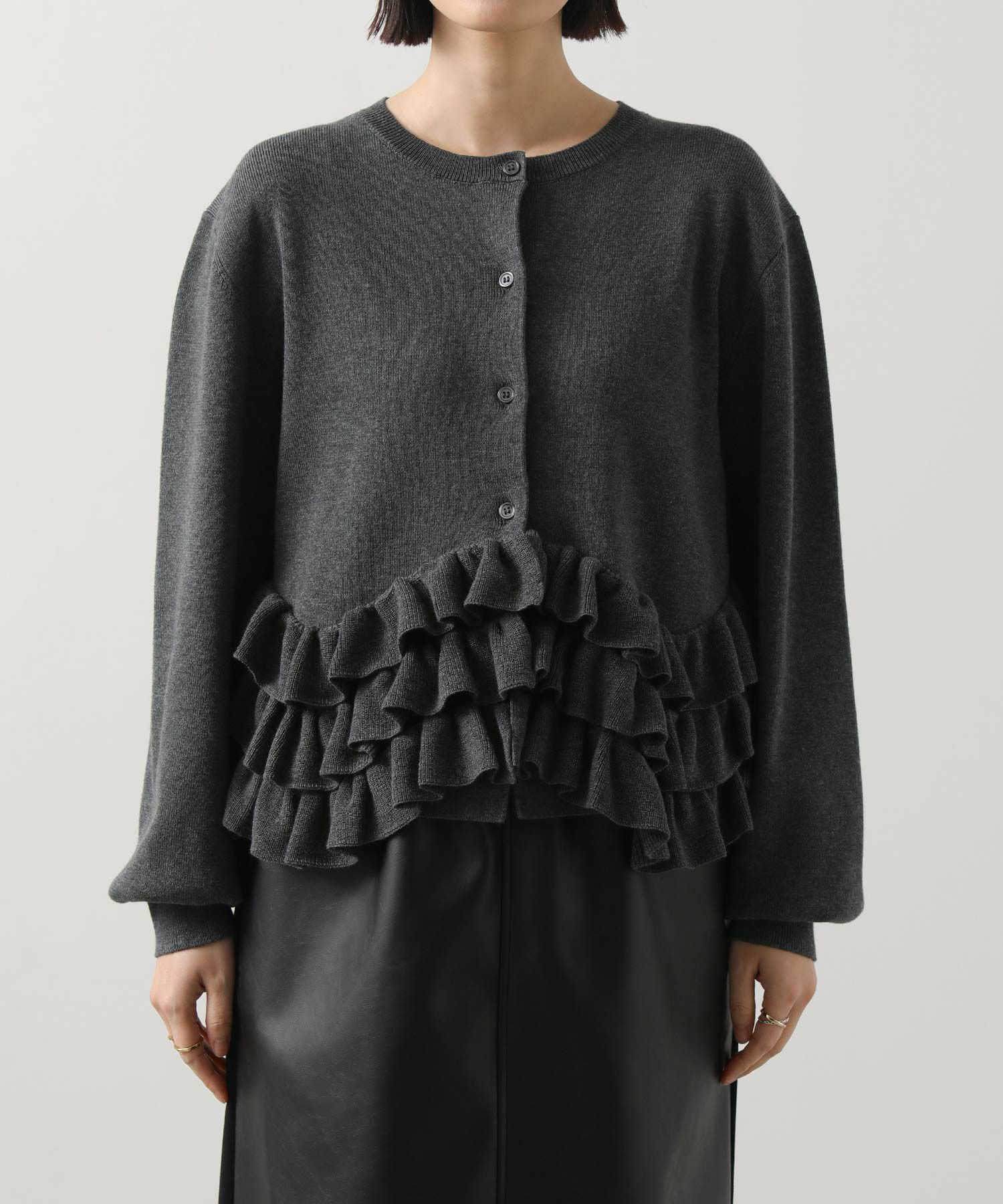 【RAWFUDGE(ローファッジ)】から、モードに着こなすヘムフリルニットカーデをセレクト。