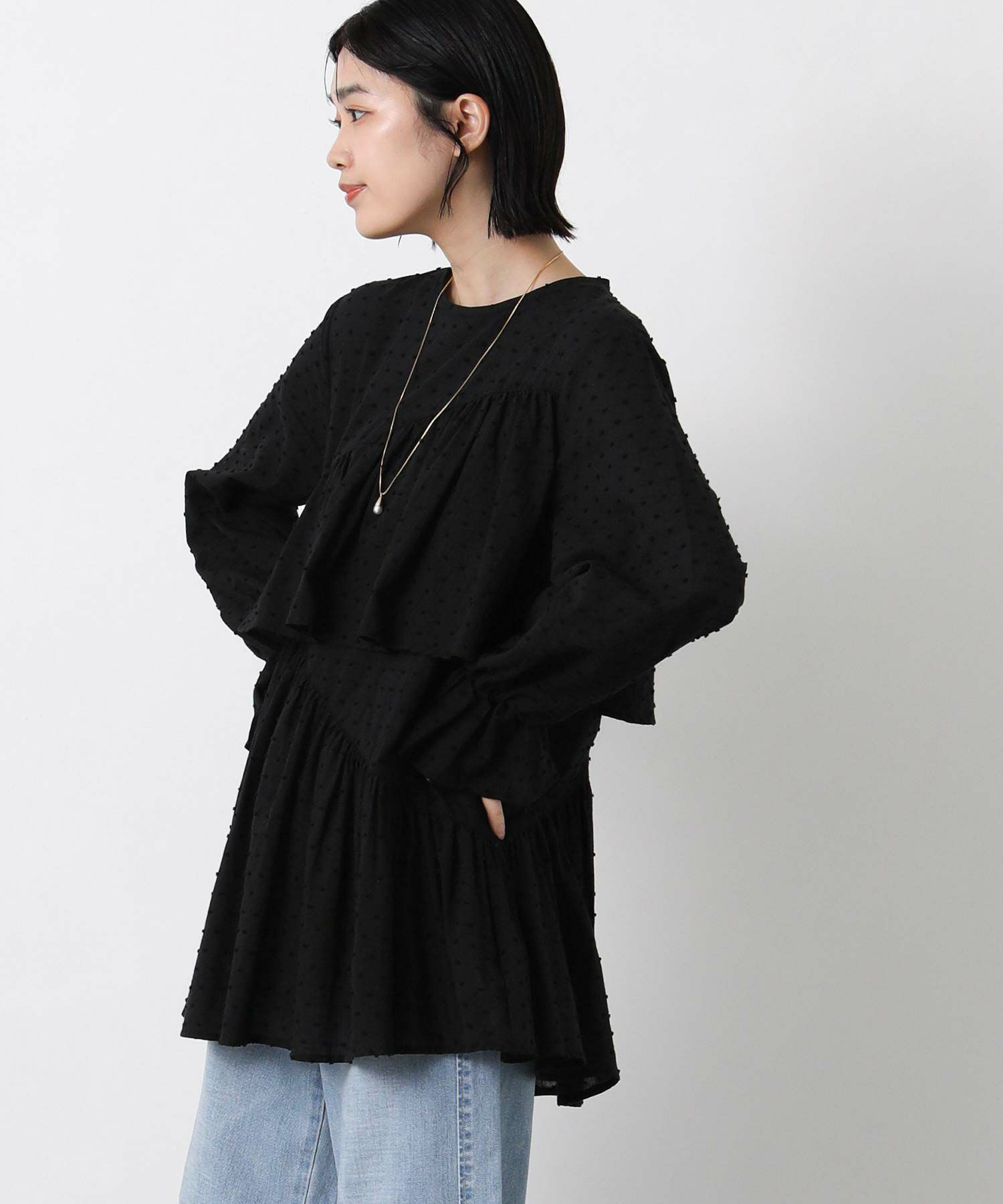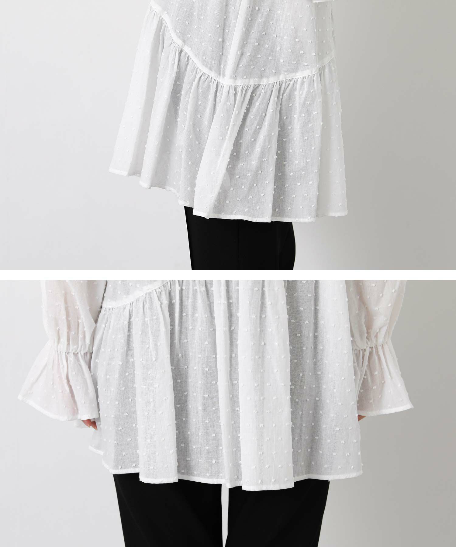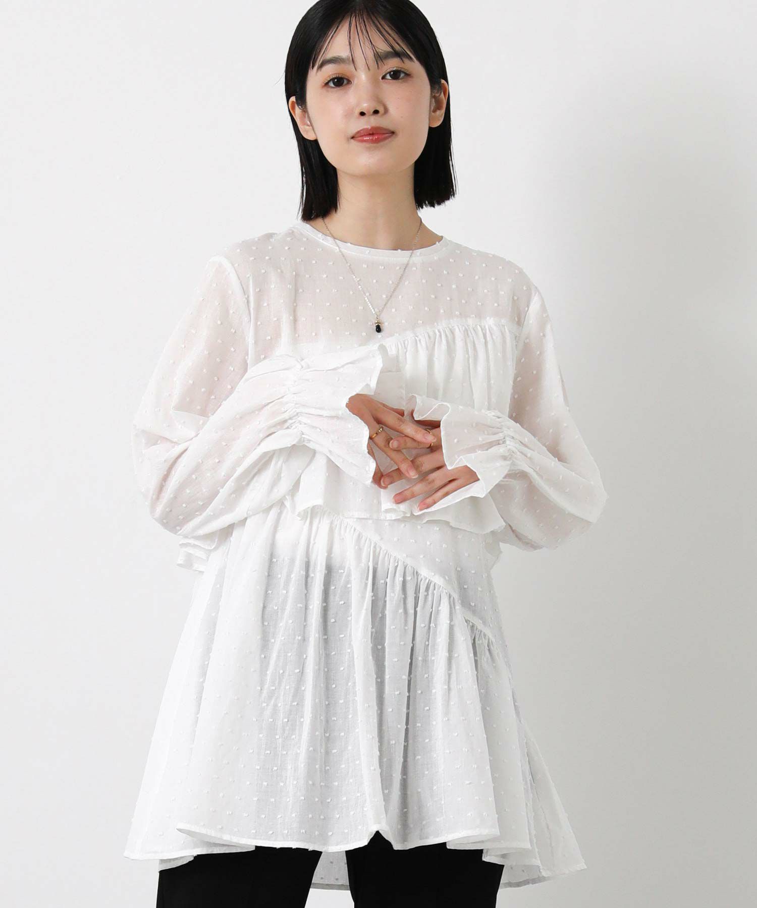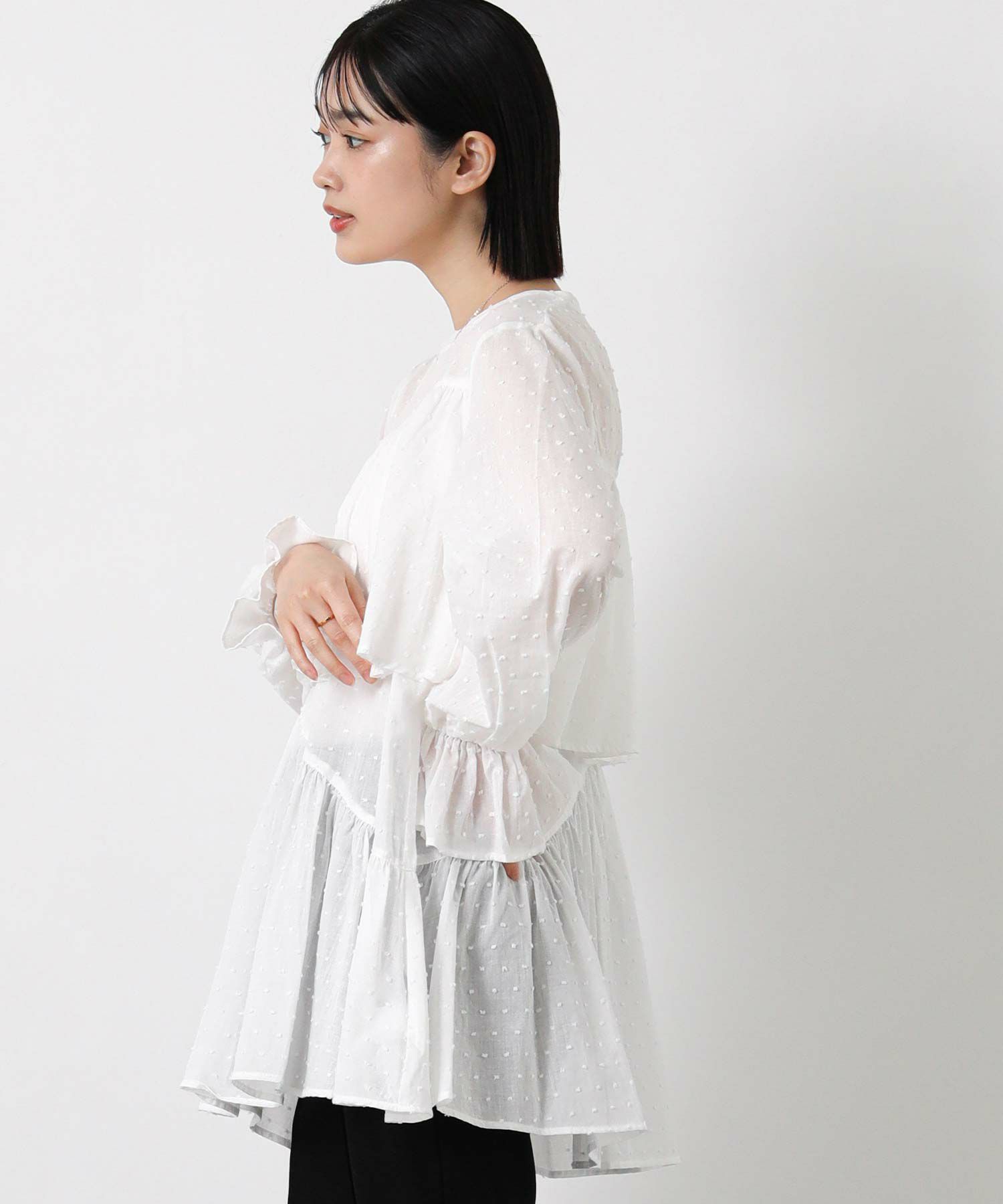 やや着丈長めで体型カバーとバランスの良いシルエットを両立し、袖口のフリルが手元に可愛らしさをプラスします。