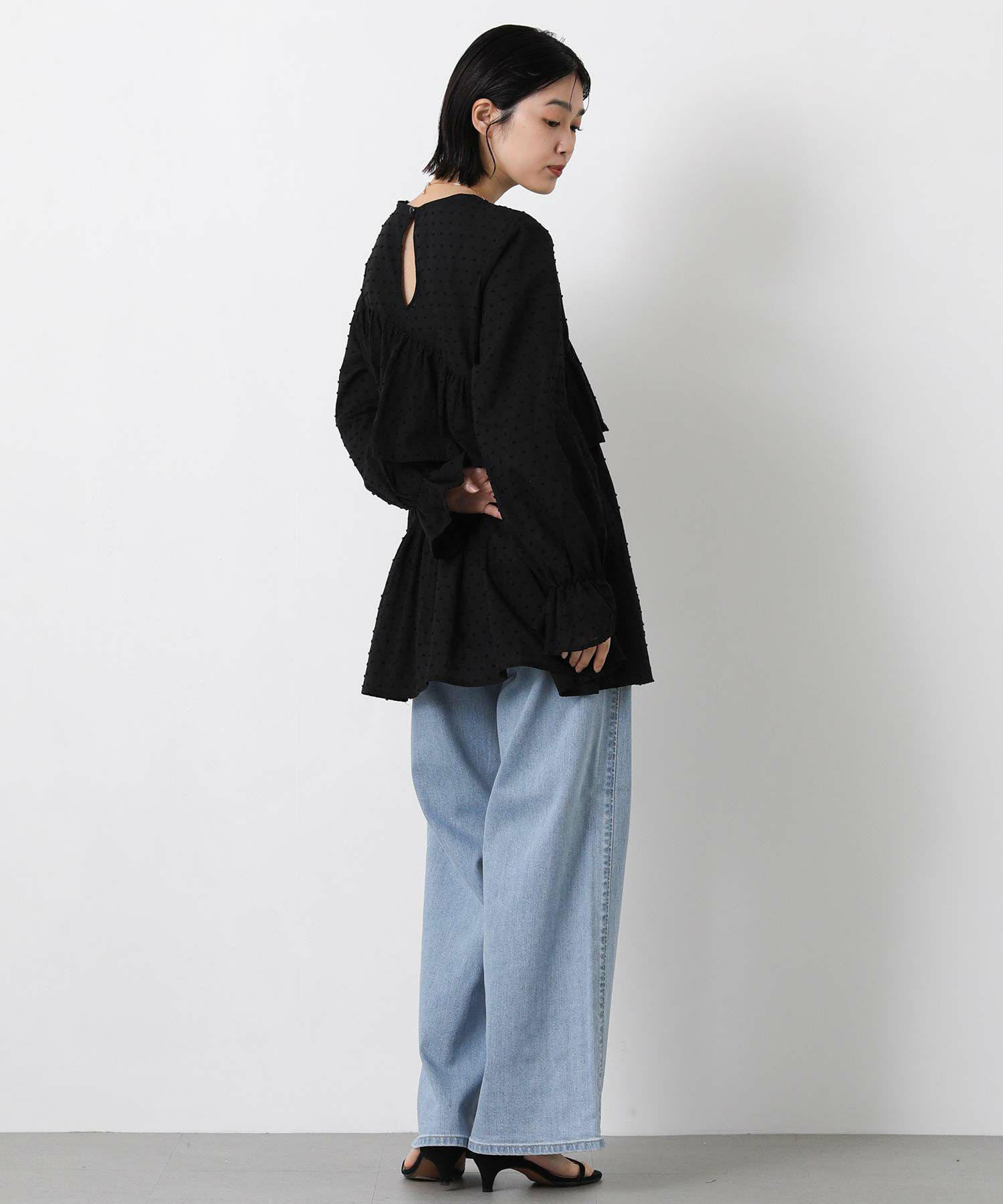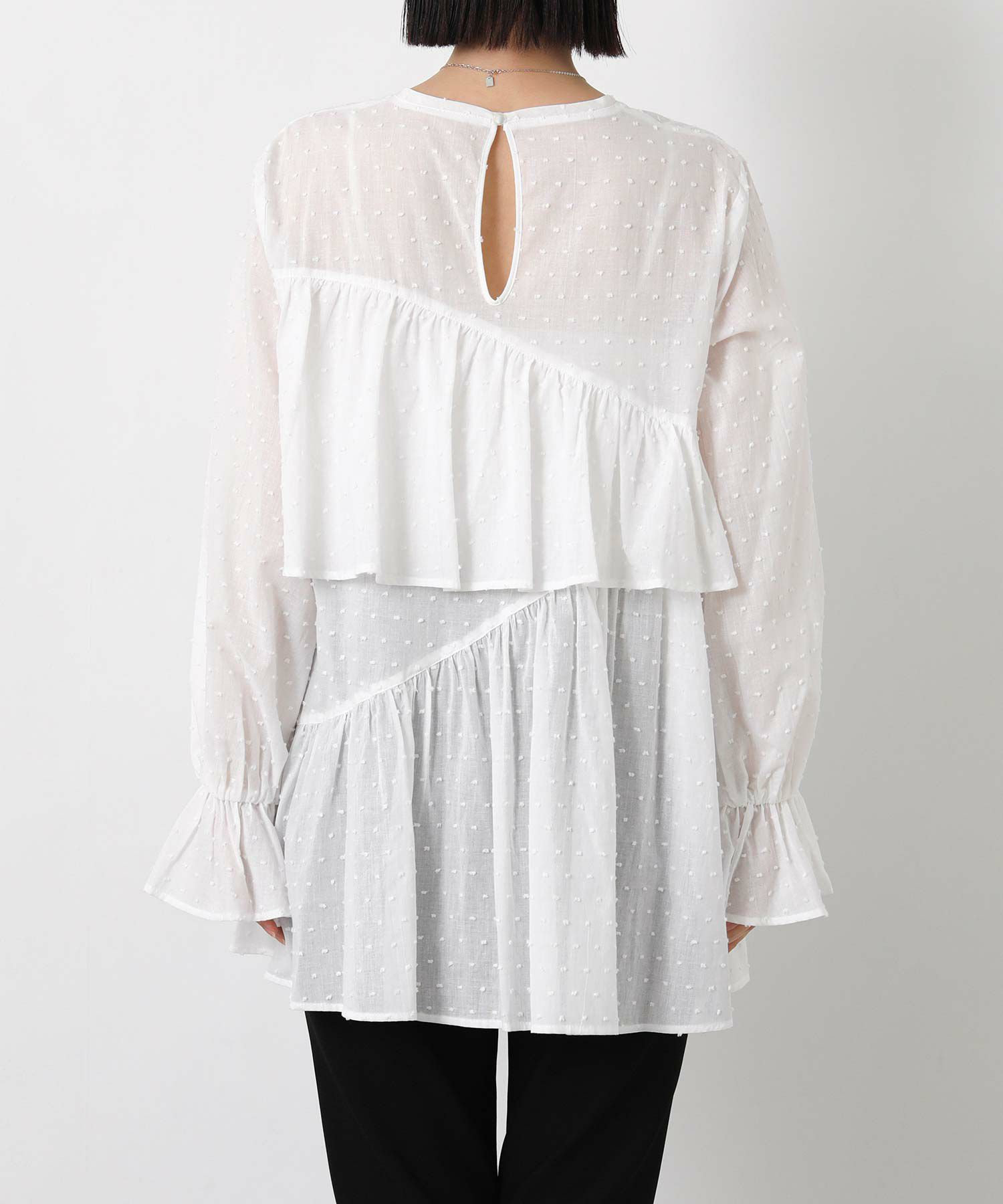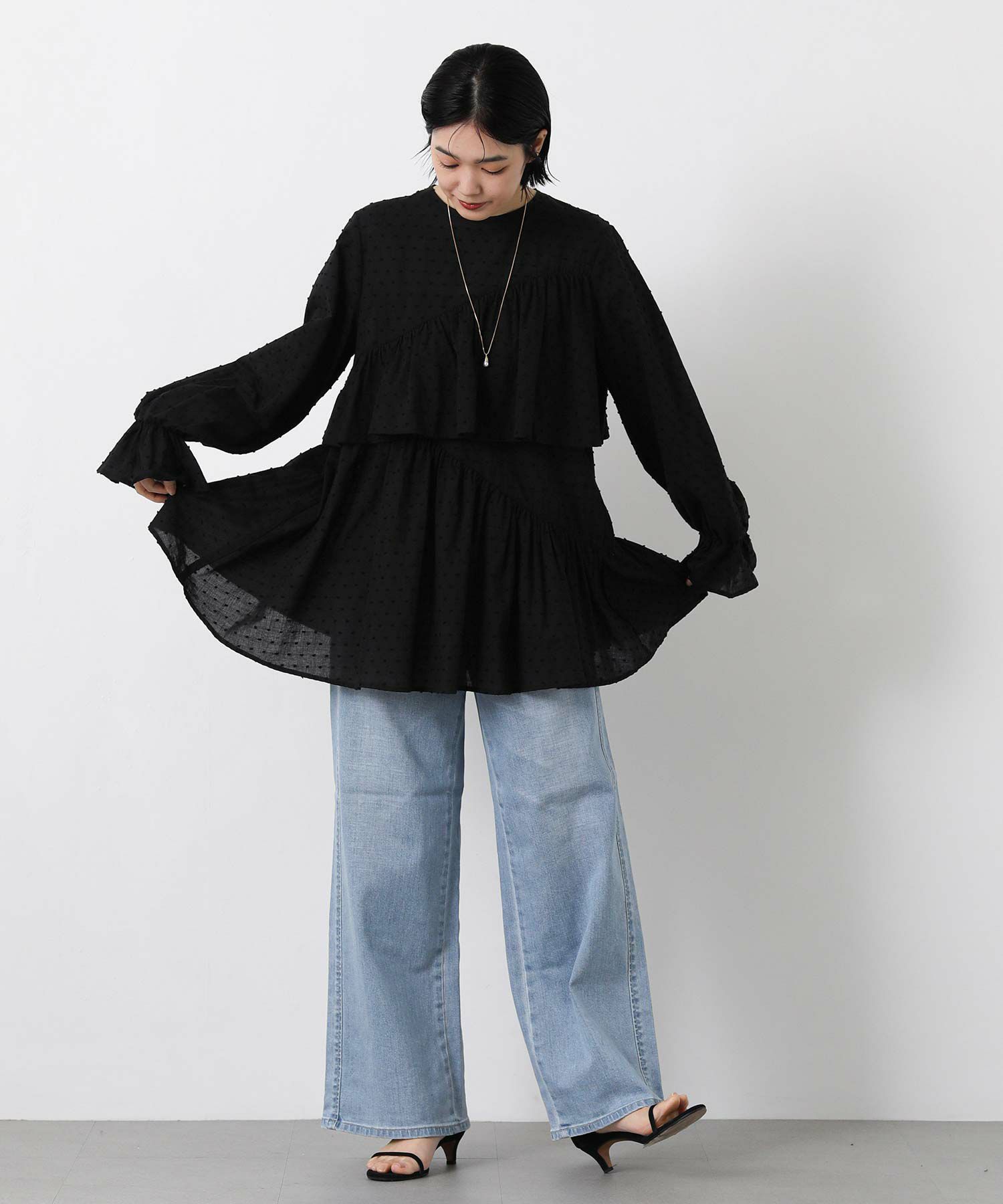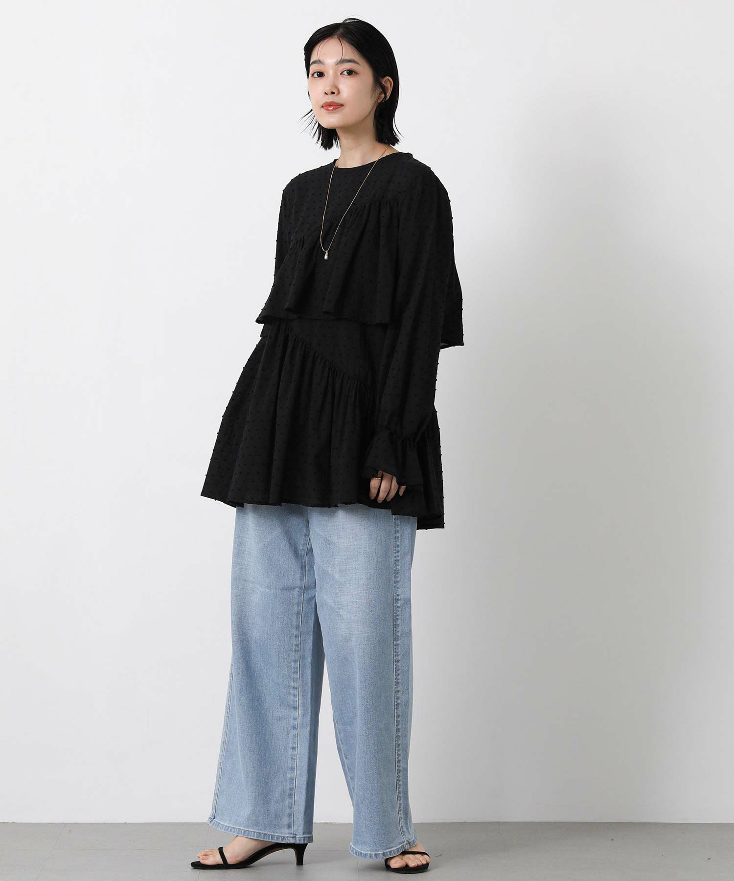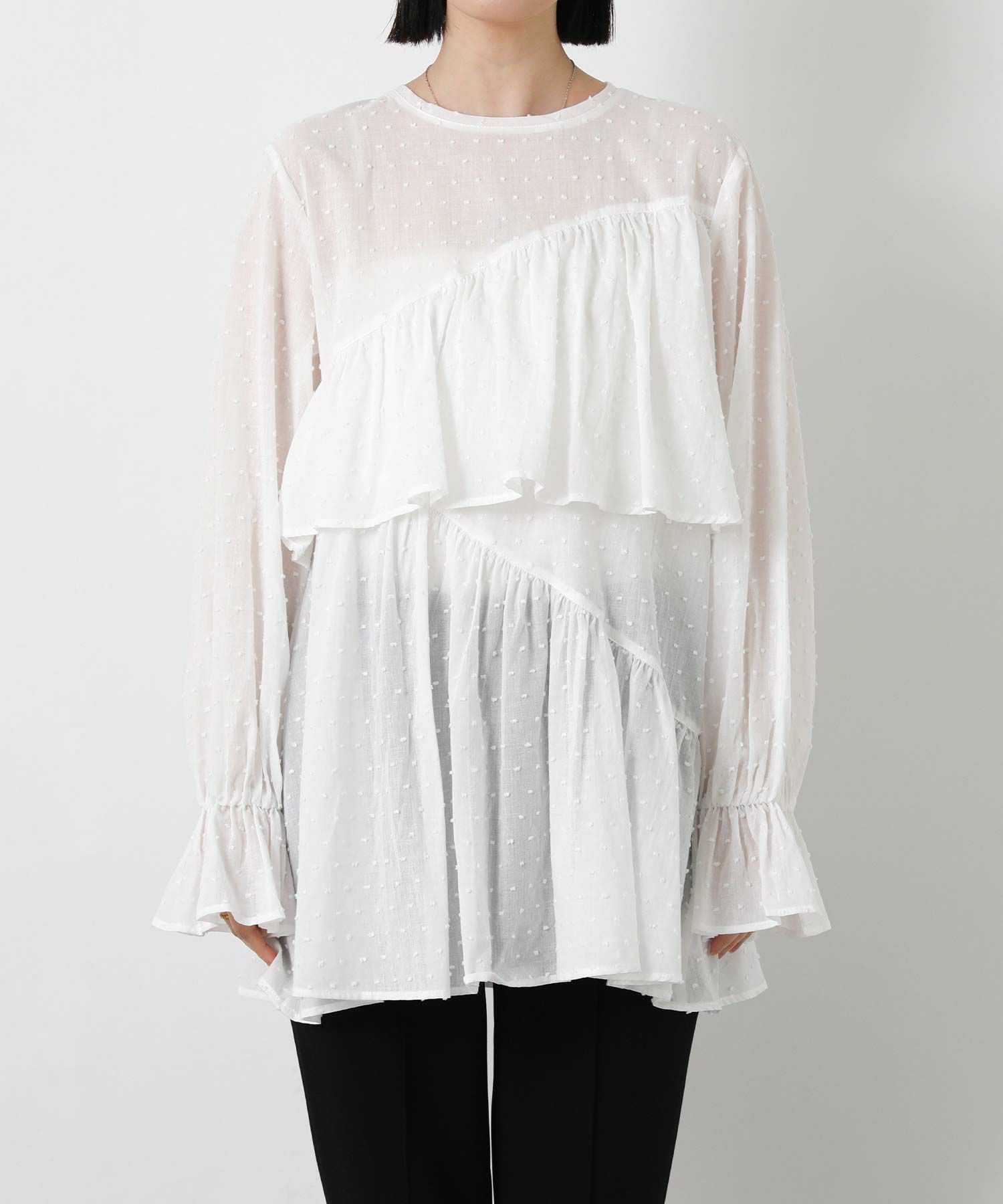 やや着丈長めで体型カバーとバランスの良いシルエットを両立し、袖口のフリルが手元に可愛らしさをプラスします。