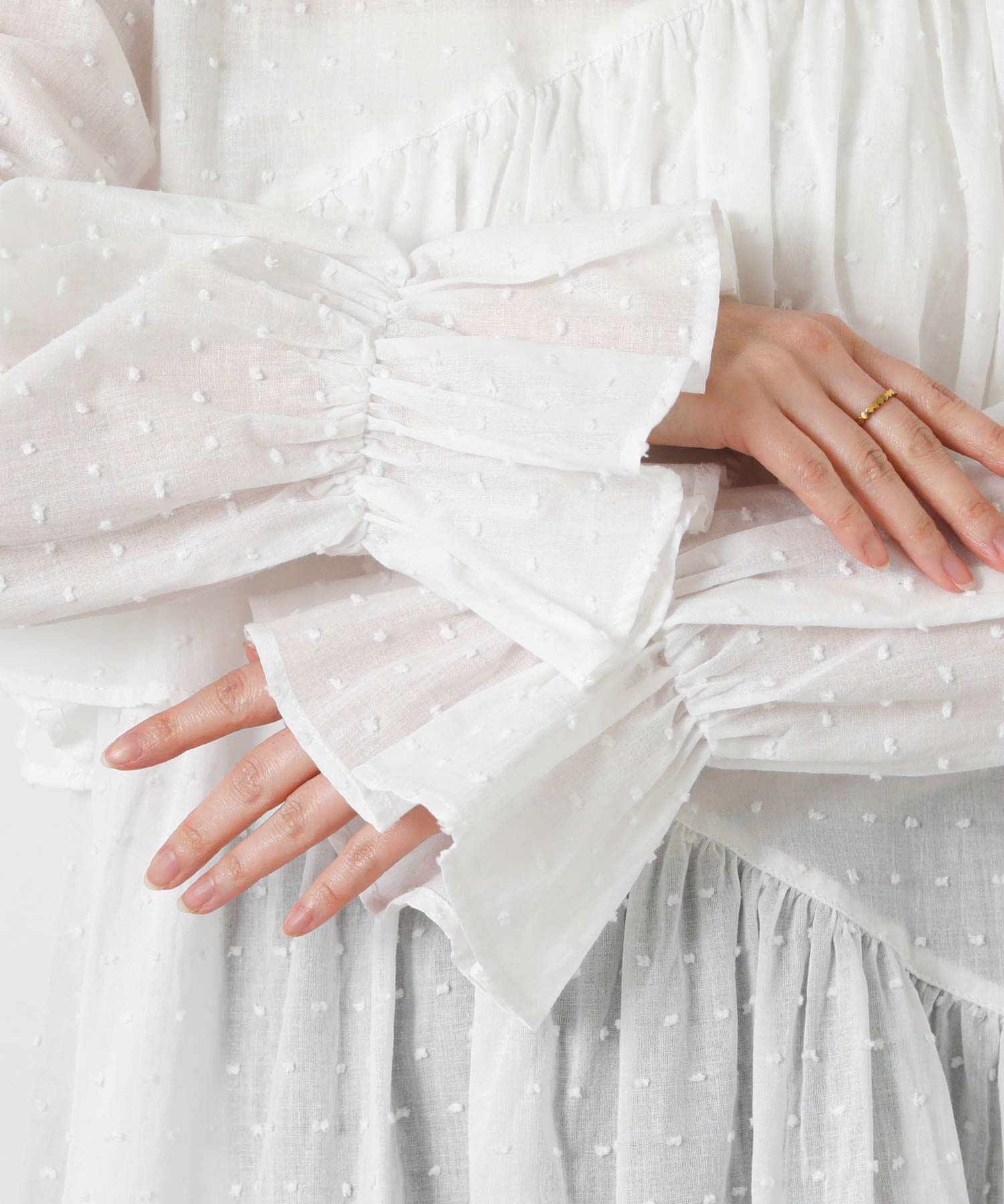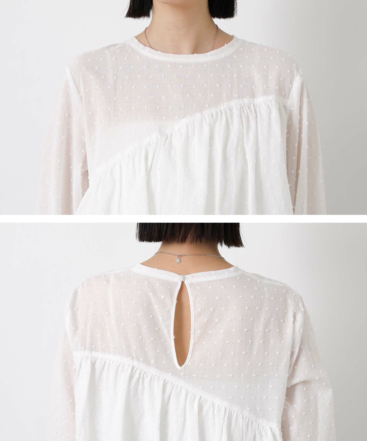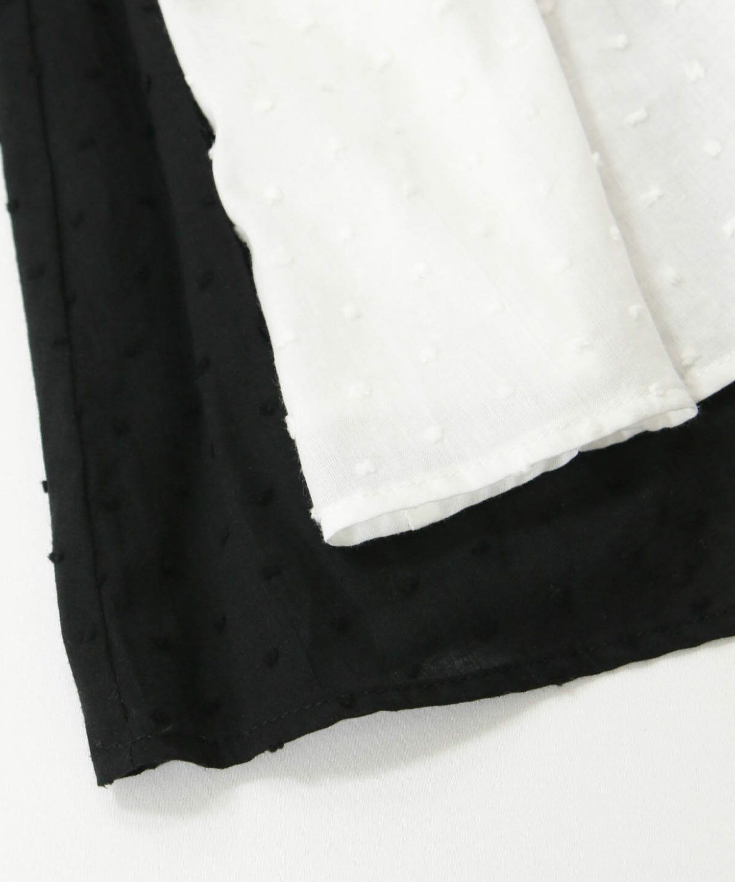 ドビー織りによる立体的な表面感と繊細なドット柄が上品で、ほんのりシアーな透け感が春らしい軽やかな印象を演出します。