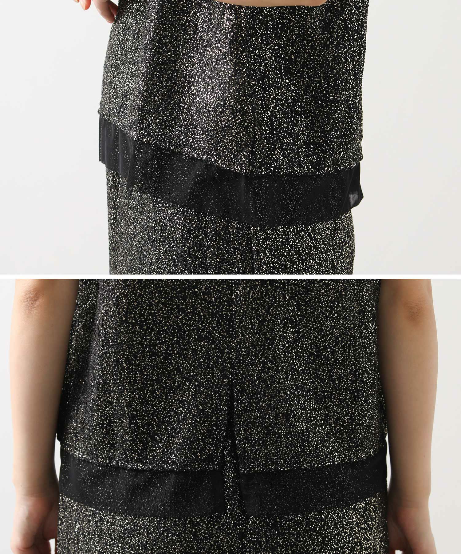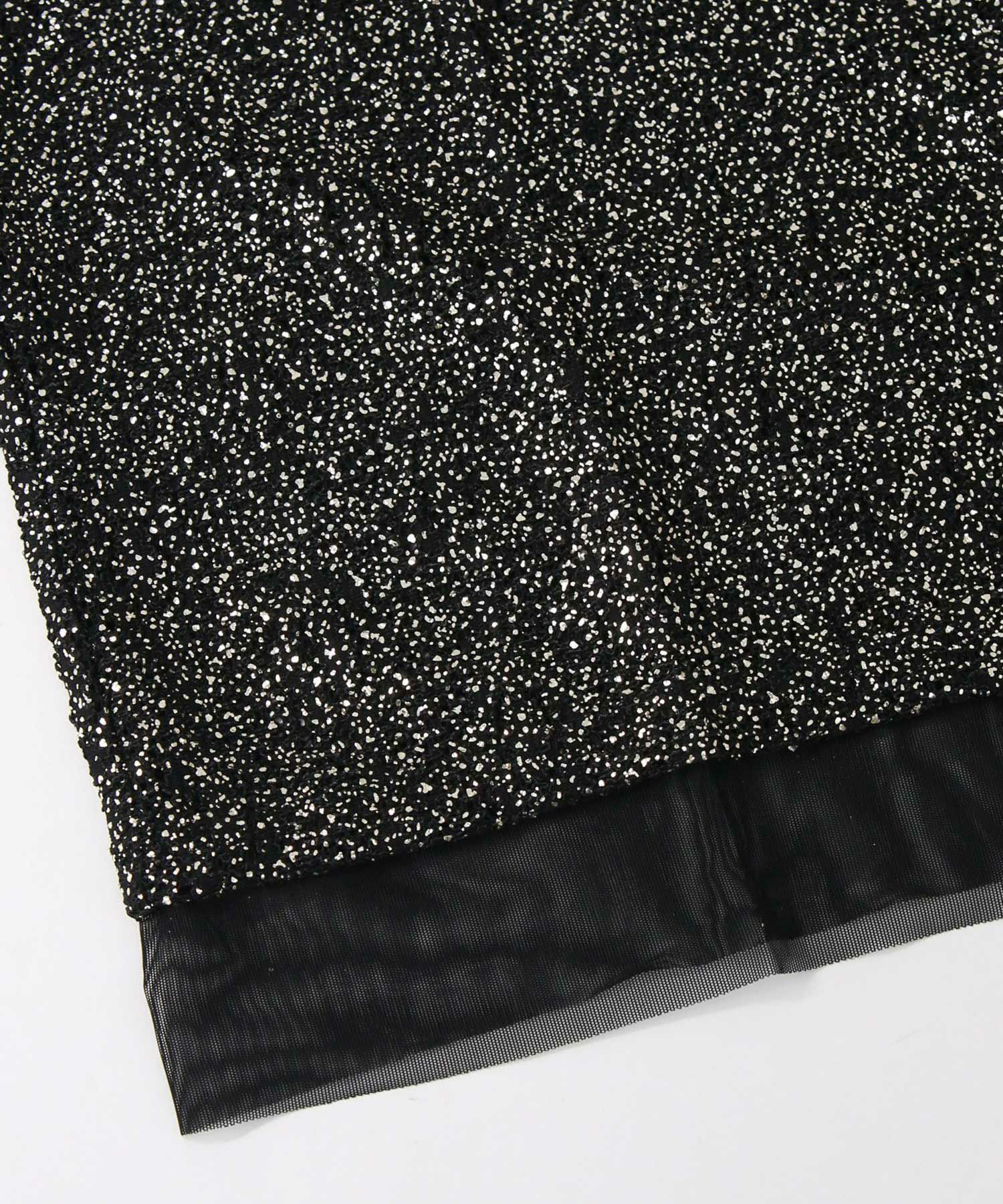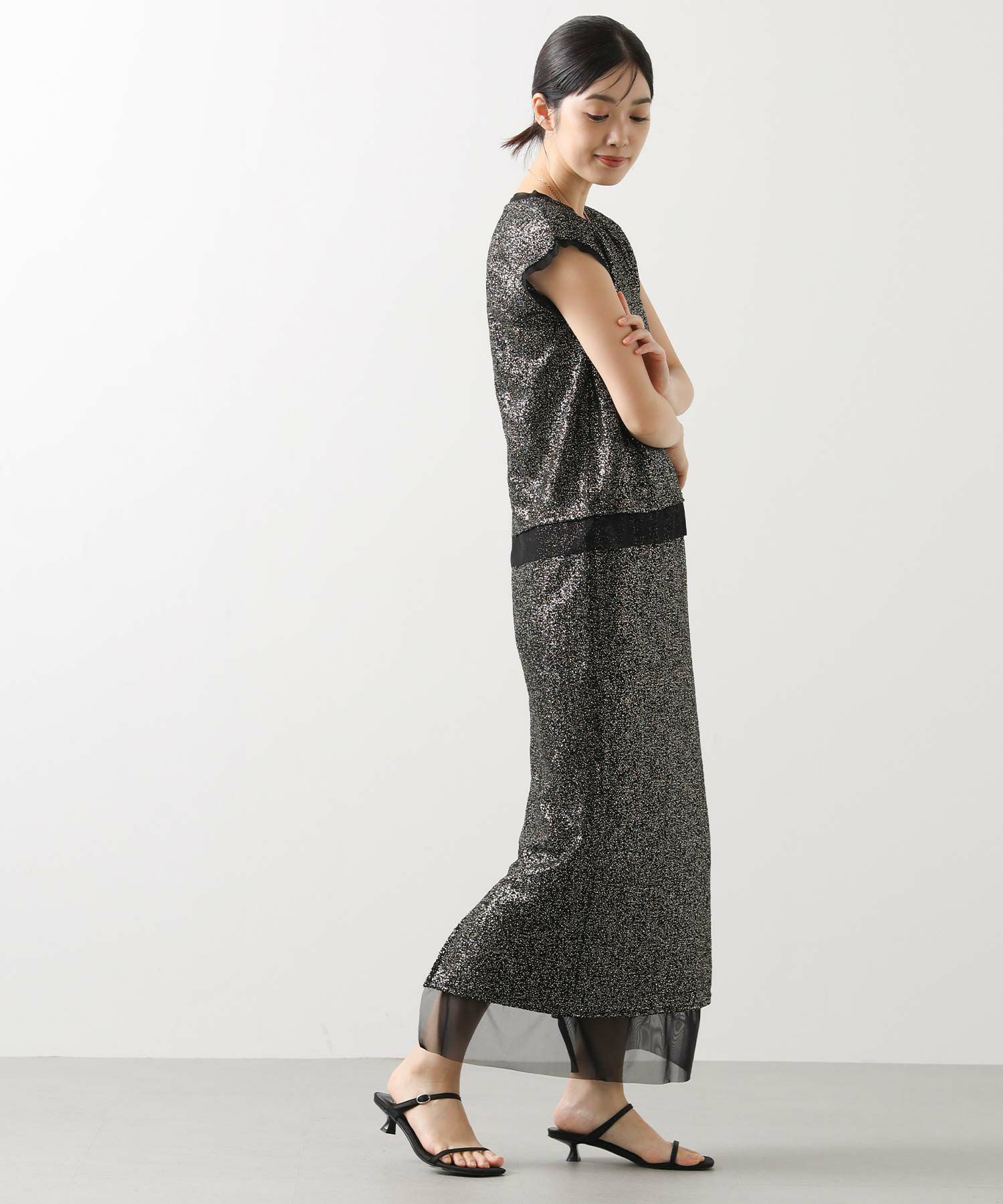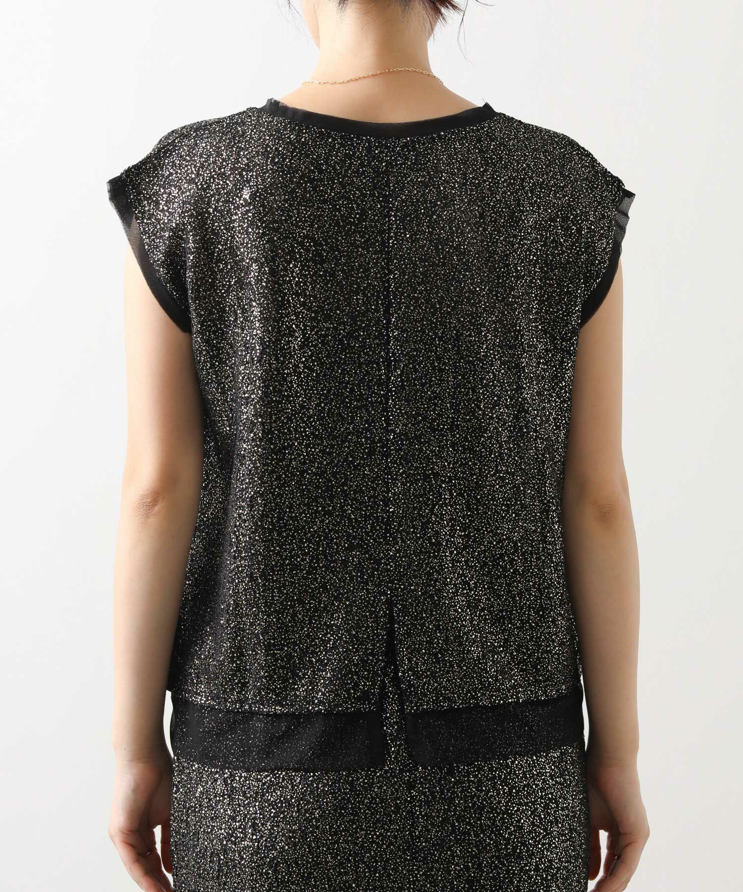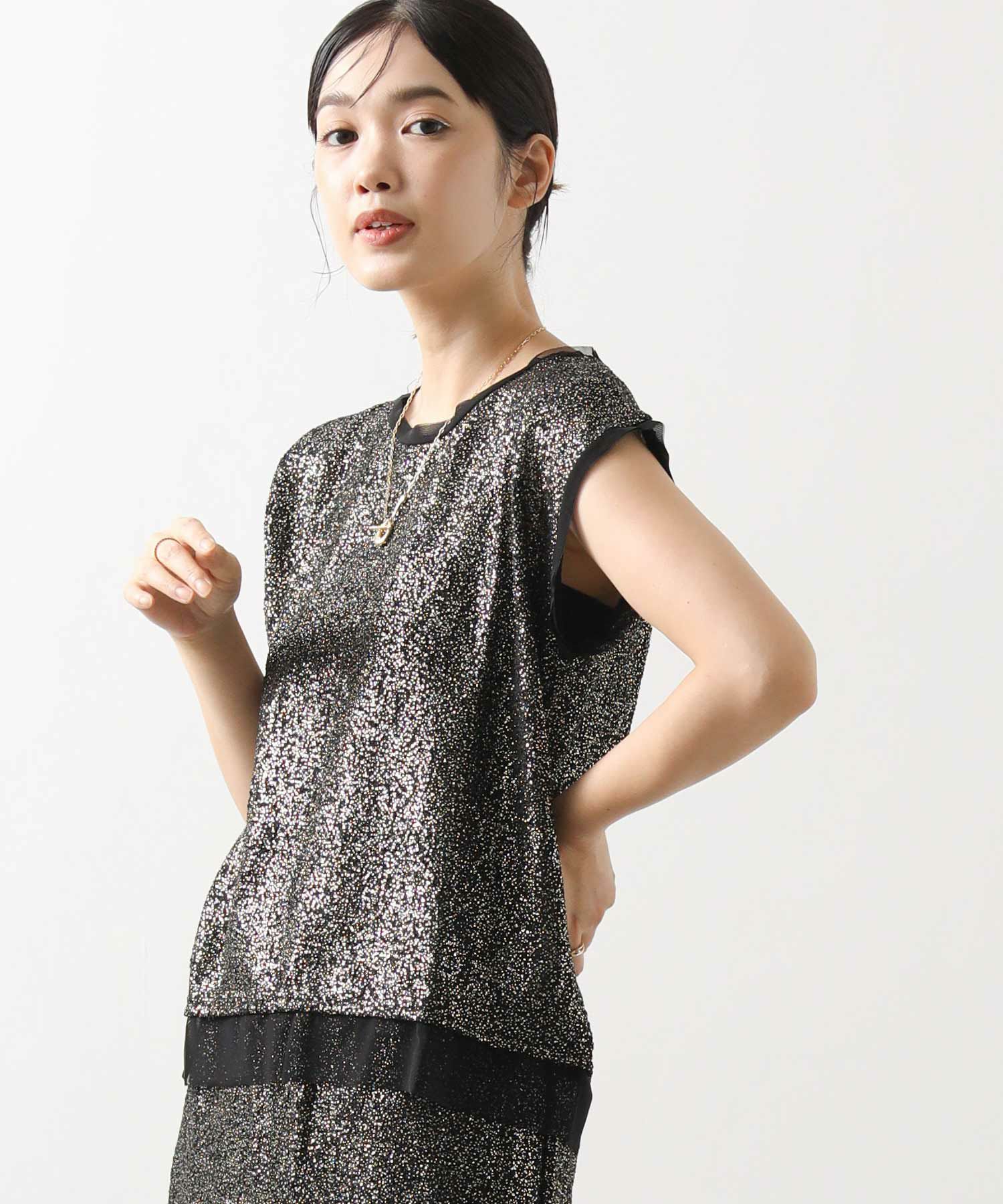凹凸感のあるストレッチカットソーに、箔プリントが施された華やかな素材を使用して、袖口と裾に軽やかなシアーチュールをドッキングさせています。