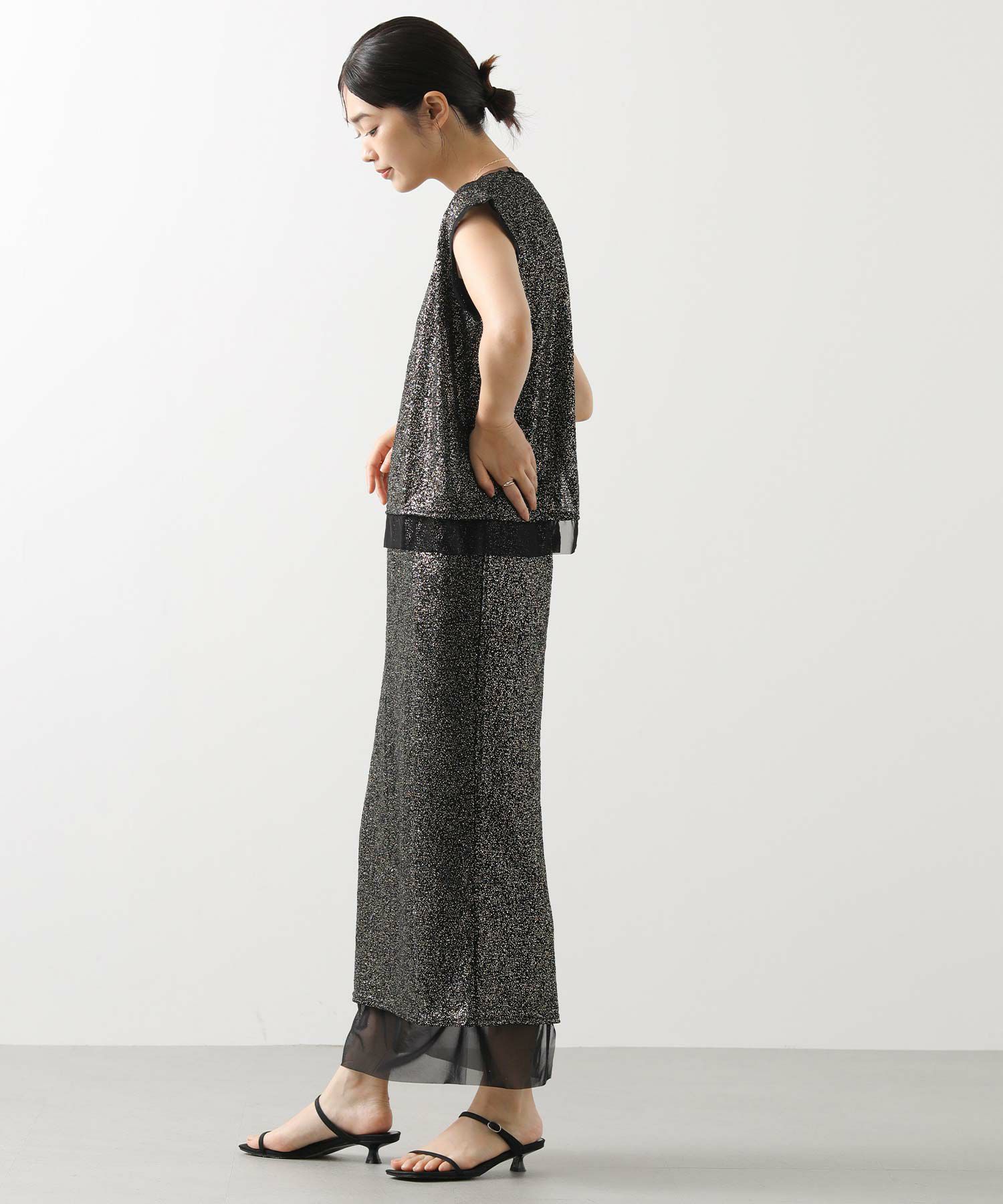 【Mewl(ミュール】から、フランス語でブリエ(輝く)のような、キラキラした箔プリントを施したカットソータンクトップをセレクト。
