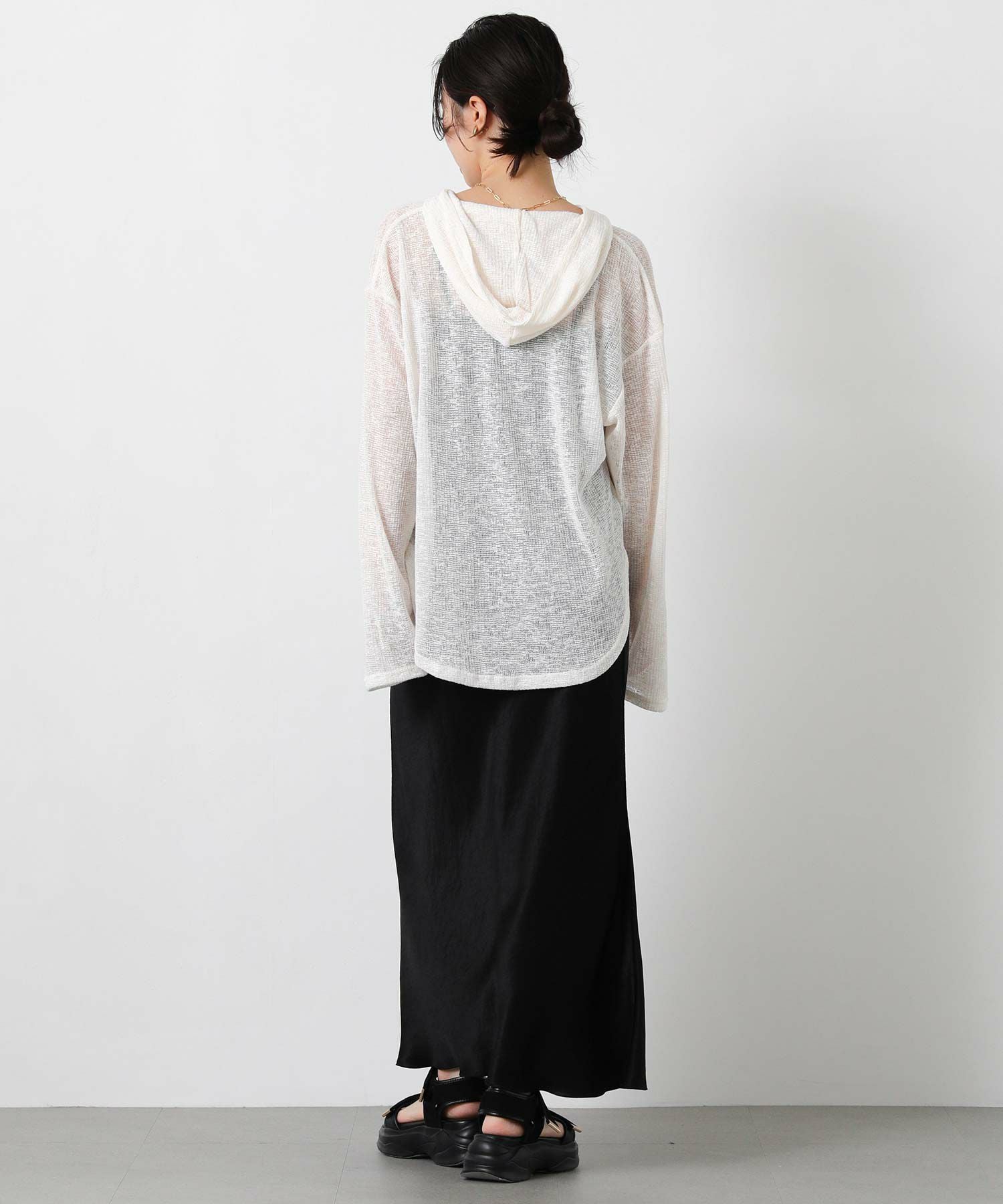 カジュアルな印象のフーディーを、ほんのりシアーな軽やかなカットソーでこなれ感のある1枚に。