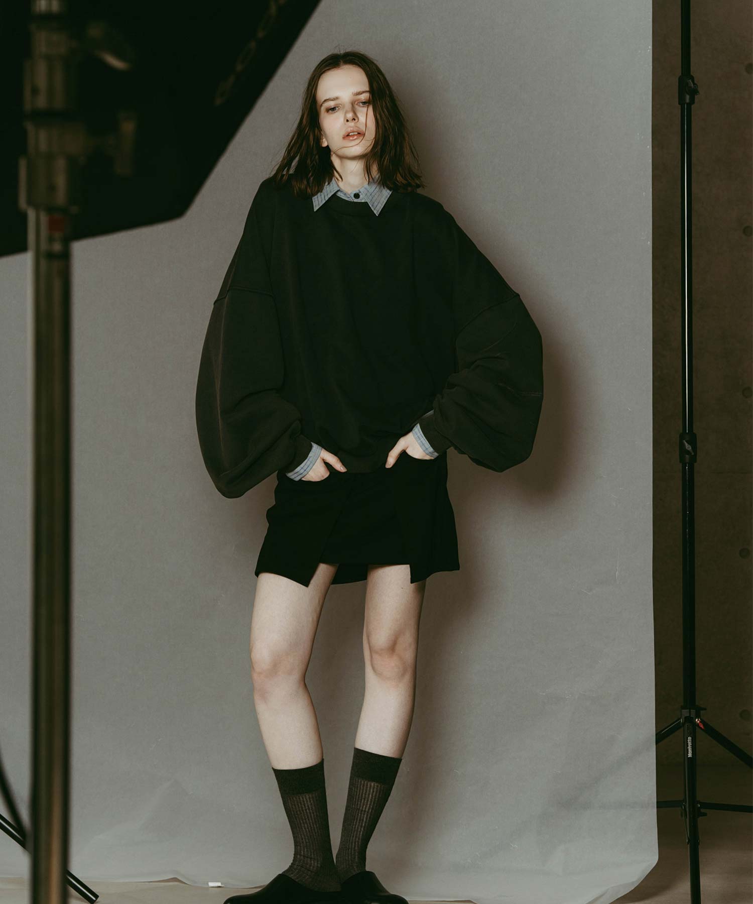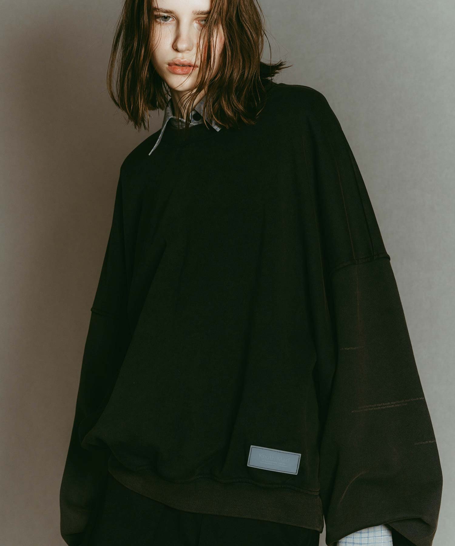 程よくドライな質感にカットオフ仕上げのネックや、前下がりのディテールの裾がラフさの中に奥行きを与えます。着るだけで空気を含んだような抜け感が生まれ、モードにもストリートにも振れるバランスの大人のスウェットです。