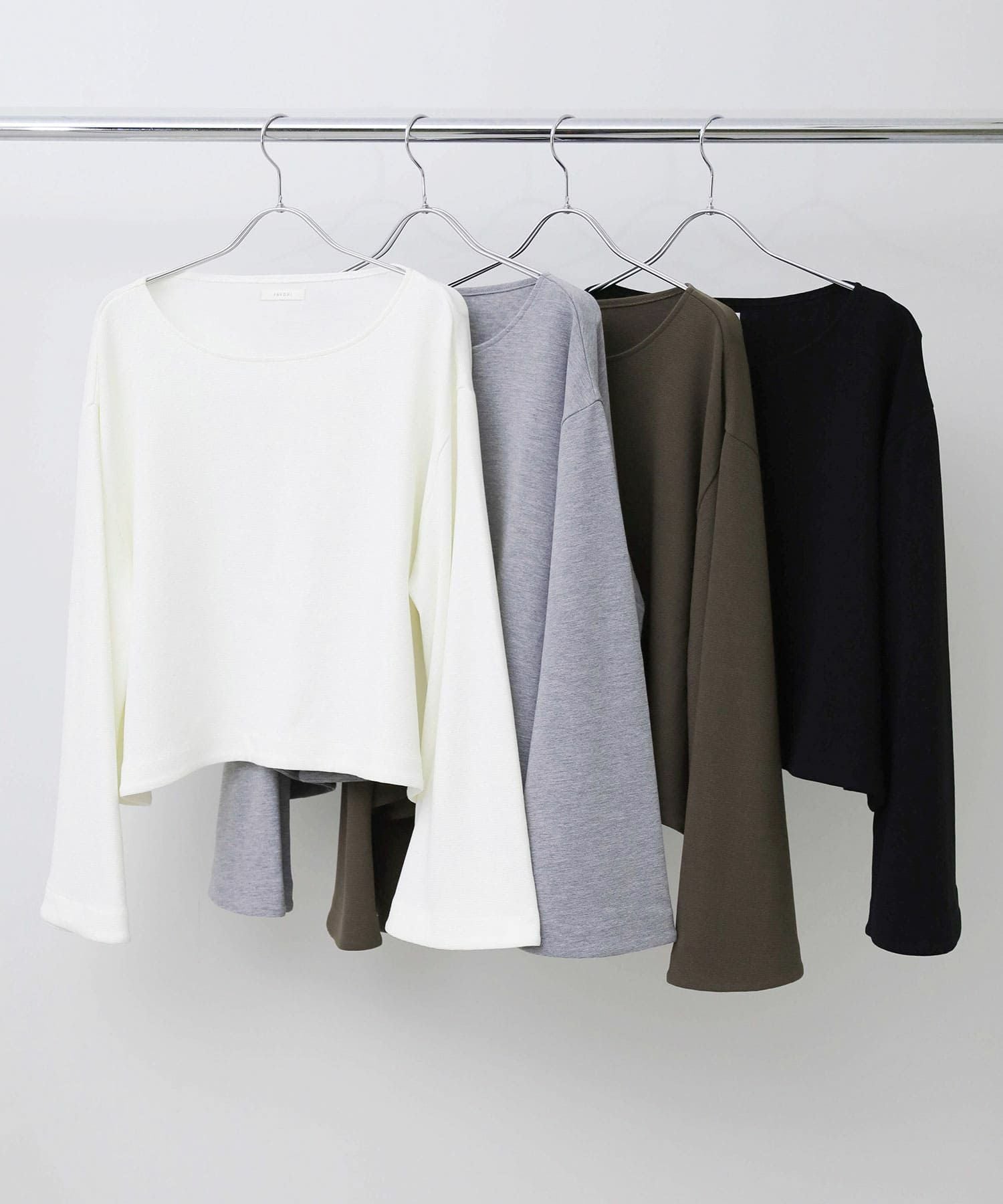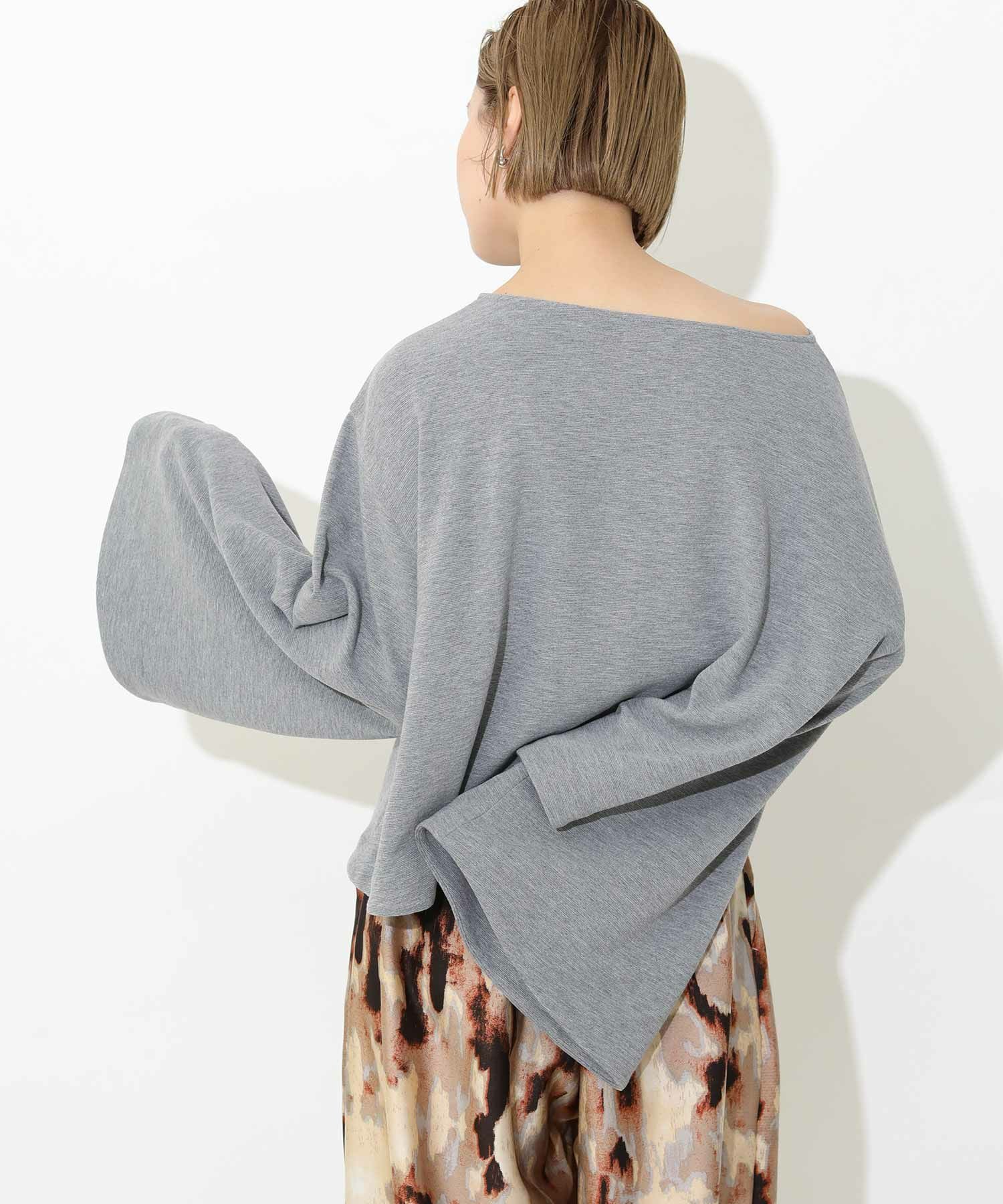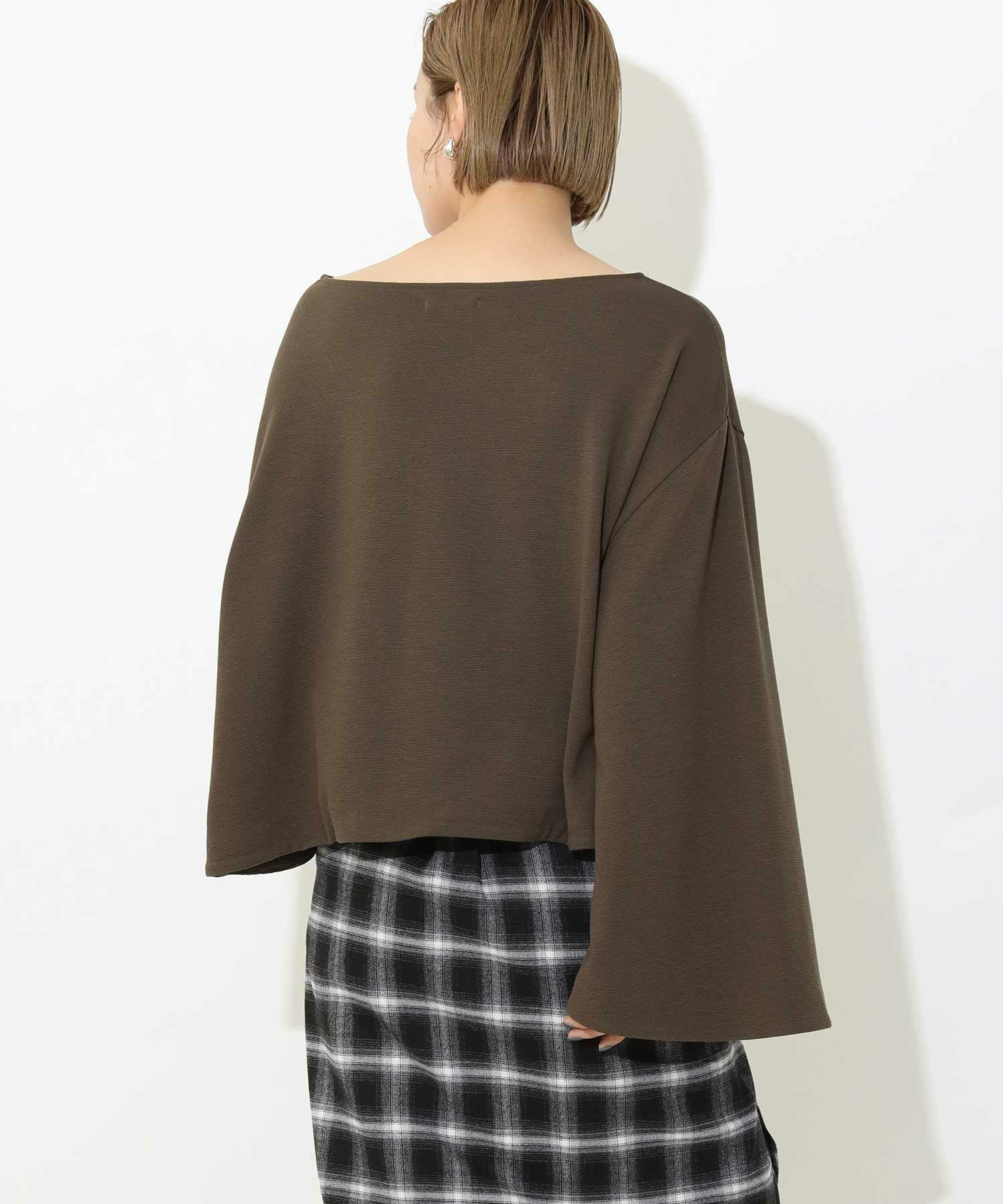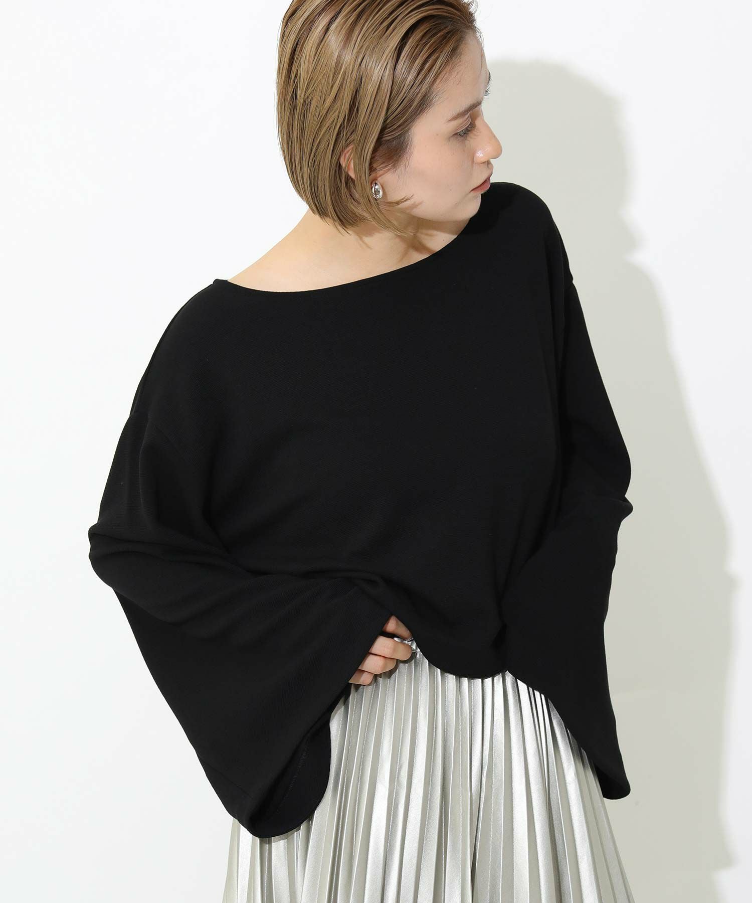 伸縮性が高く、ボディラインを拾わないリラックスしたシルエットがストレスフリーな着心地。広がりのあるフレアスリーブが手元に上品なニュアンスを与えます。デコルテを美しく見せるボートネックでよりエレガントな印象に。カジュアルなパンツを合わせたデイリースタイルから、スカート合わせのレディなスタイリングまで幅広く活躍できる一着です。