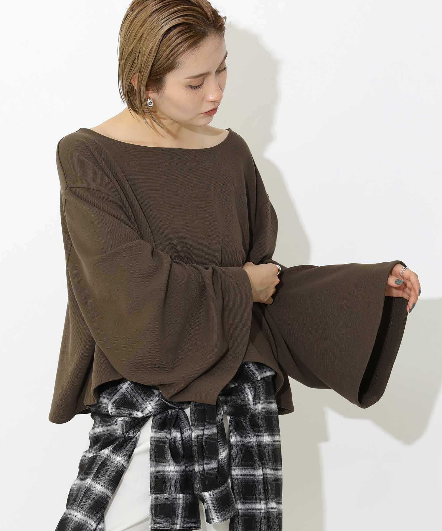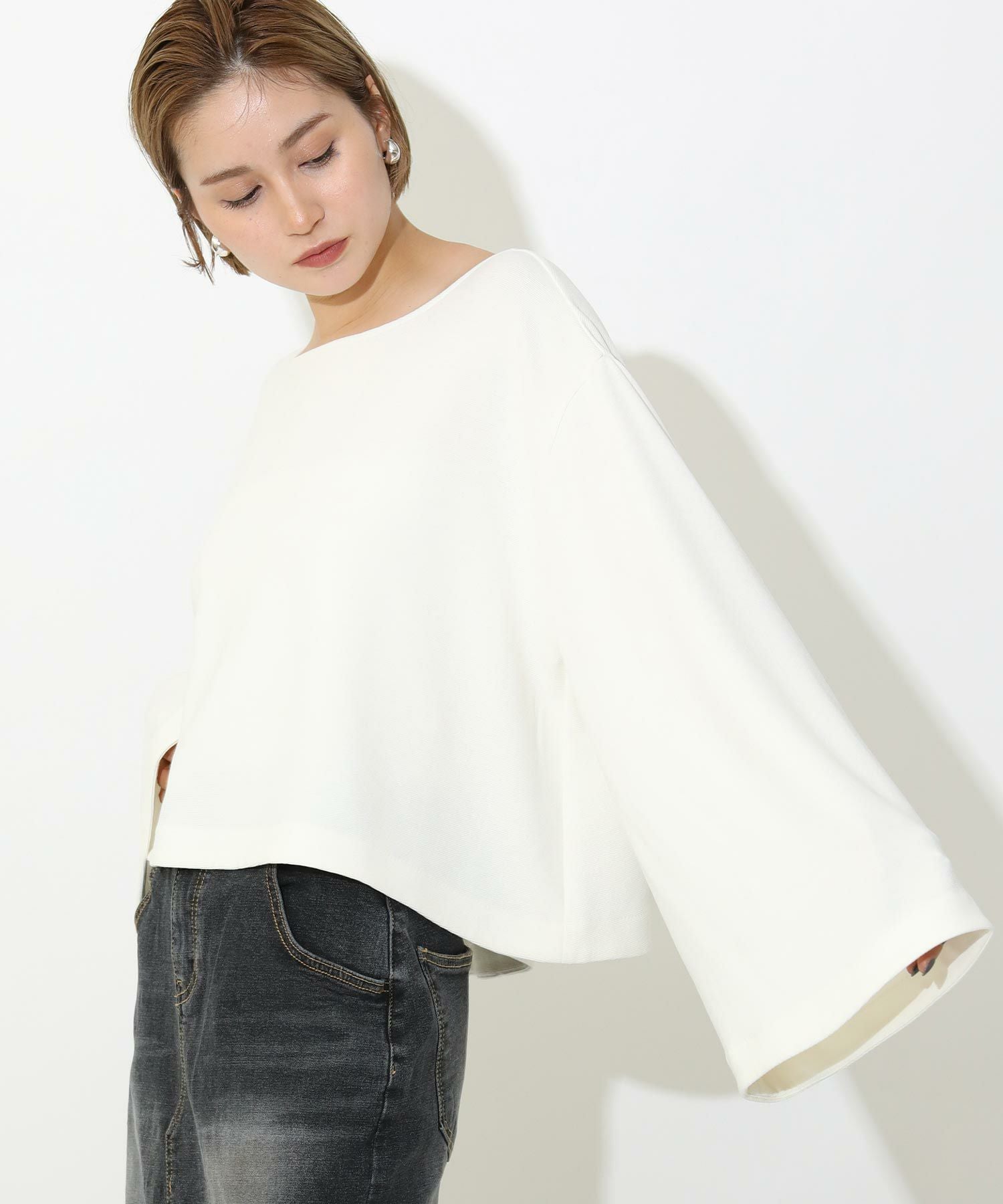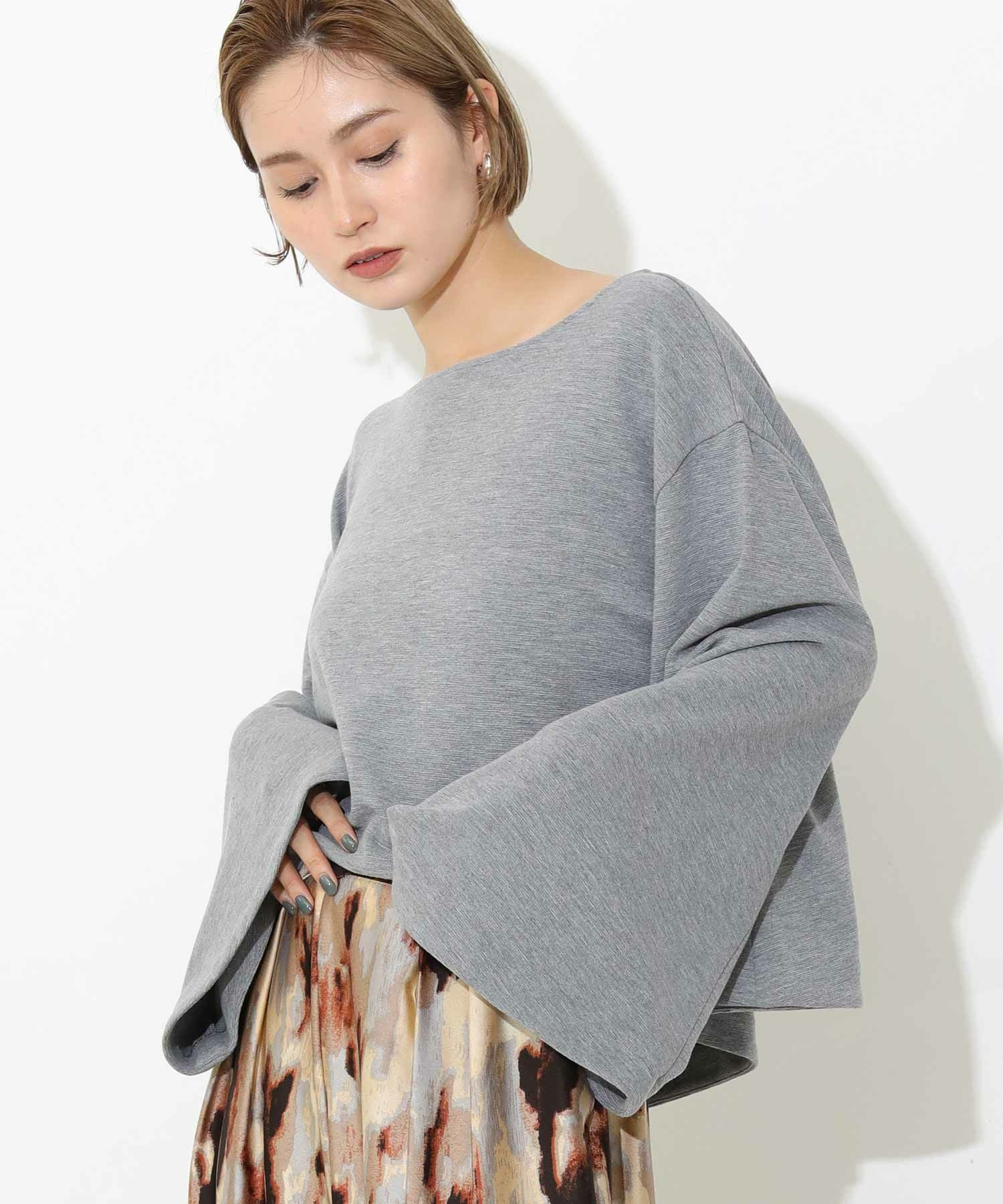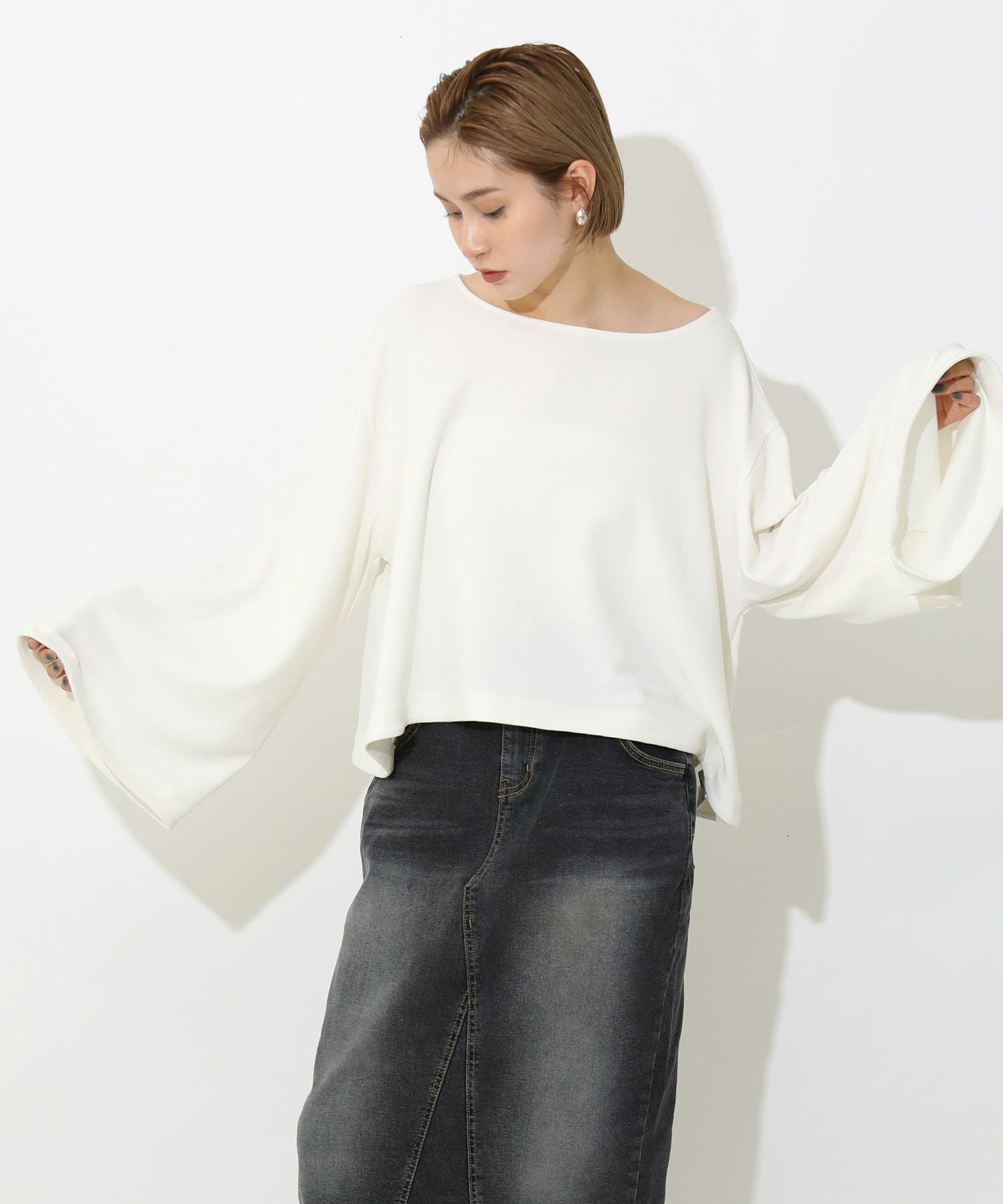 伸縮性が高く、ボディラインを拾わないリラックスしたシルエットがストレスフリーな着心地。広がりのあるフレアスリーブが手元に上品なニュアンスを与えます。デコルテを美しく見せるボートネックでよりエレガントな印象に。カジュアルなパンツを合わせたデイリースタイルから、スカート合わせのレディなスタイリングまで幅広く活躍できる一着です。