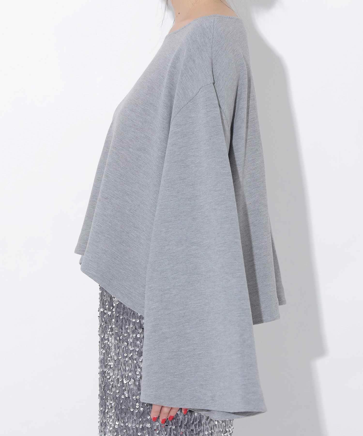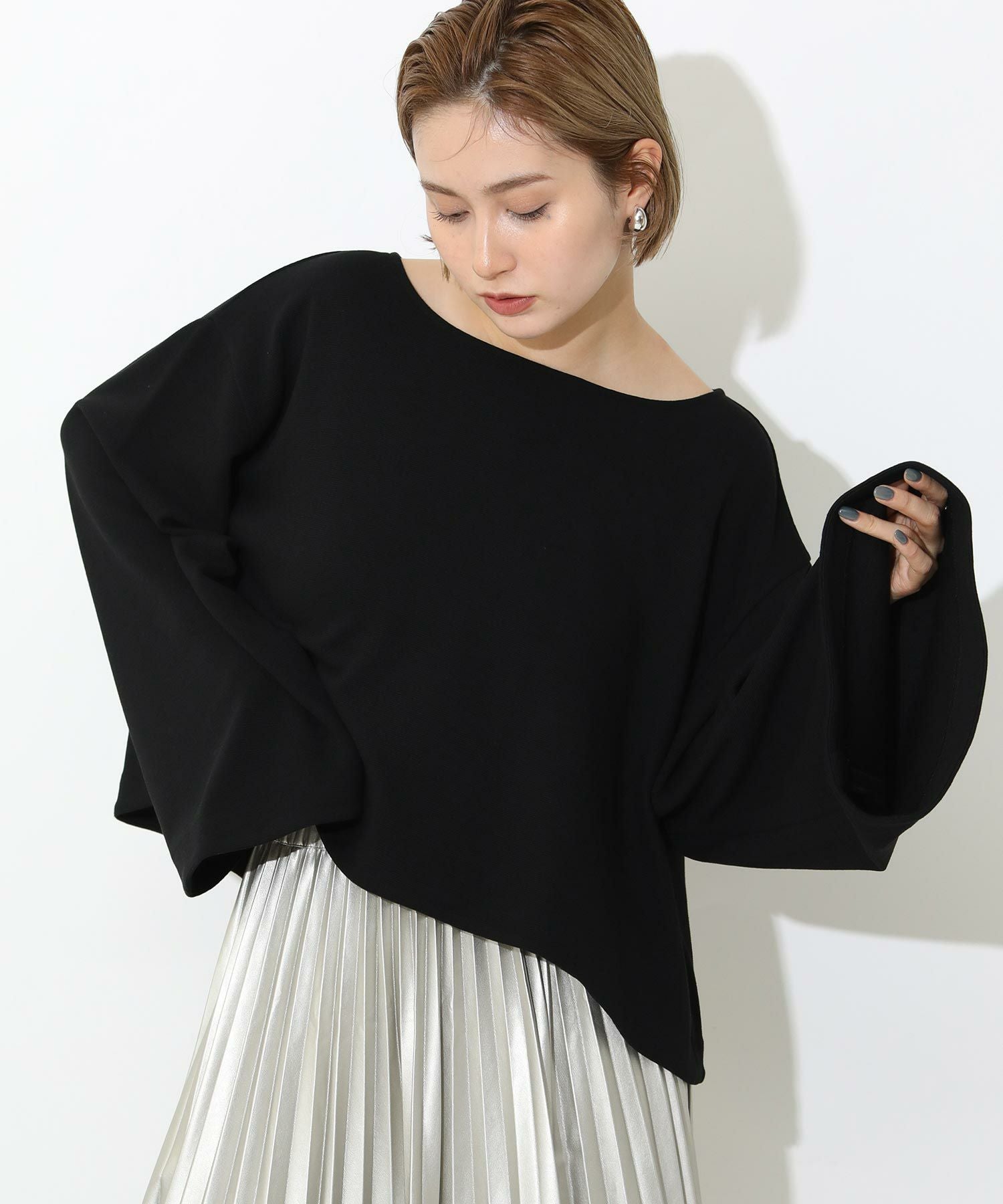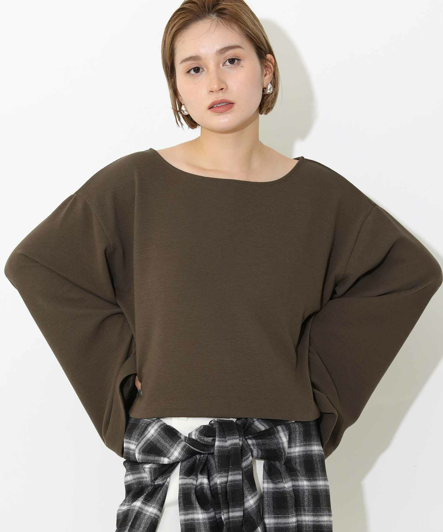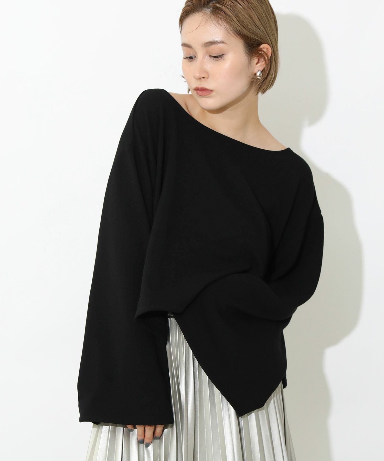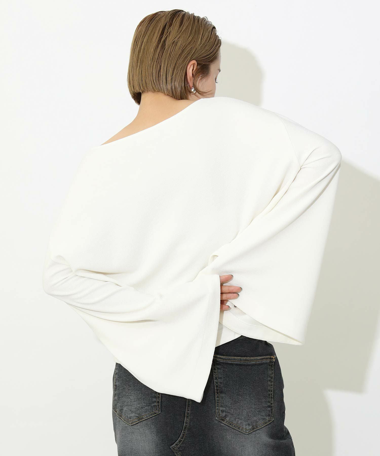 伸縮性が高く、ボディラインを拾わないリラックスしたシルエットがストレスフリーな着心地。広がりのあるフレアスリーブが手元に上品なニュアンスを与えます。デコルテを美しく見せるボートネックでよりエレガントな印象に。カジュアルなパンツを合わせたデイリースタイルから、スカート合わせのレディなスタイリングまで幅広く活躍できる一着です。