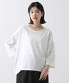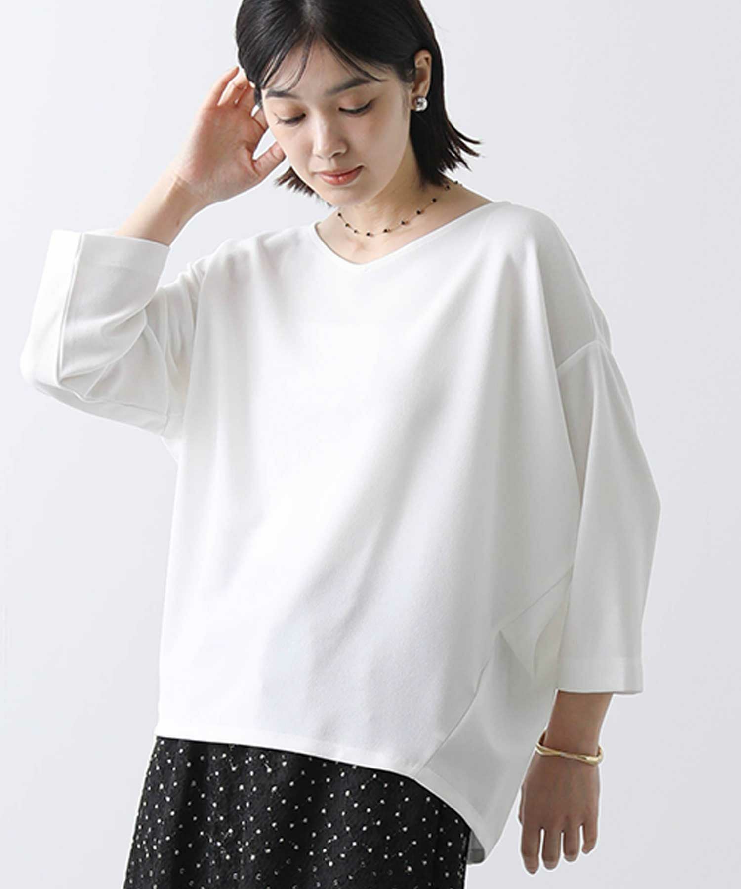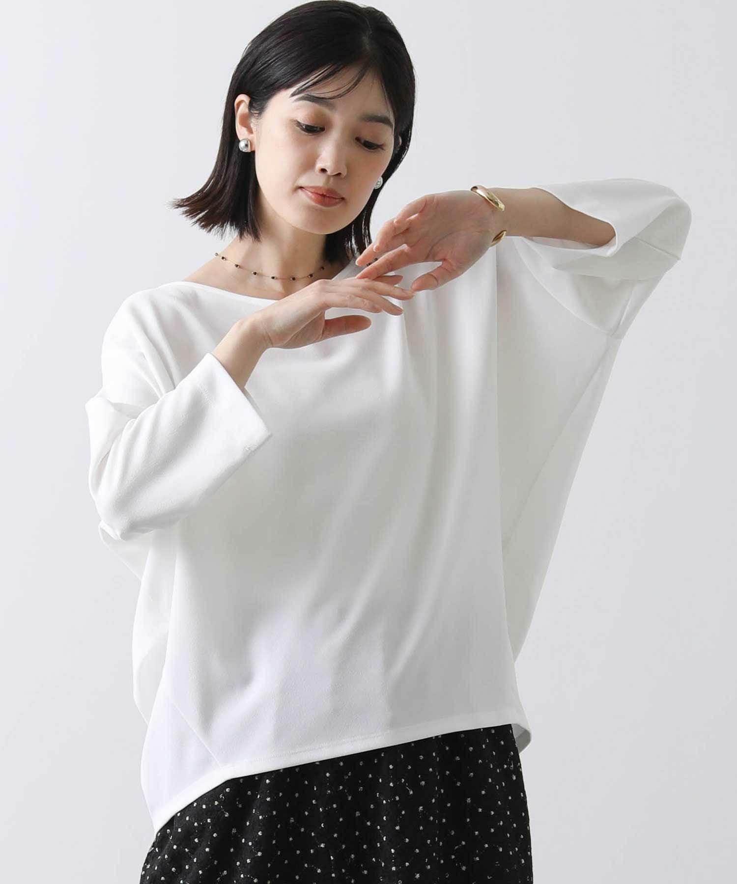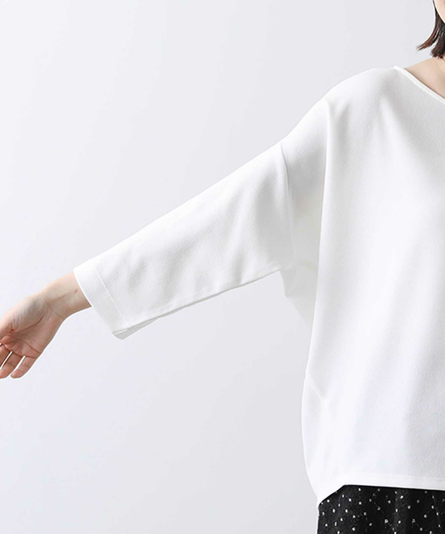 程よい肉感で透けにくく、また、シワになりにくいイージーケアな素材を選びました。スリーブは、バンザイをしたようなパターンで作られており立体的なフォルムがこなれた着こなしに仕上げてくれます。