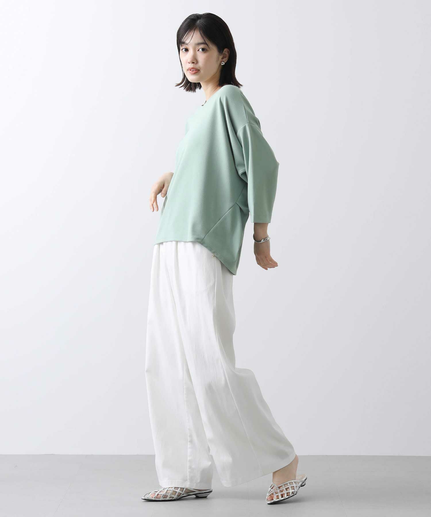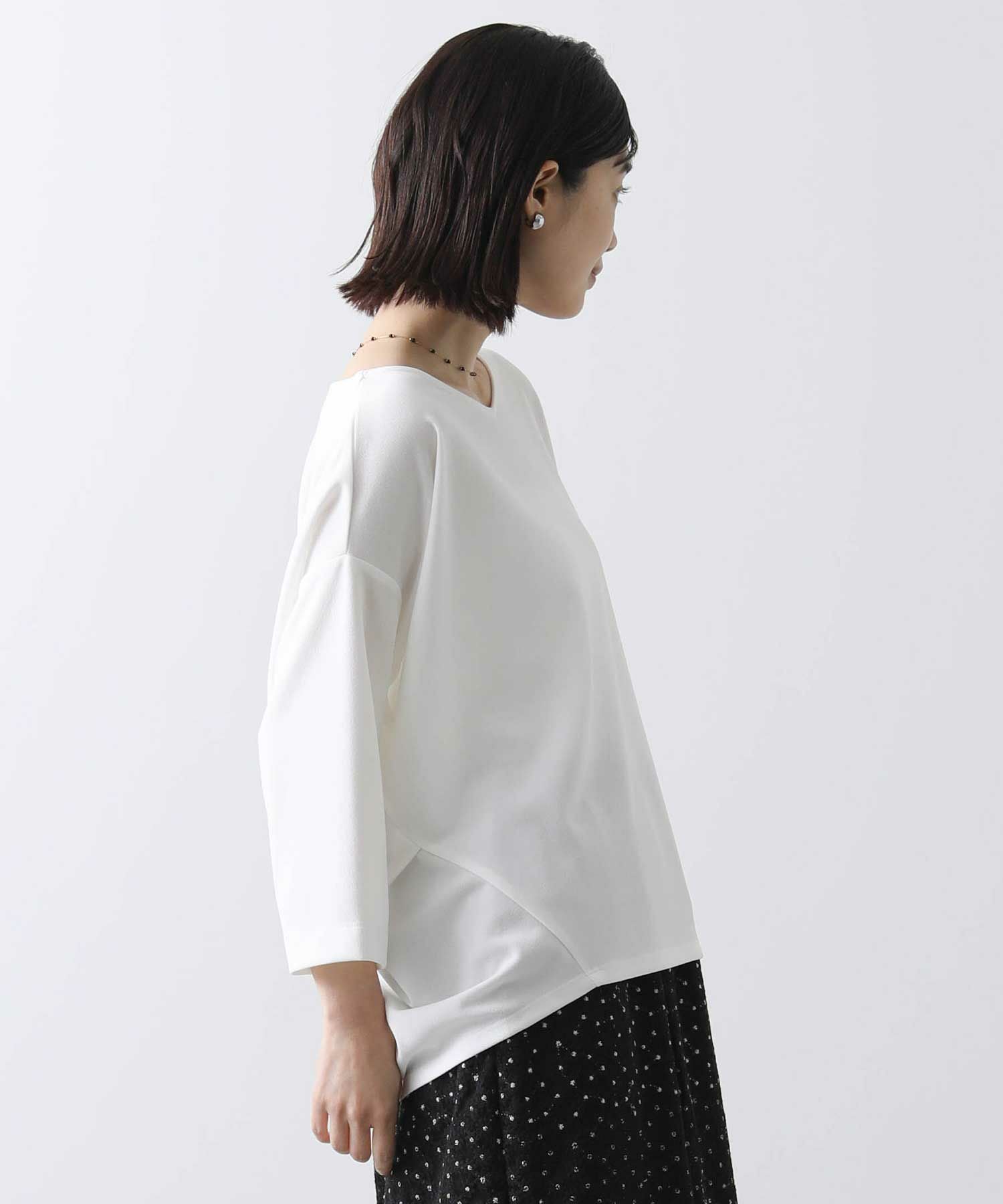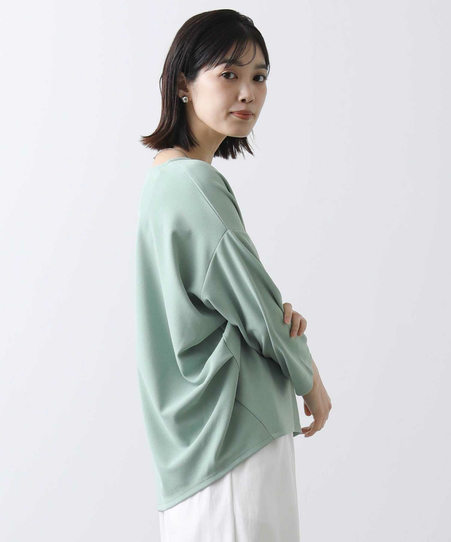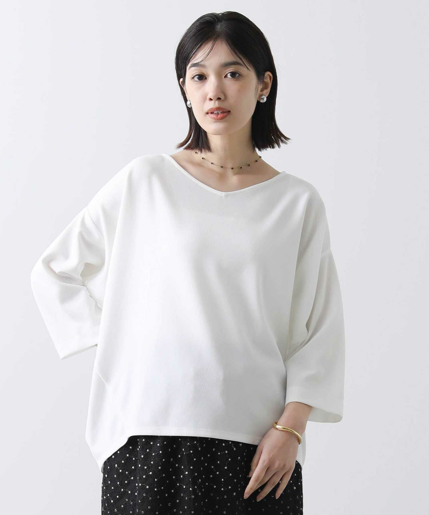程よい肉感で透けにくく、また、シワになりにくいイージーケアな素材を選びました。スリーブは、バンザイをしたようなパターンで作られており立体的なフォルムがこなれた着こなしに仕上げてくれます。