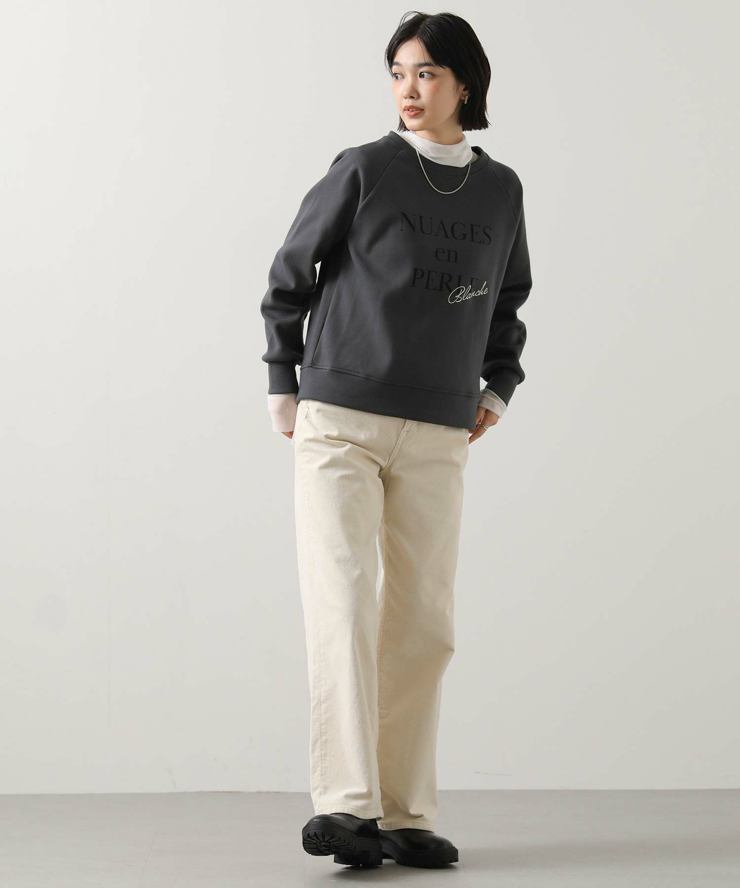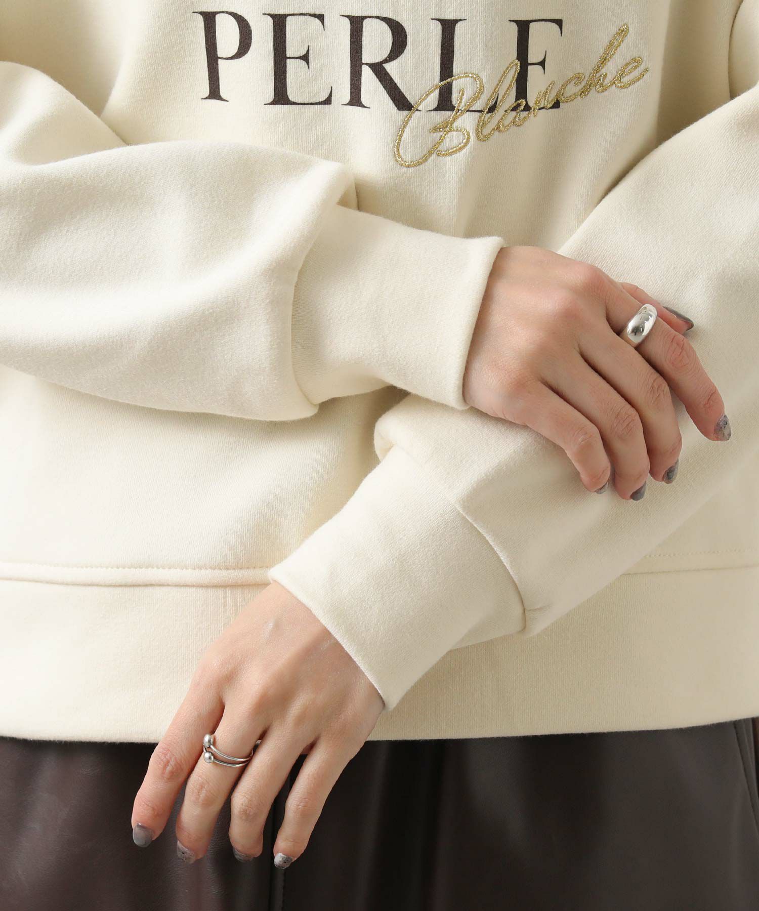 フロントには「NuagesenPerle(Perle(=真珠のような雲」ロゴとフランス語で“白”を意味するフランス語「Blanche」銀糸で刺繍。