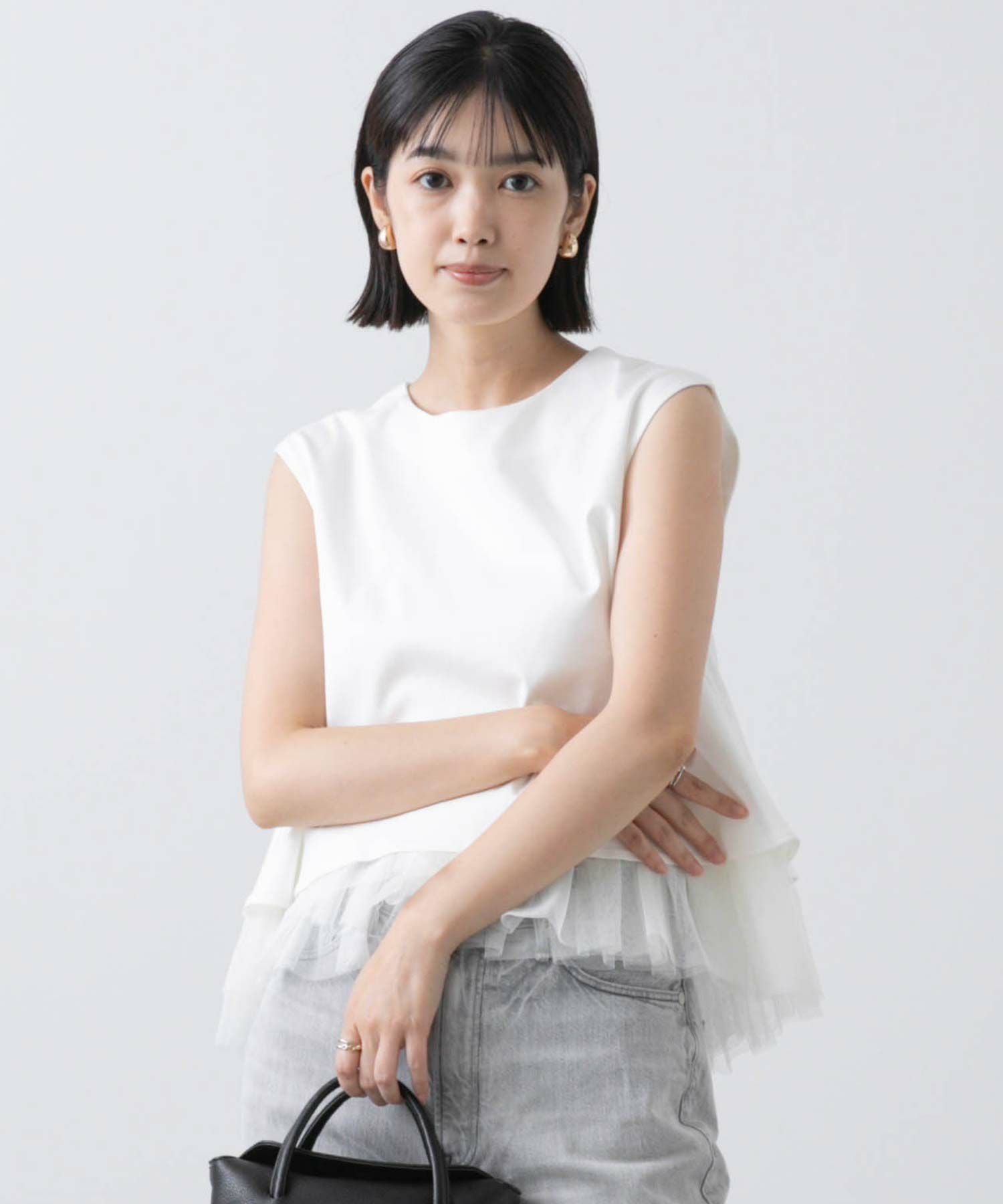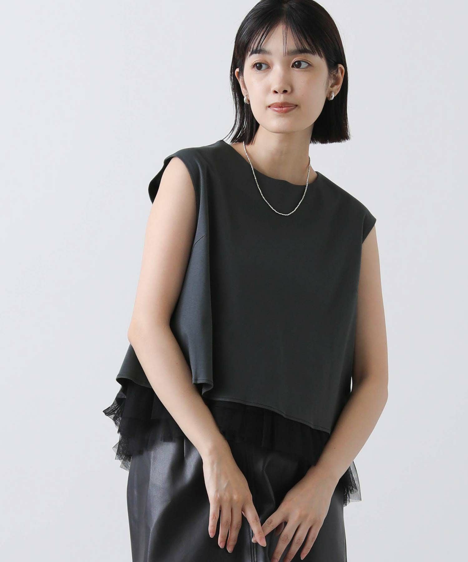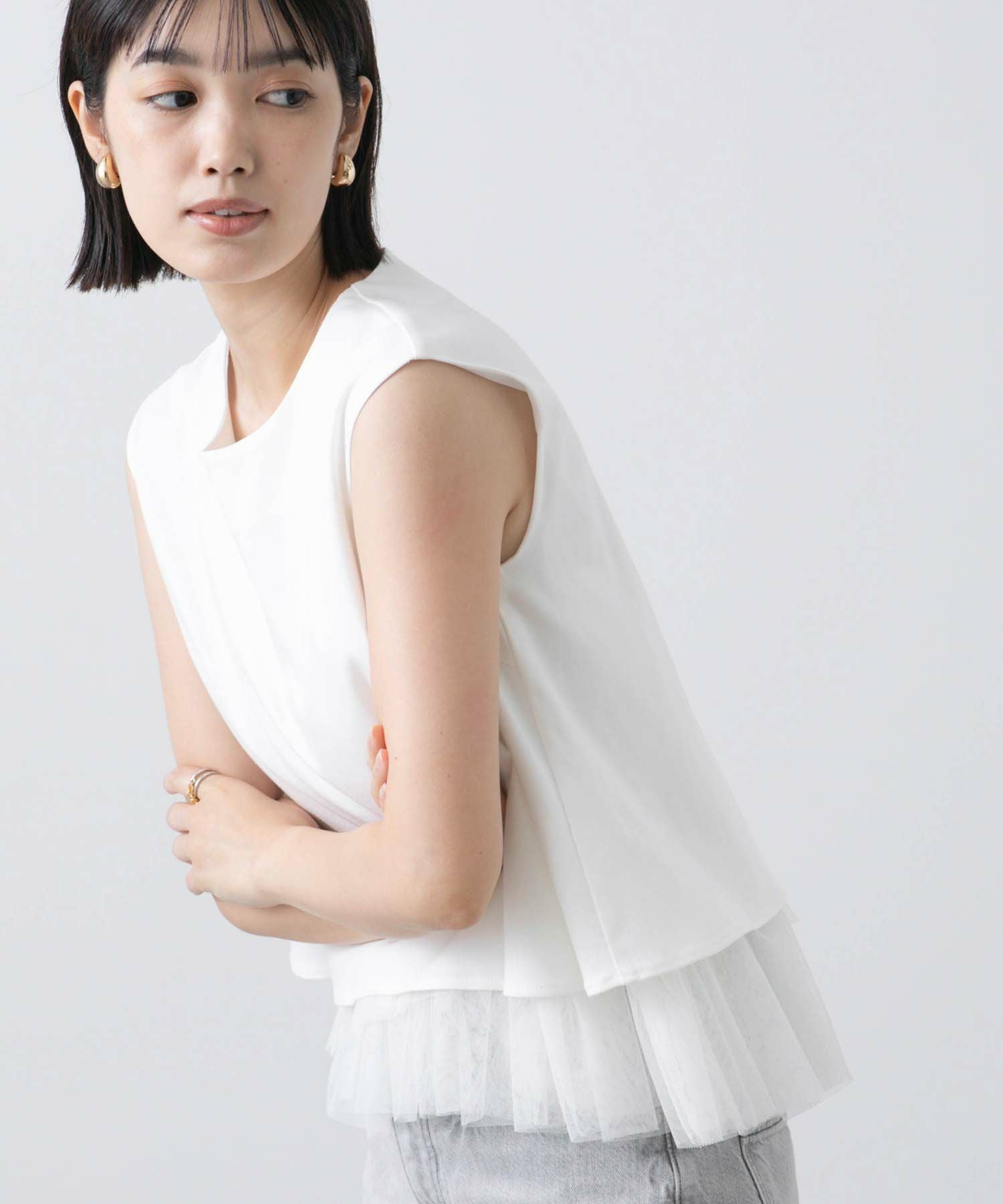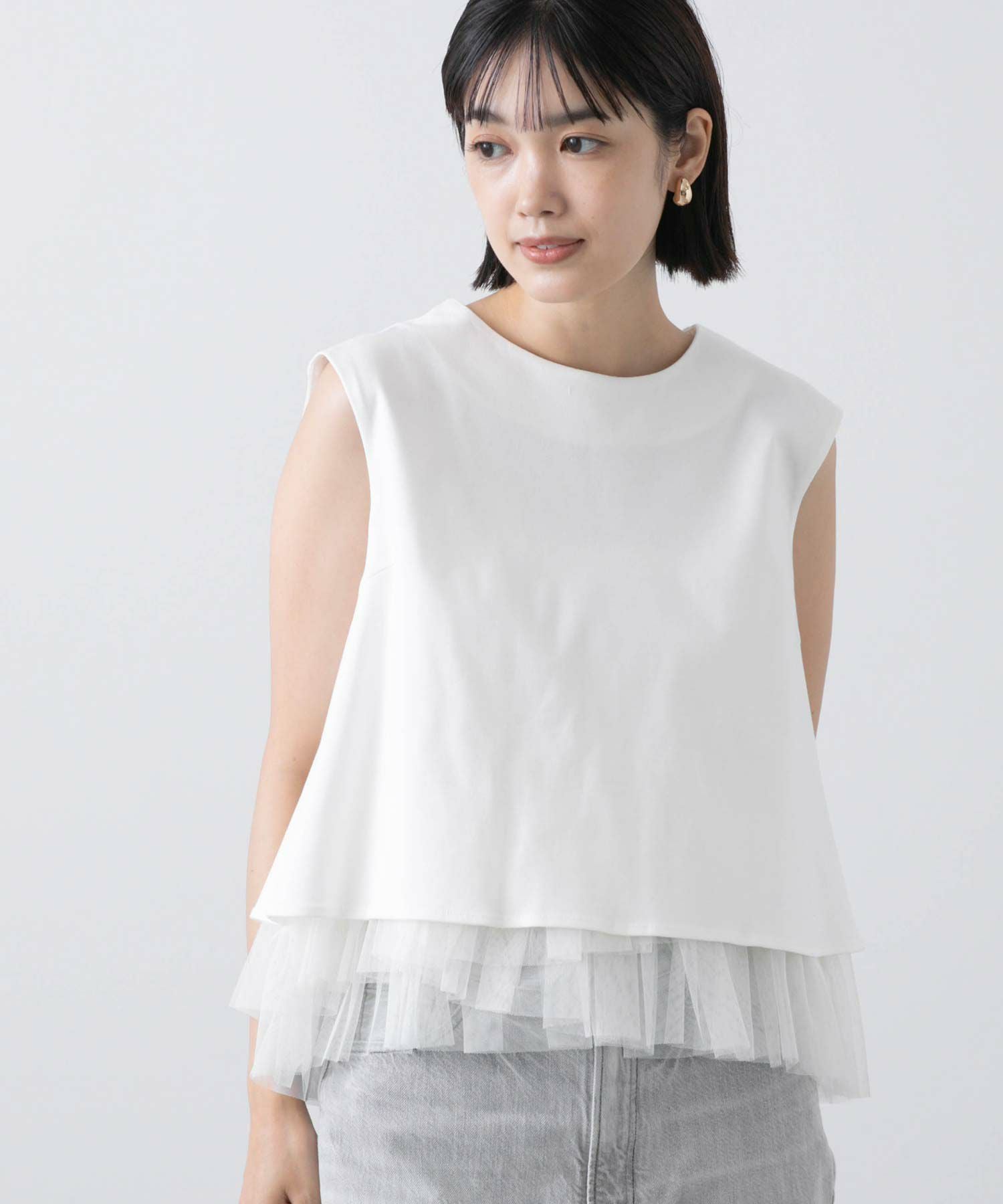 【anana/アナナ】から、きれい見えするTシャツ生地に裾からチュールレースがのぞくドッキングプルオーバーをセレクト。