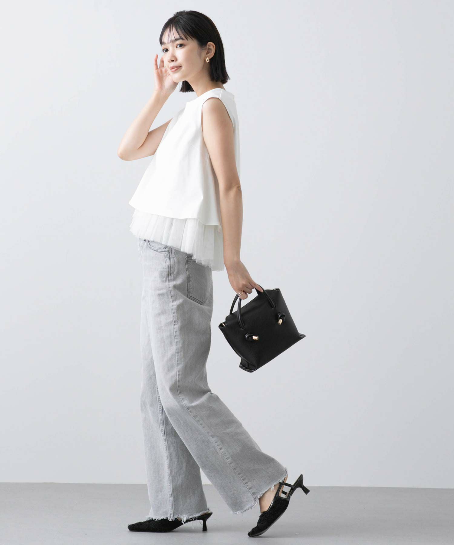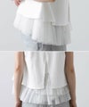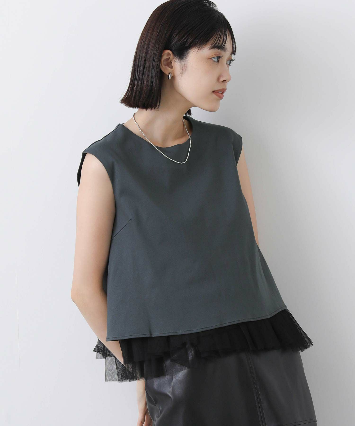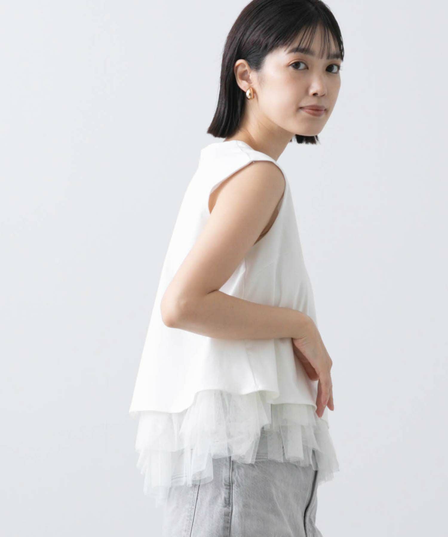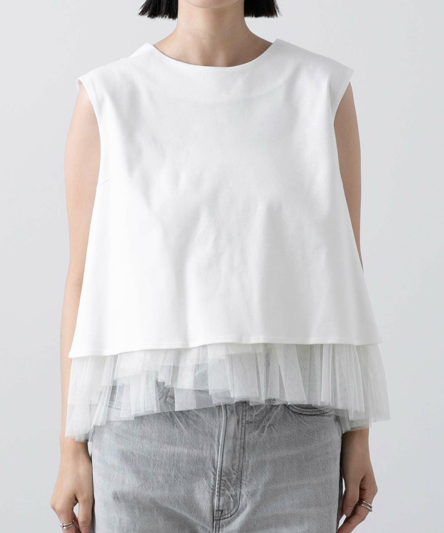 【anana/アナナ】から、きれい見えするTシャツ生地に裾からチュールレースがのぞくドッキングプルオーバーをセレクト。