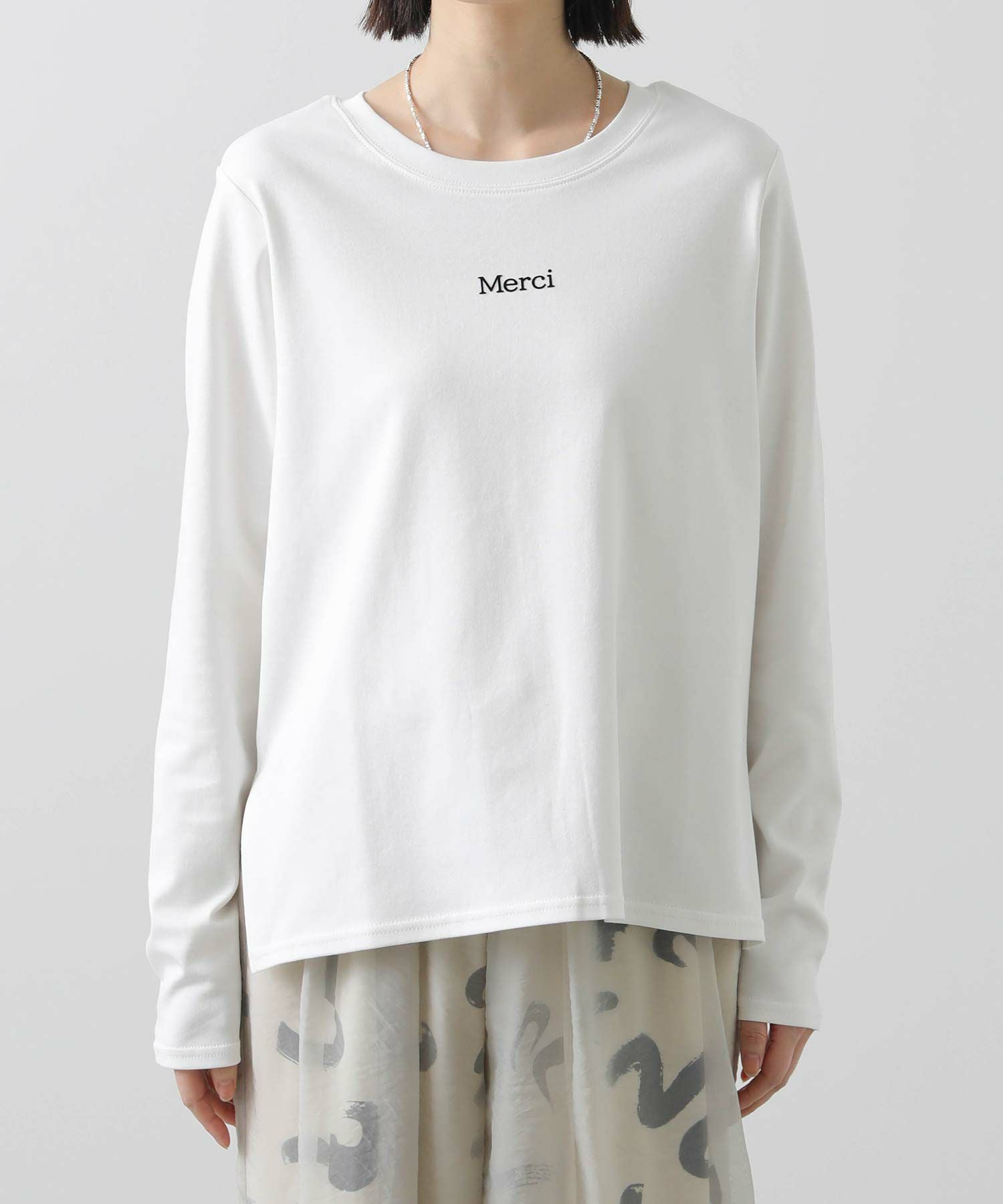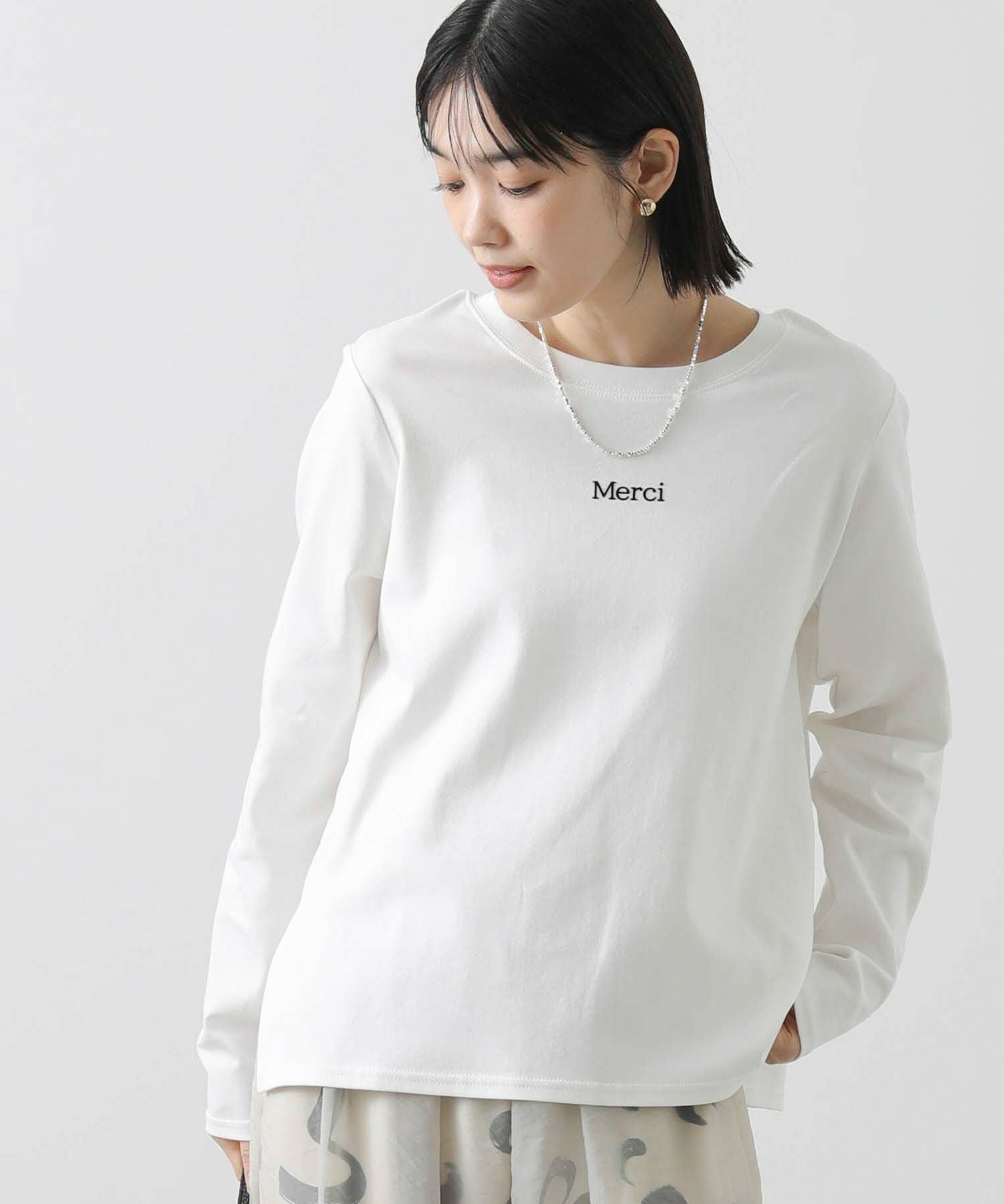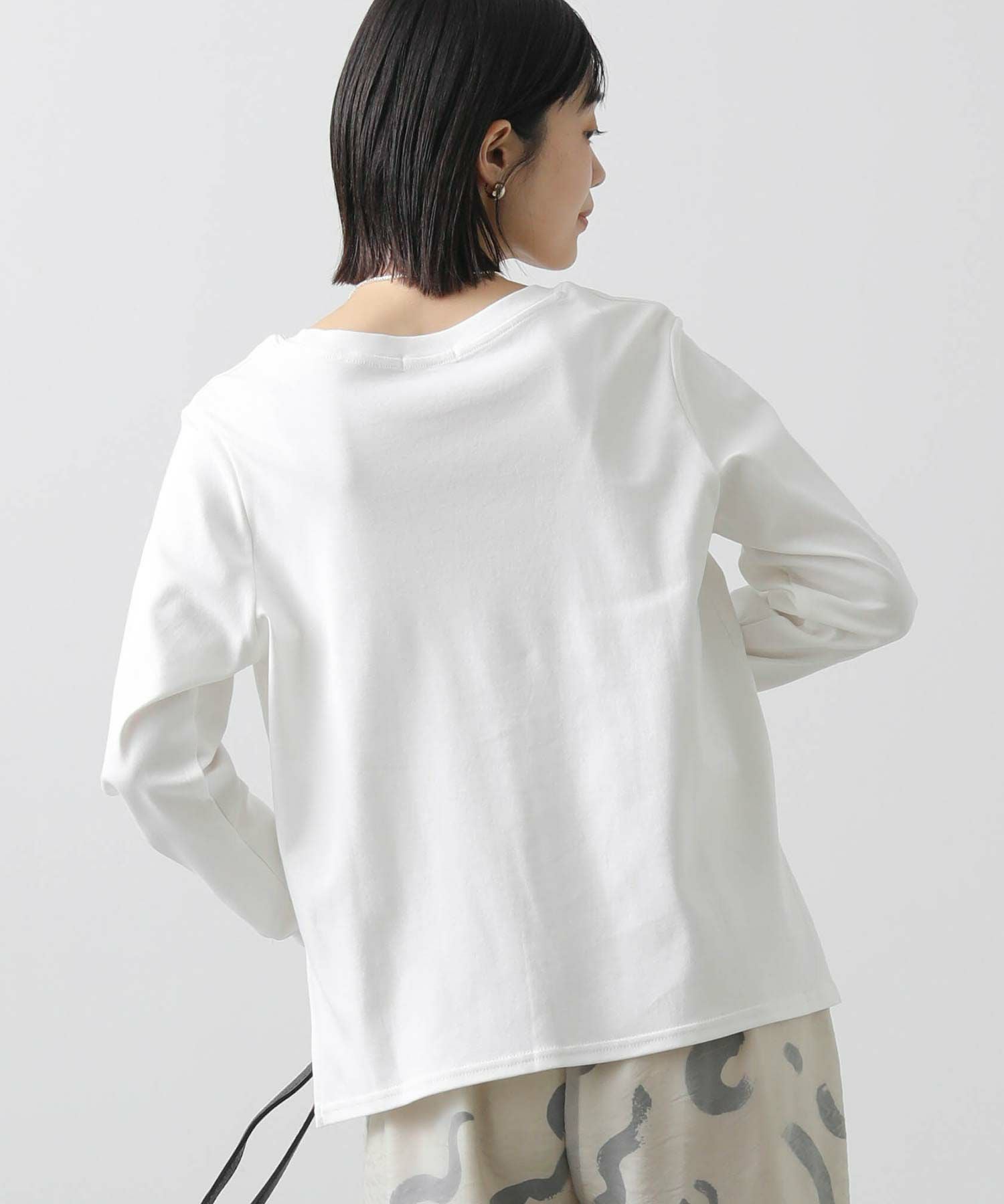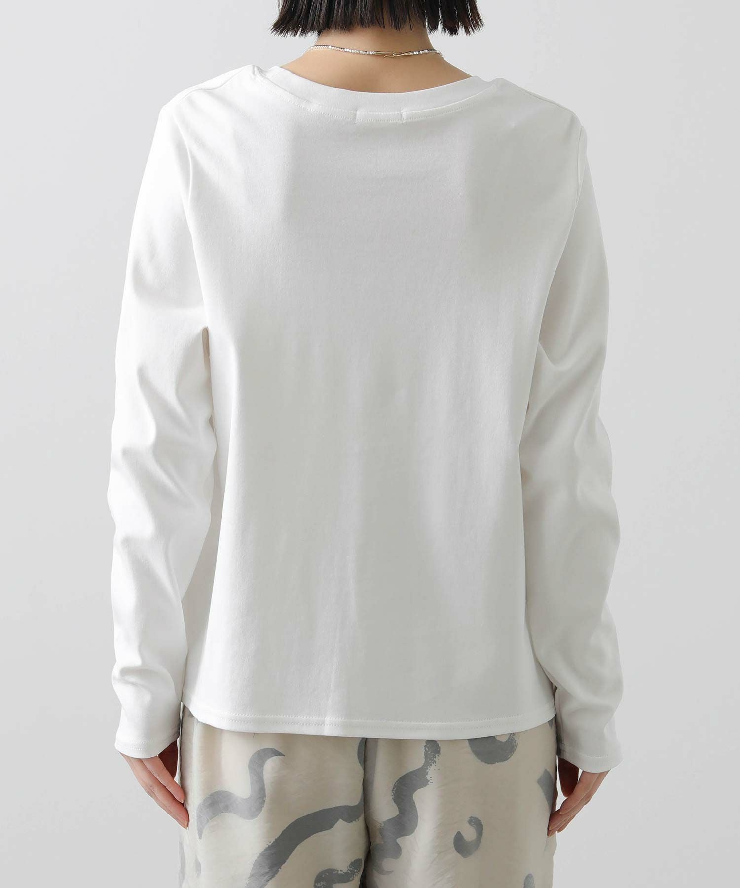 デイリーに活躍するロゴプリントのロンT。表面感のあるフロッキー加工を施した小さなロゴが、きれいめな印象を与えるロンTです。