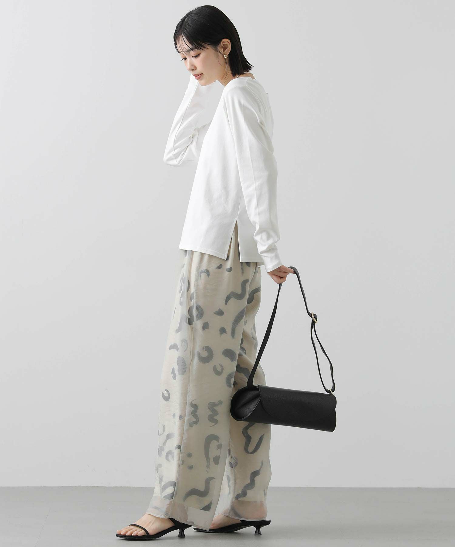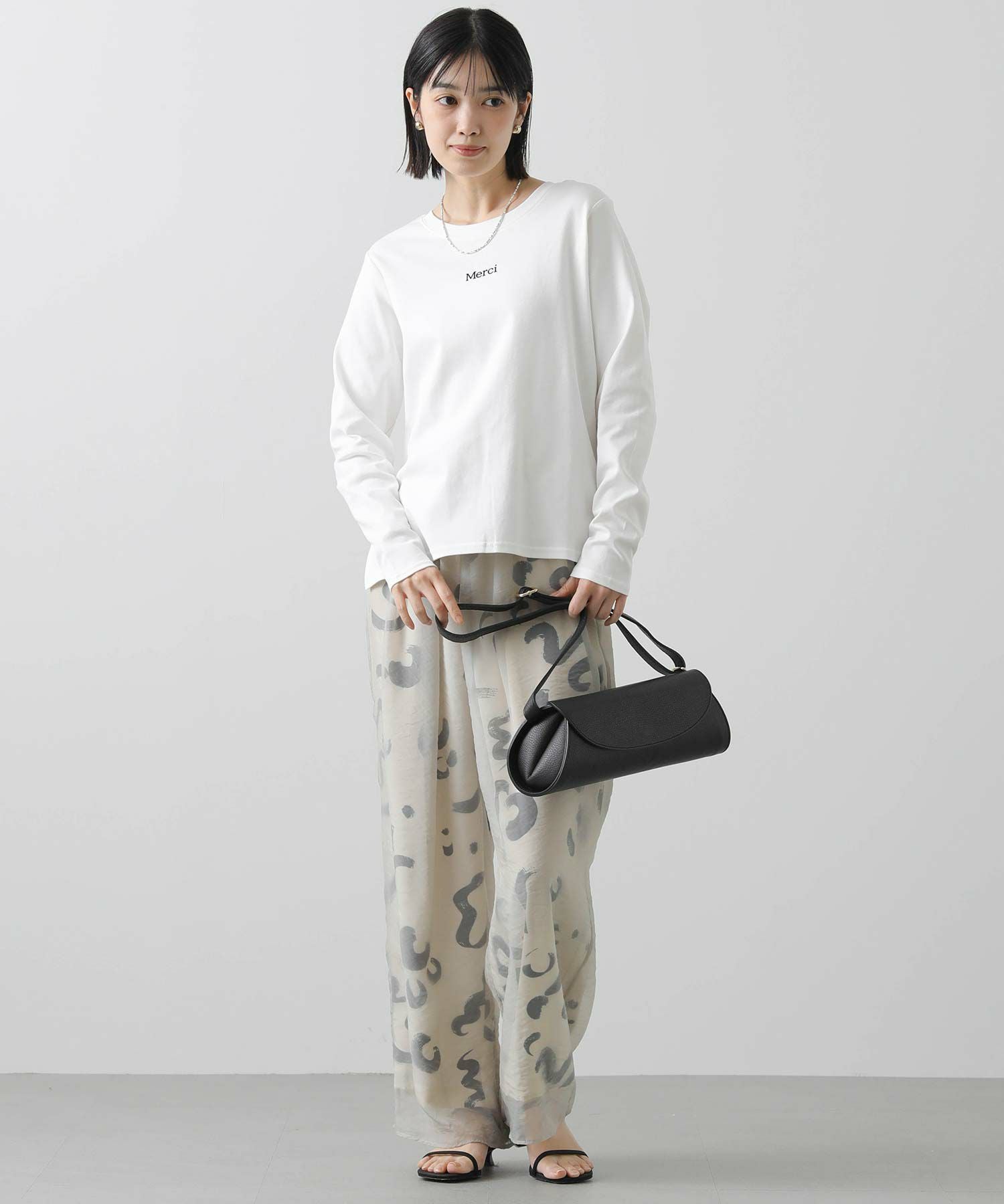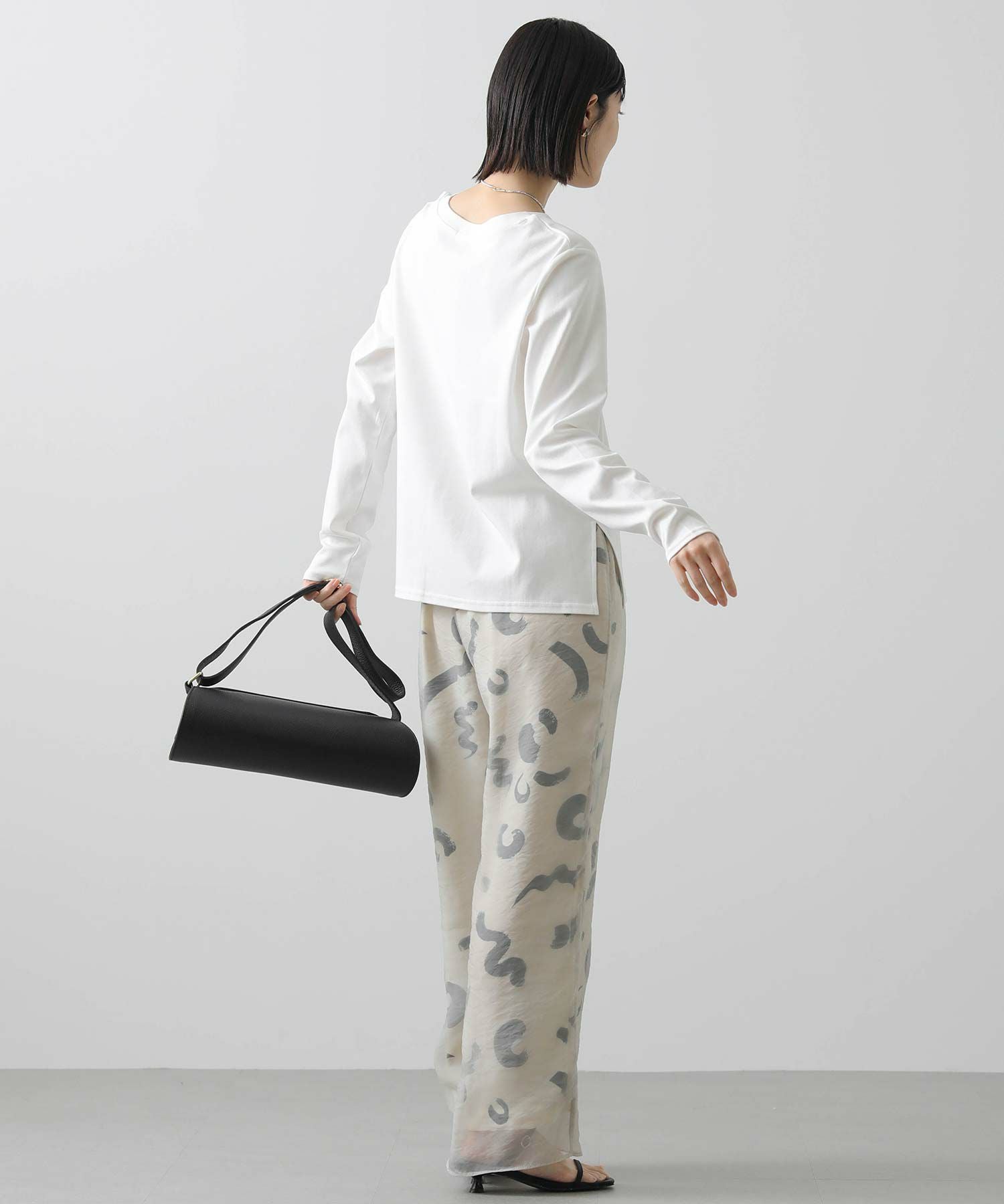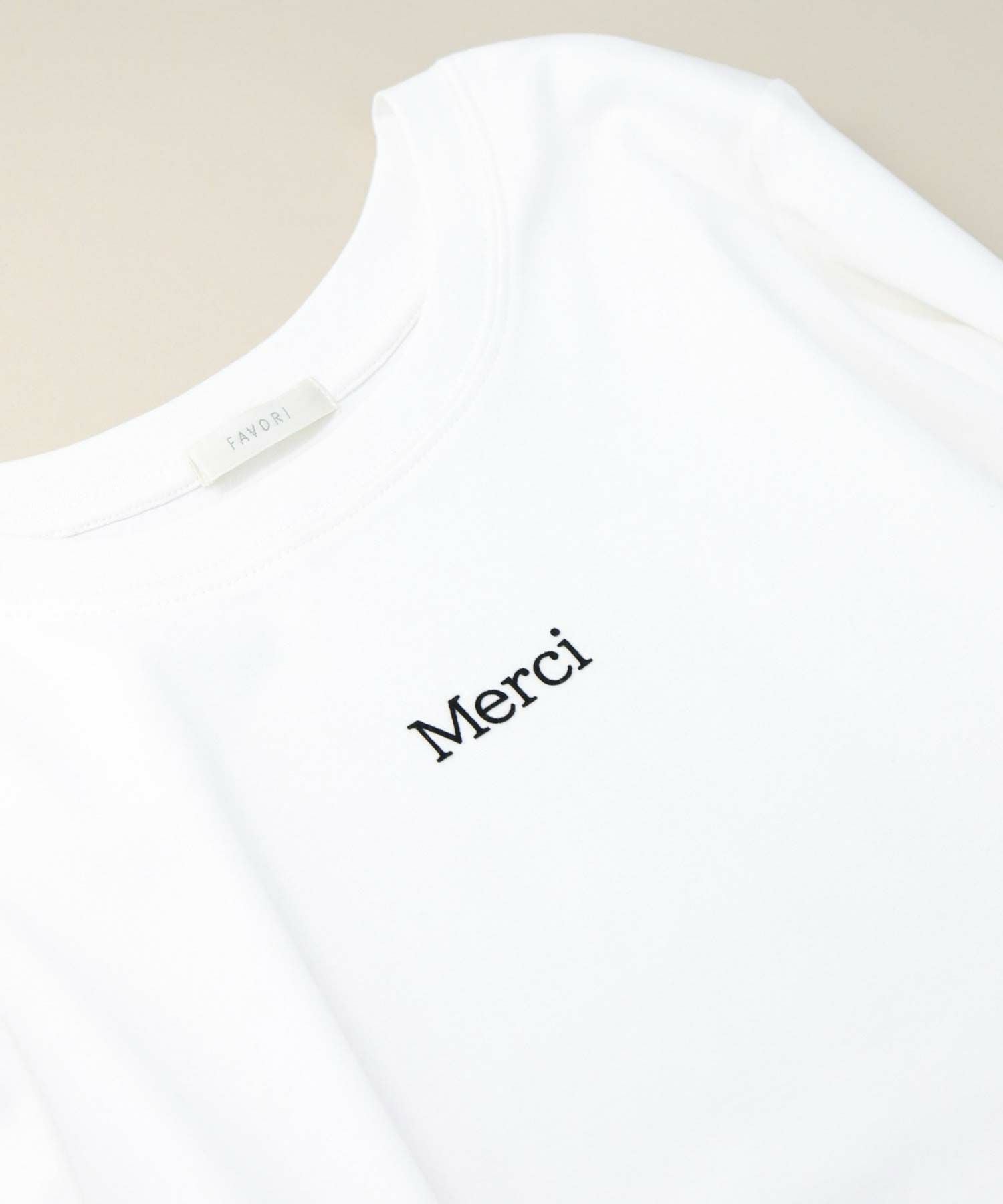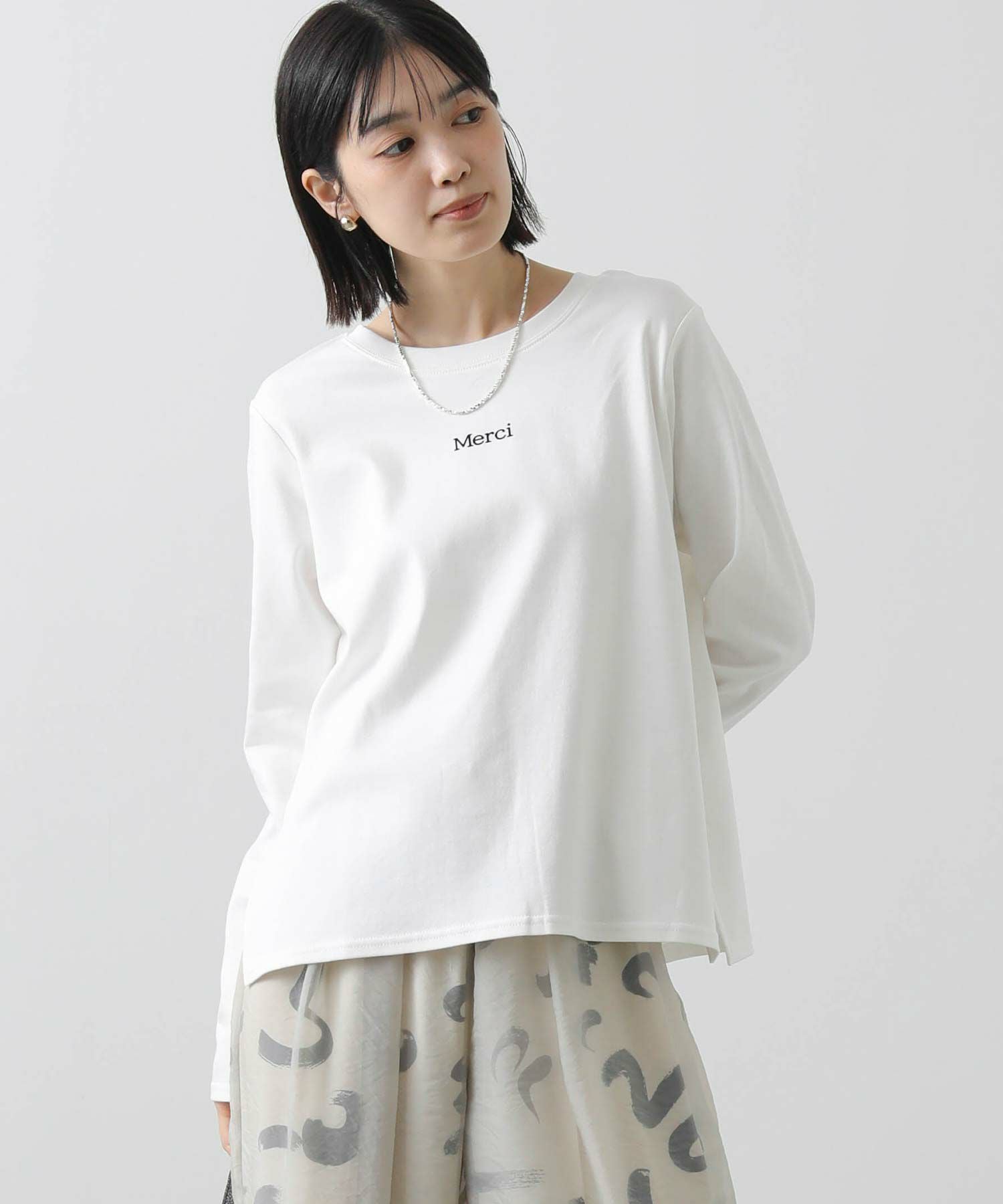 デイリーに活躍するロゴプリントのロンT。表面感のあるフロッキー加工を施した小さなロゴが、きれいめな印象を与えるロンTです。