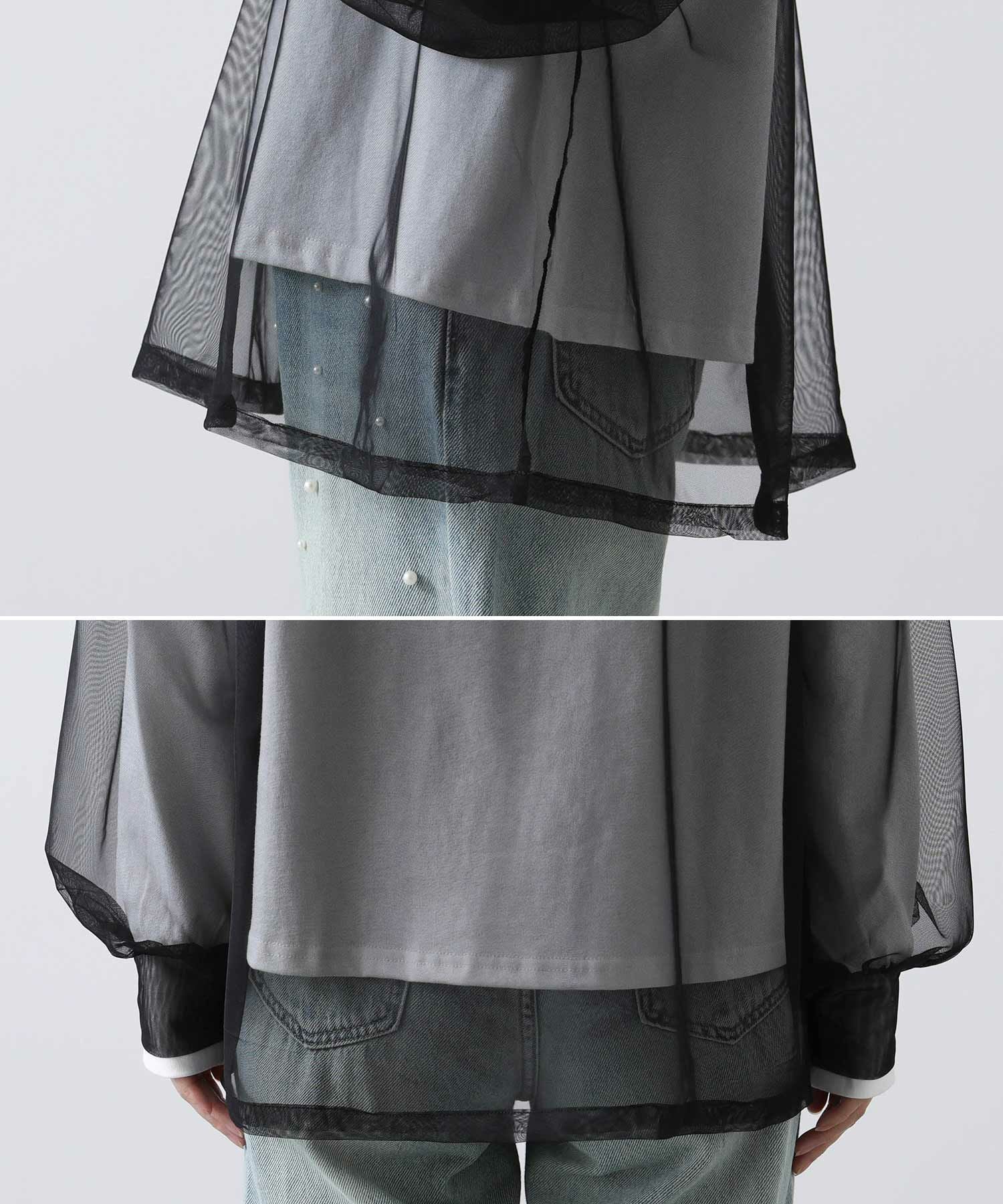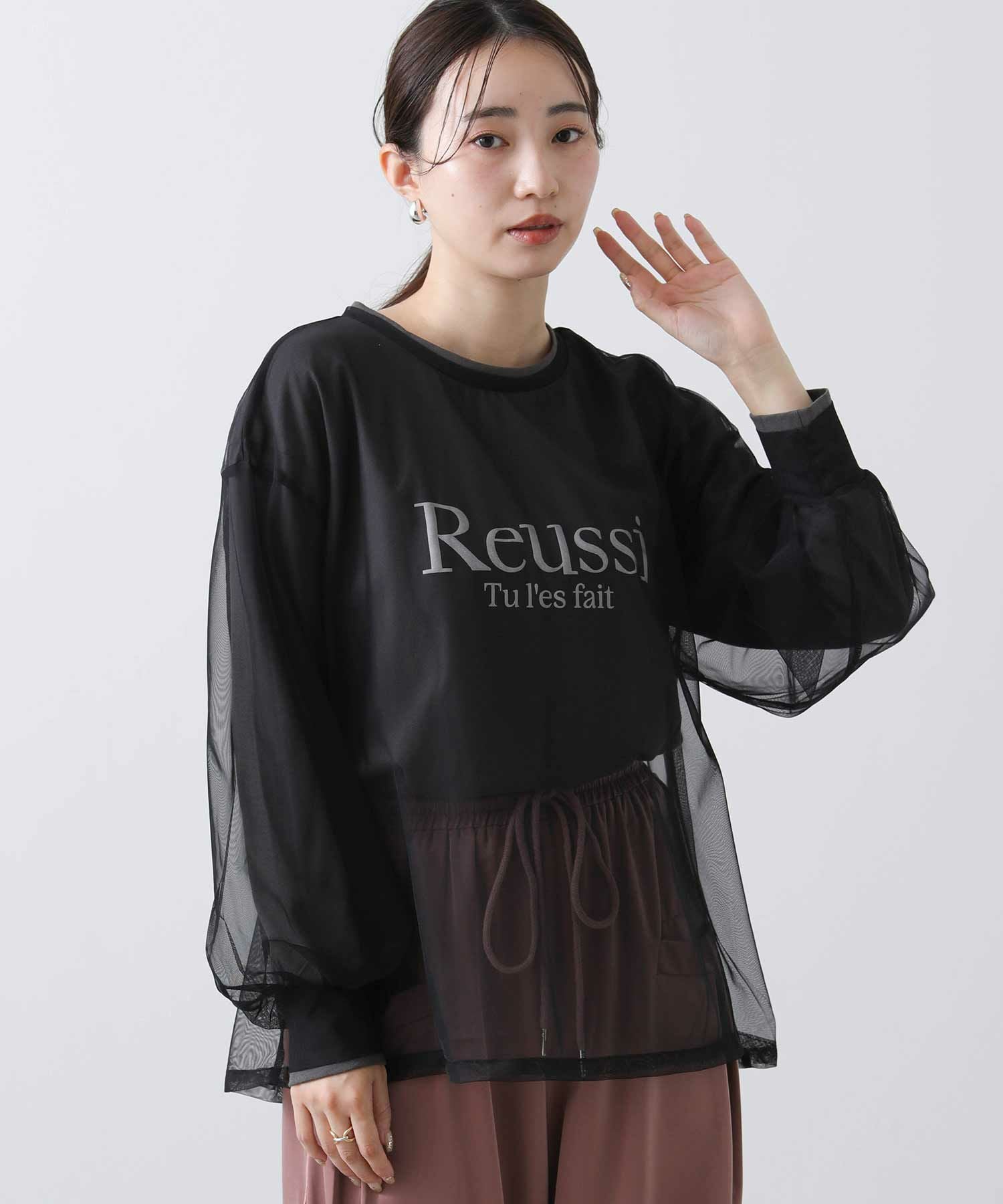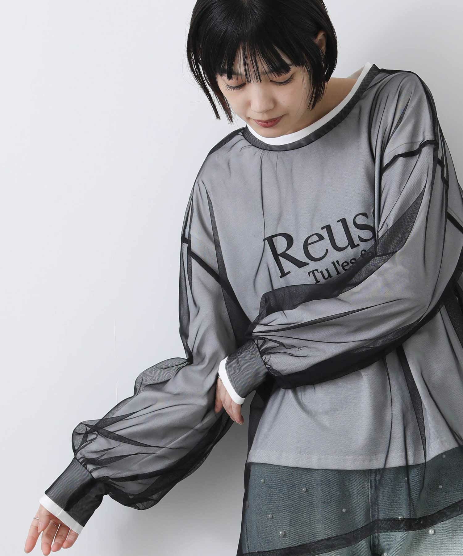 ロゴTシャツにチュールをレイヤードしたトップス。