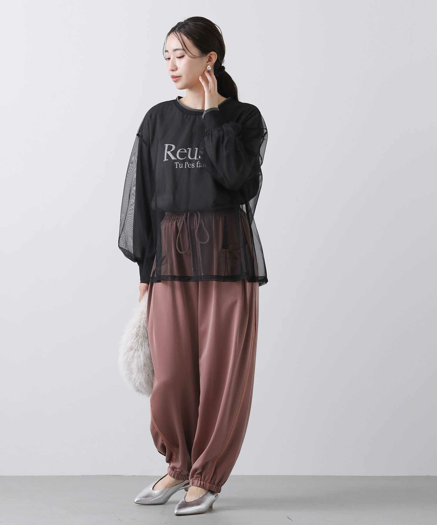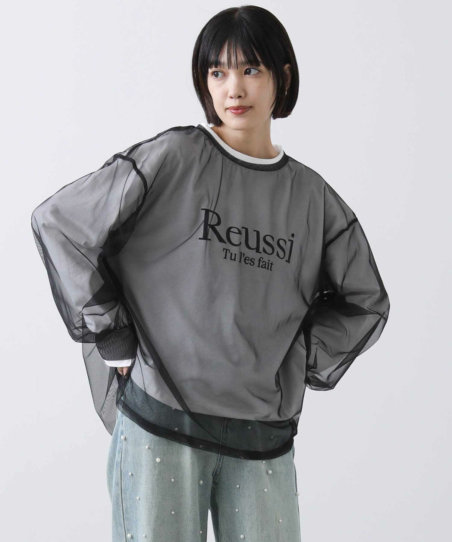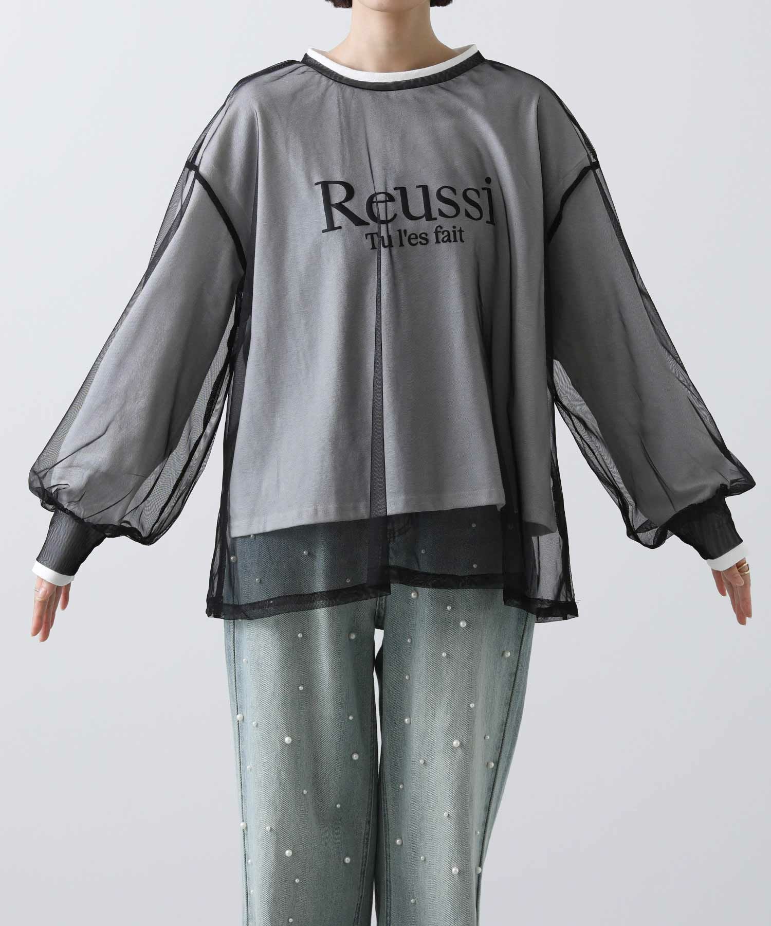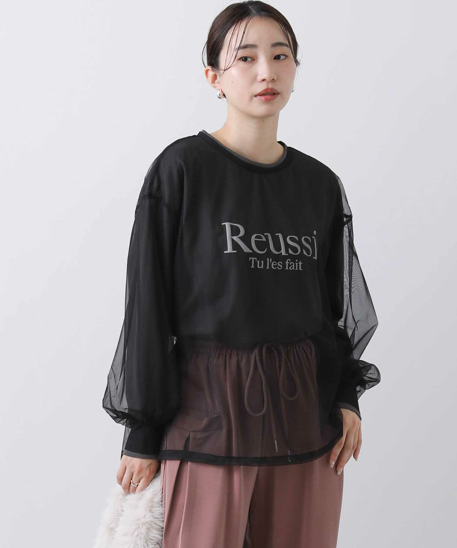 ロゴTシャツにチュールをレイヤードしたトップス。