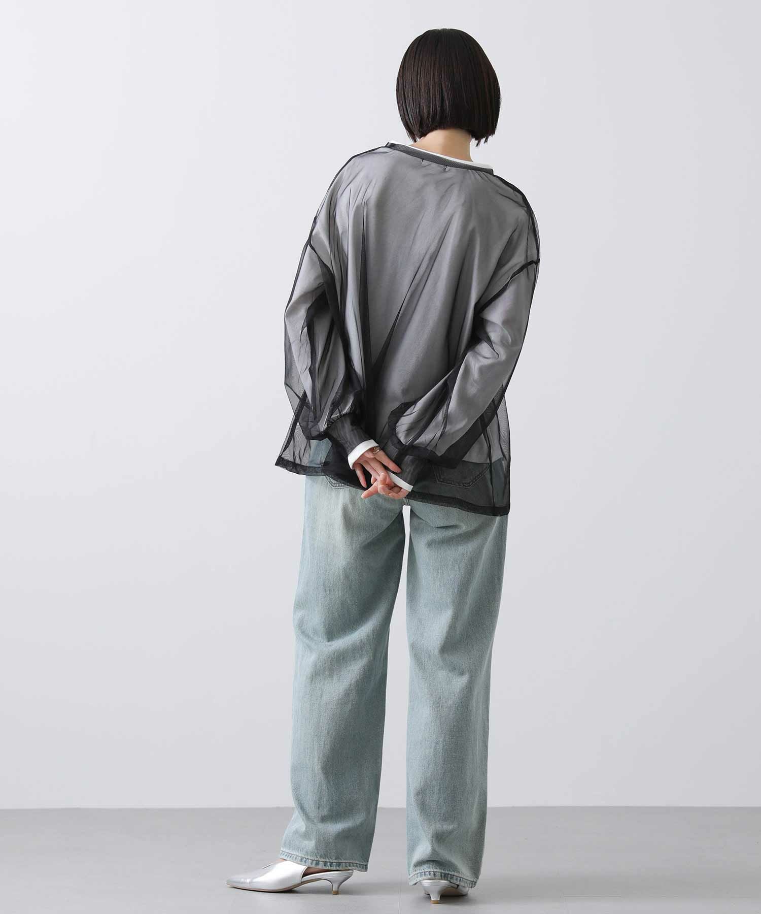中のTシャツのみボトムインで、裾の透け感を楽しむ着こなしもオススメです。