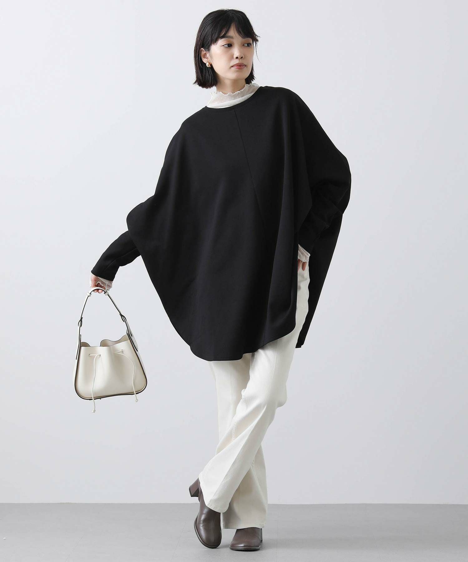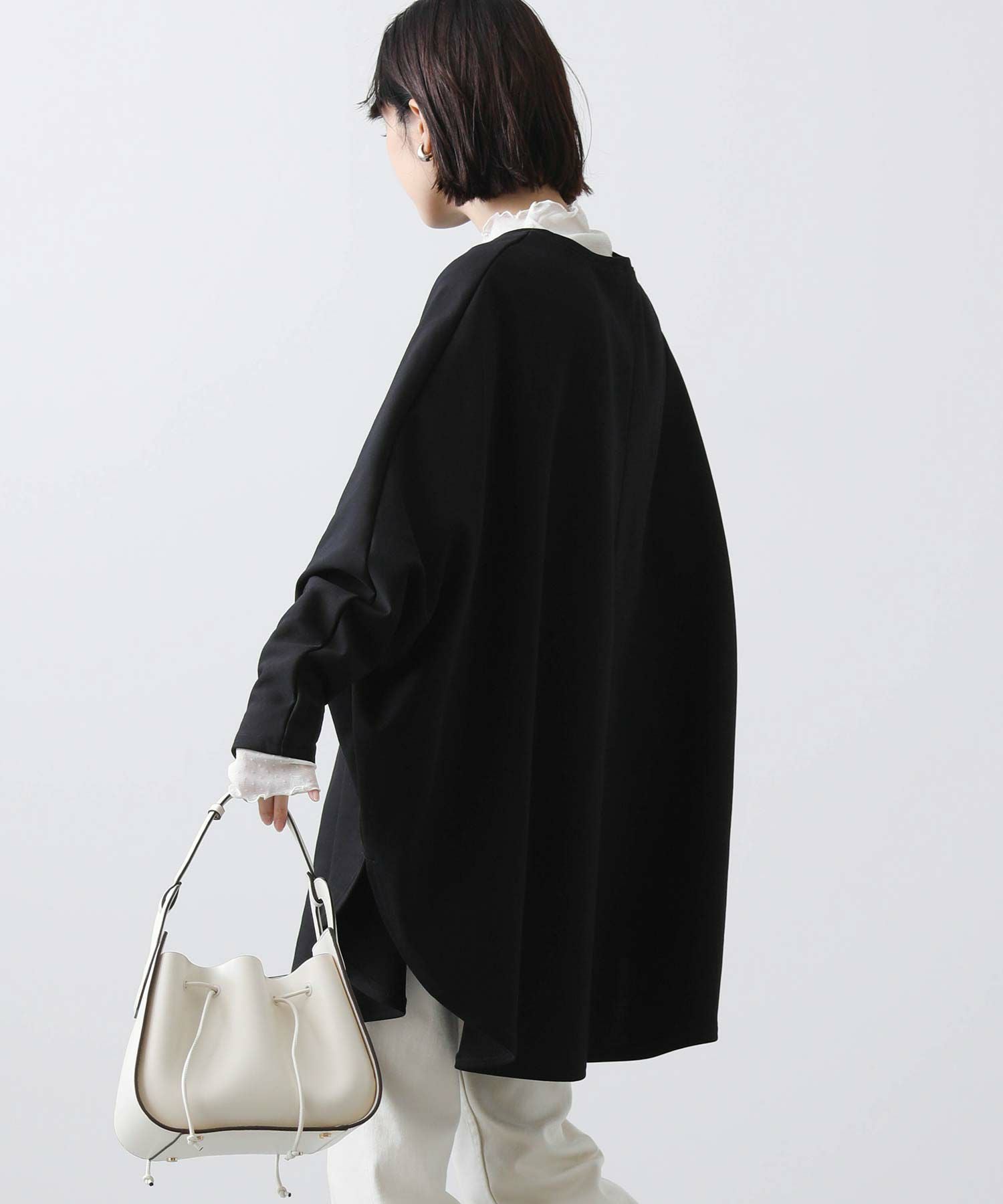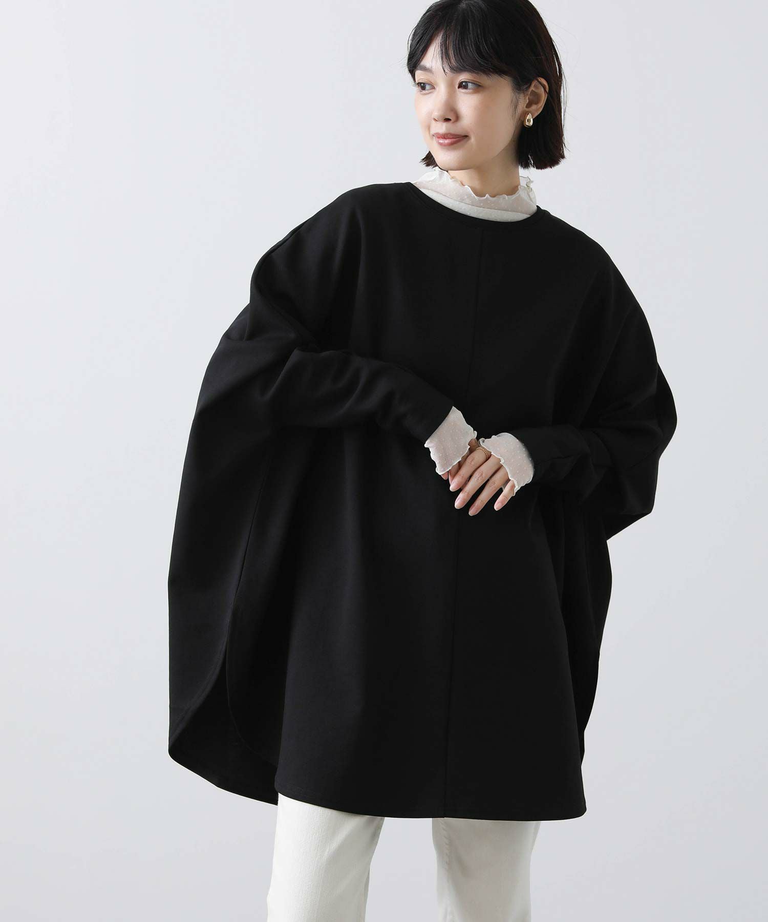 ポンチョを着ているようなワイドなシルエットで、身体を包みこんでくれます。