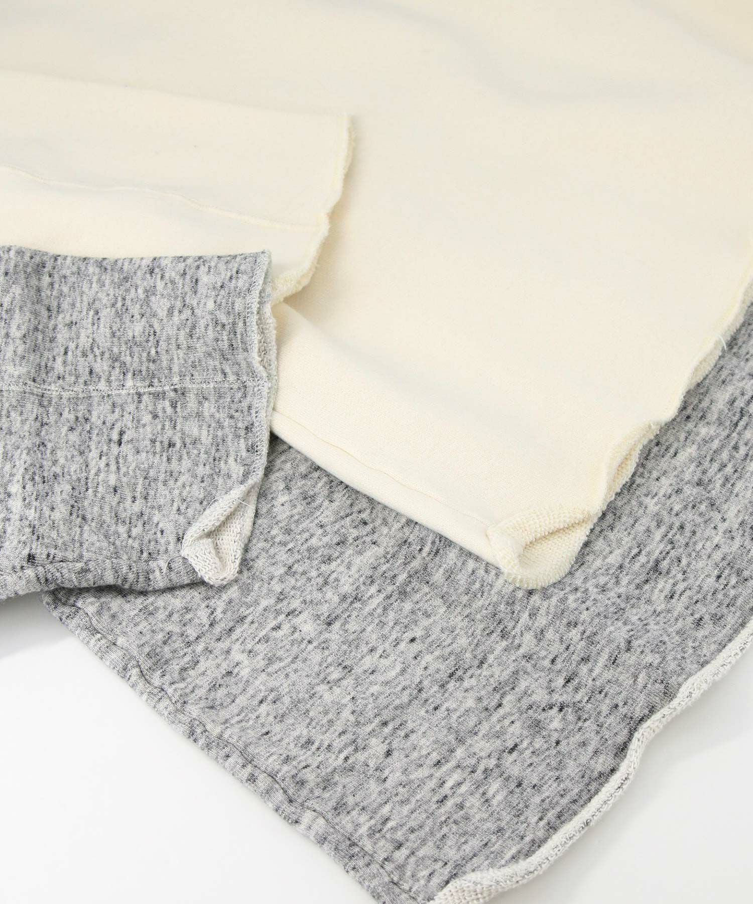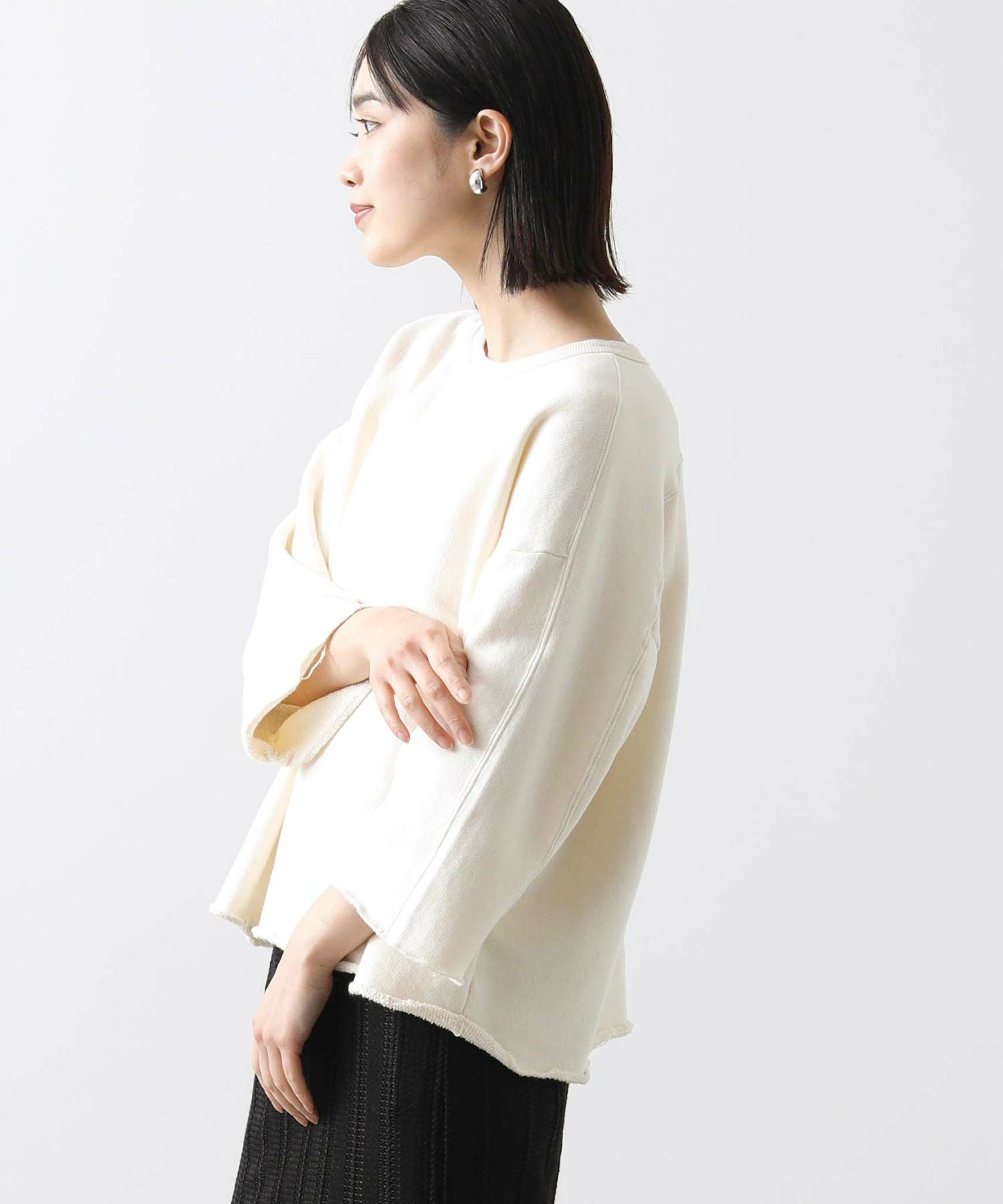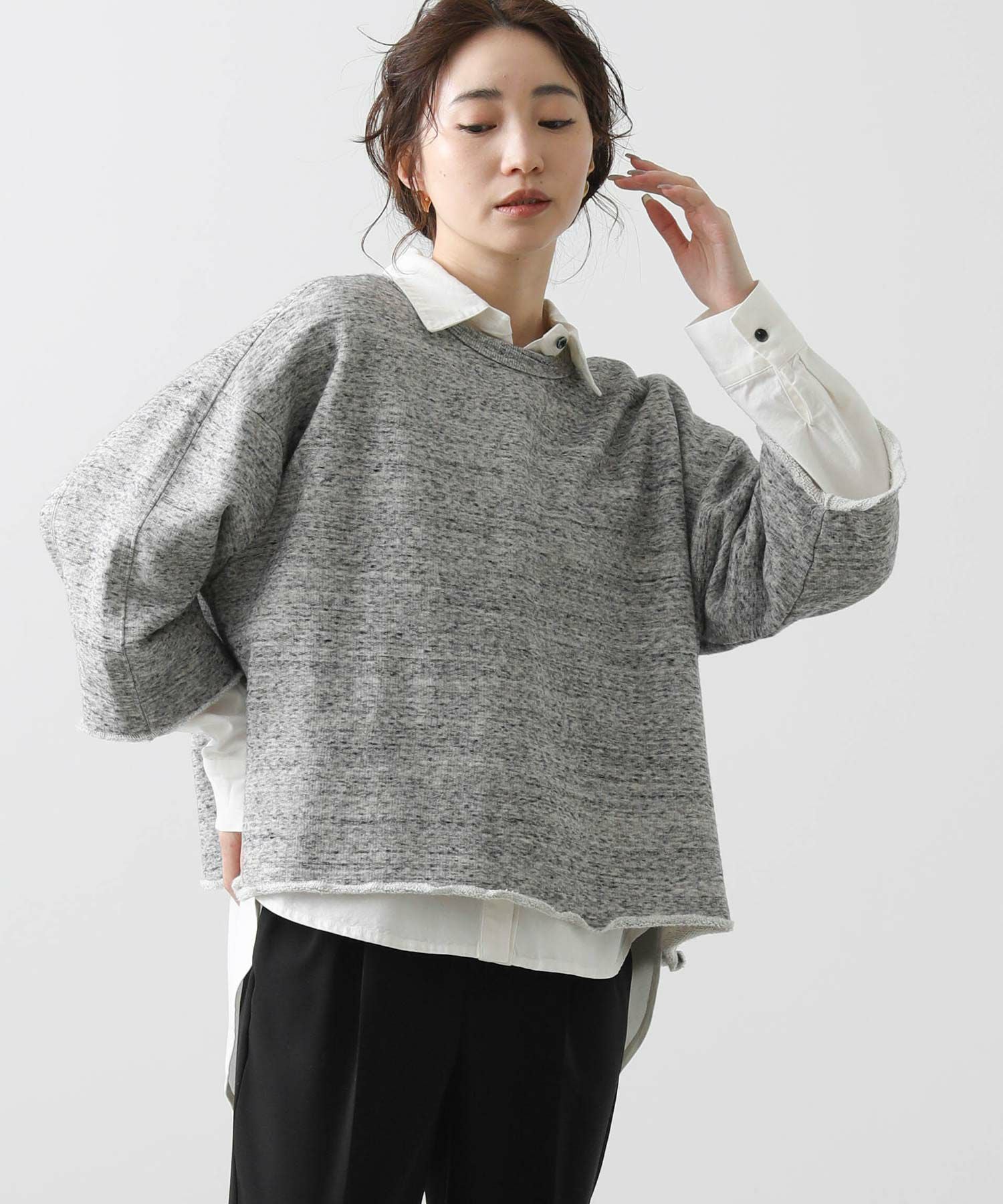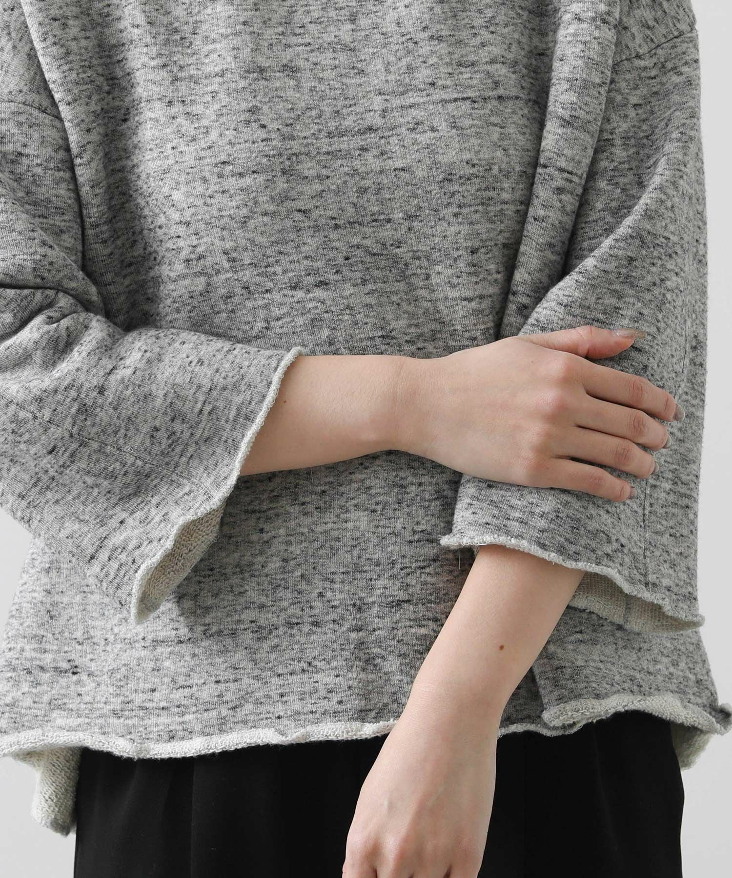 リヨセル・コットンの粗挽き杢を表面に使用した裏毛を使用。ざっくり感のあるワイドスウェットです。